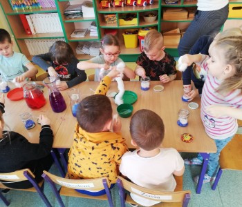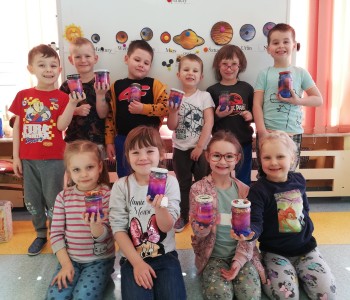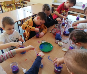 Podczas zajęć kreatywnych dzieci eksperymentowały z barwnikami oraz wykonały własnoręczny "kosmos w słoiku". Poza barwieniem wody, dzieci szykowały warstwy waty, które posypywały brokatem i podlewały kolorowa wodą. Mieniący się brokat świeci niczym gwiazdy.