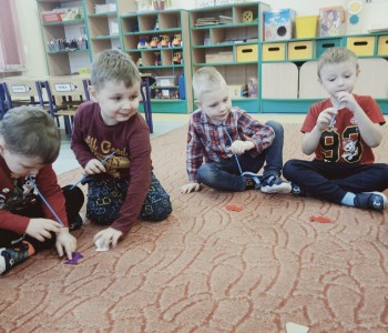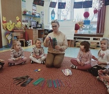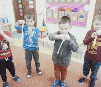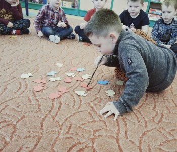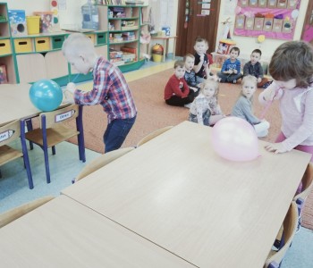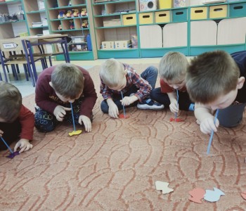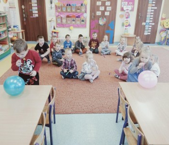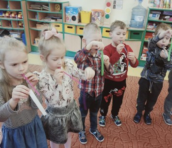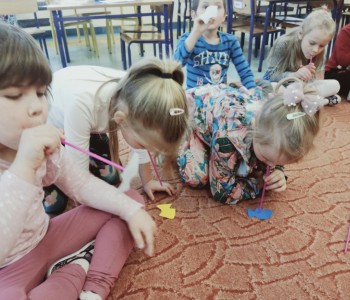 Przenosiły papierowe rybki za pomocą słomki do napojów, zdmuchiwały balon, dmuchały z całej siły na paski papieru, dmuchały do wody aby powstała piana, a także tworzyły barwne kompozycje na kartce, rozdmuchując farby słomką. Była to fajna zabawa, a przy tym ćwiczenie przygotowujące do prawidłowego mówienia.