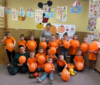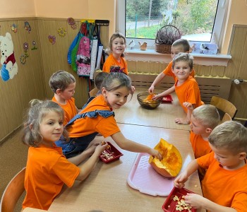 Trwa złota i piękna jesień, a więc prym w kuchni wiedzie dynia, dlatego grupa „Myszka Miki” zaprosiła do zabawy rodziców. W tym dniu grupę odwiedziła również pani pielęgniarka Sylwia, która uświadamiała dzieciom, jak ważne jest zdrowe odżywianie i dlaczego należy spożywać warzywa. Przedszkolaki poznały bliżej to dorodne i okazałe warzywo, jego właściwości zdrowotne oraz potrawy jakie można z dyni przygotować.