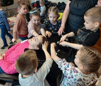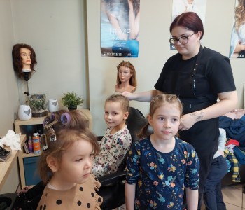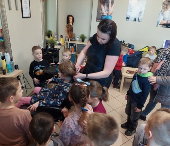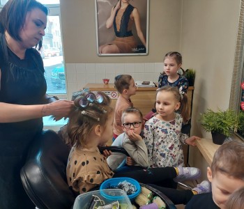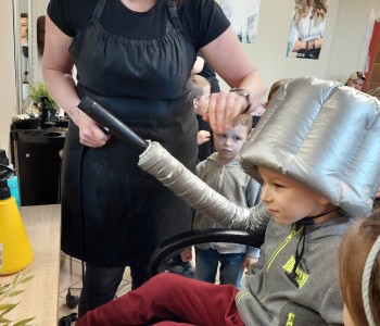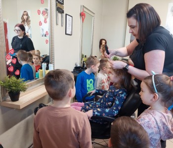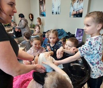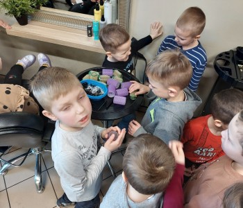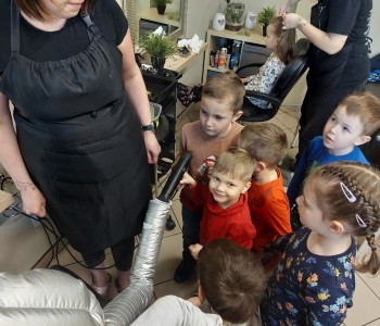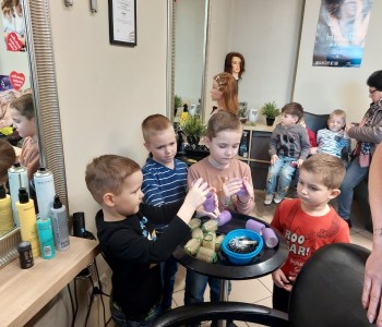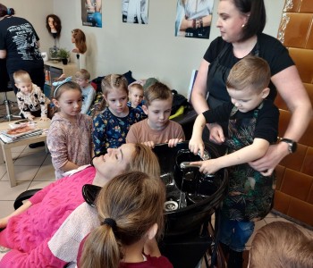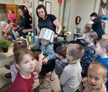 Dzieci z grupy Myszki Miki w ramach poznawania różnych zawodów udały się na wycieczkę do pobliskiego salonu fryzjerskiego. Przedszkolaki obejrzały z zainteresowaniem wyposażenie salonu, znajdujące się tam sprzęty oraz mieli możliwość obejrzenia z bliska pracy fryzjerki. Dzieci z przyjemnością oddawały się zabiegom Pań fryzjerek. Dużo radości sprawiło dzieciom mycie włosów pani klientki. Serdecznie dziękujemy Pani Agnieszce Orwat za możliwość zwiedzania Salonu Fryzjerskiego "AS".