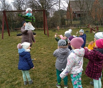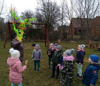 Powitanie wiosny - 19 marca dzieci z grupy Myszki Miki zapoznały się ze zwyczajem pożegnania zimy marzanną. Dzieci pożegnały zimę i wesołymi okrzykami przywitały wiosnę. Zima już się kończy, idzie do Nas wiosna. Wiosna będzie miła, ciepła i radosna.