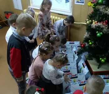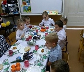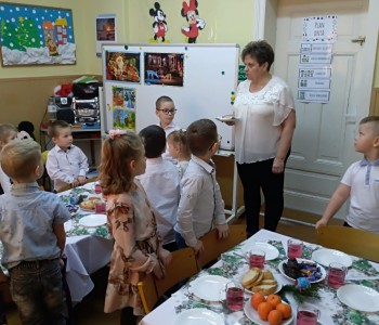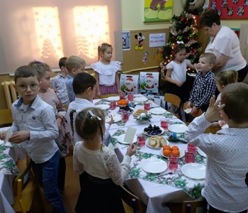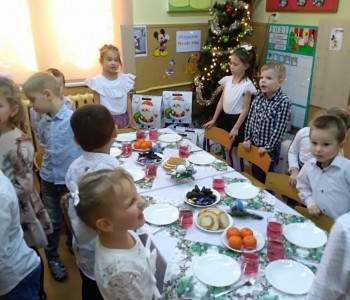 Już od rana czekała w przedszkolu niespodzianka. Pod choinką Gwiazdor zostawił prezenty, radość dzieci była ogromna. Przedszkolaki wspólnie z paniami kolędowały, dzieliły się opłatkiem, składając sobie życzenia i jadły świąteczny obiad przy pięknie udekorowanym stole. Był tradycyjny barszczyk, rybka, kapusta z grzybami i świąteczne ciasteczka z owocami. Takie chwile utrwalają dzieciom znajomość tradycji i zwyczajów świątecznych, wzmacniają bliskie serdeczne relacje. Wszyscy poczuli zbliżające się wielkimi krokami Święta Bożego Narodzenia.