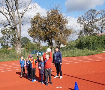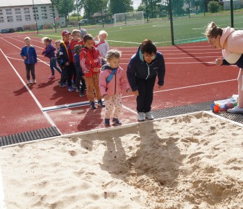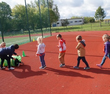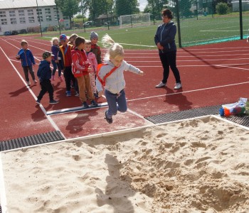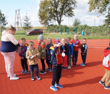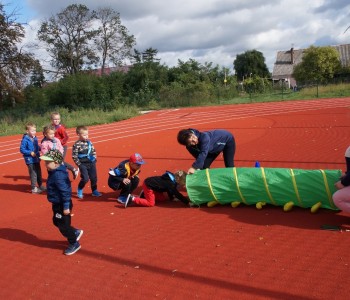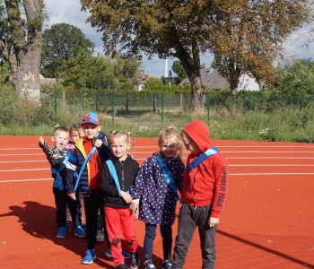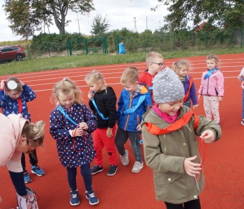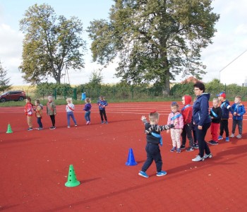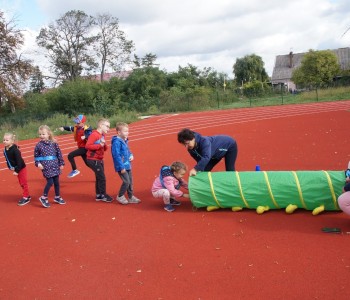 Na początek wychowawczyni przeprowadziła z dziećmi krótką rozgrzewkę, po czym nasi mali sportowcy mogli rozpocząć swoją przygodę. Konkurencje sportowe obejmowały: slalom z woreczkami, układ ruchowy, wędrującą piłkę, przejście przez tunel, skok w dal z miejsca, bieg. Po zaliczeniu wszystkich konkurencji zliczyliśmy punkty, zwycięska drużyna otrzymała symboliczny puchar, a wszystkie dzieci otrzymały pamiątkowe medale.