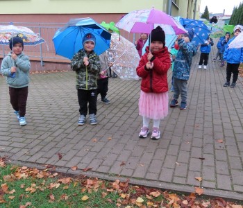 Spacer w deszczowy dzień wcale nie musi być nudny. Przykładem jest grupa Krasnala Hałabały, która wyposażona w parasol z radością wyruszyła na "deszczowy"spacer.