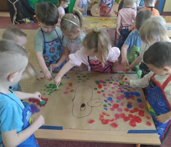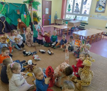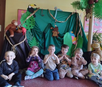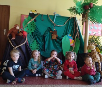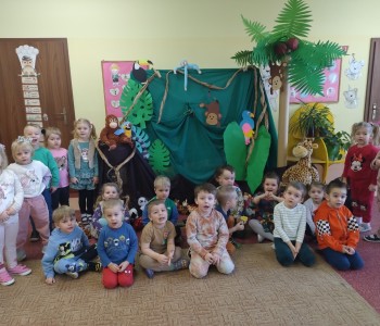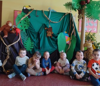Dzieci z grupy Krasnala Hałabały w tygodniu poświęconym zwierzętom egzotycznym wybrała się w podróż do dżungli. Było zatem bardzo zielono, egzotycznie i różnorodnie, bo taka jest właśnie dżungla - pełna barwnych roślin oraz niezwykłych zwierząt.