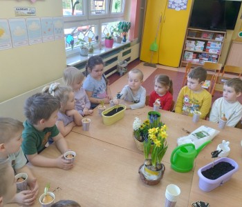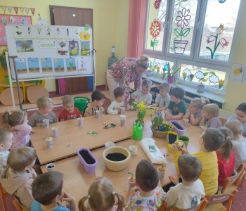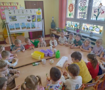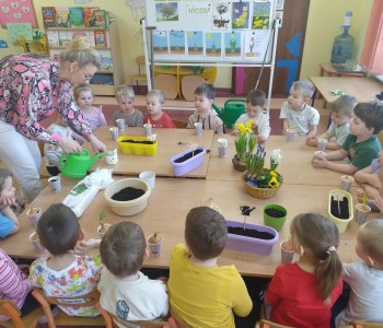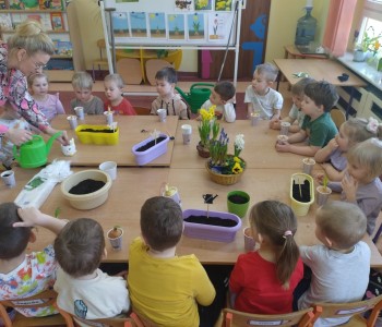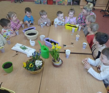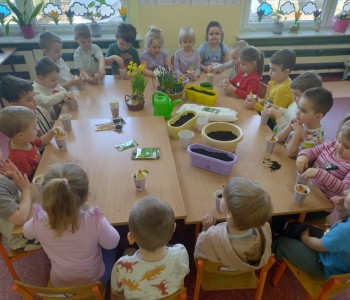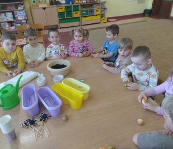 Dzieci z grupy "Krasanala Hałabały" postanowiły założyć w sali swój „Wiosenny ogródek”. Wszyscy zamienili się w małych ogrodników. Dzieci przygotowały wszystkie potrzebne narzędzia do pracy: łopatkę, wiaderko, konewkę, doniczki oraz ziemię. Mogły samodzielnie wysiać nasiona oraz cebulki kwiatów do doniczek a następnie podlać sadzonki.