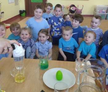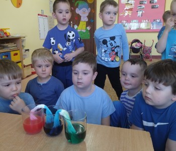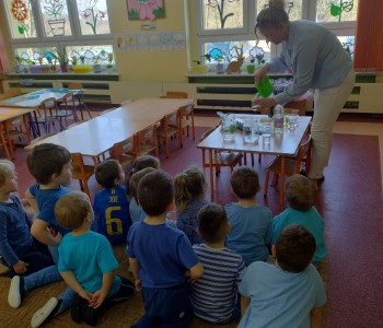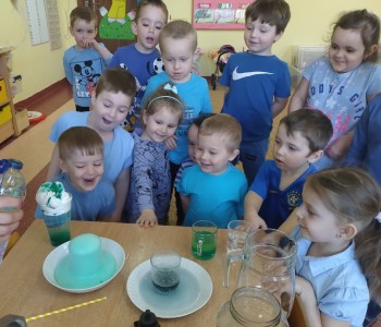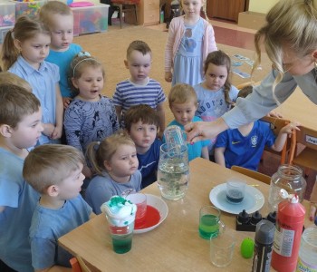 Zabawy badawcze dostarczyły dzieciom niezliczone ilości nowych przeżyć i wrażeń. Dzieci szukały odpowiedzi na pytanie, dlaczego tak się dzieje? Krasnale doświadczały podczas eksperymentów z:wulkanem, znikającą wodą, spadającym kolorowym dreszczem, burza w szklance wody, tańczący olej, podróżująca woda. Milena Głowacka