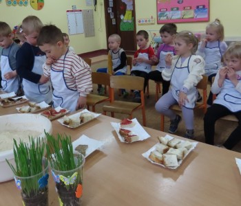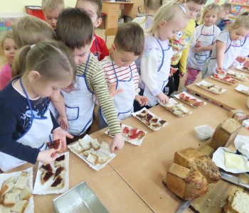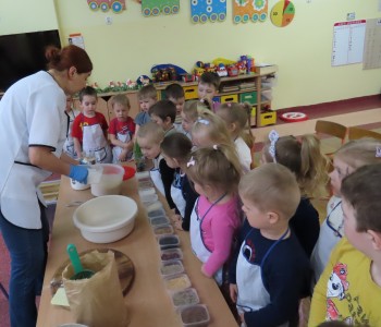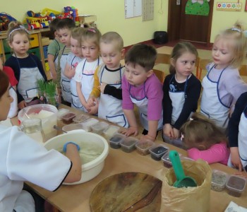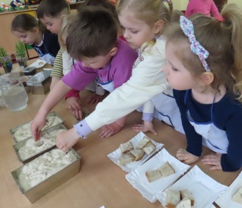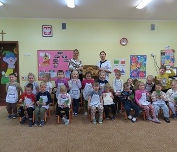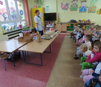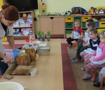 Przedszkolaki poznały etapy pieczenia chleba oraz niezbędne składniki, z których powstaje chleb oraz pomogły w jego przygotowaniu. Chleb był przepyszny i bardzo wszystkim smakował a zapach unosił się po całym przedszkolu.
