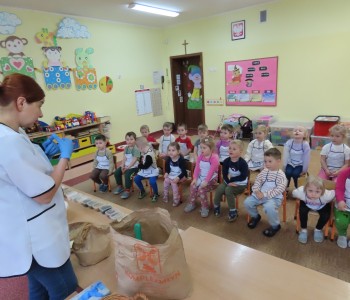 Dzieci z grupy Krasnala Hałabały wzięły udział warsztatach pieczenia chleba. Miały przyjemność gościć w swojej sali panią Monikę, która prowadzi Oporzynka Chleb Tradycyjny i przekazała dzieciom wiedzę na temat wypieku chleba.