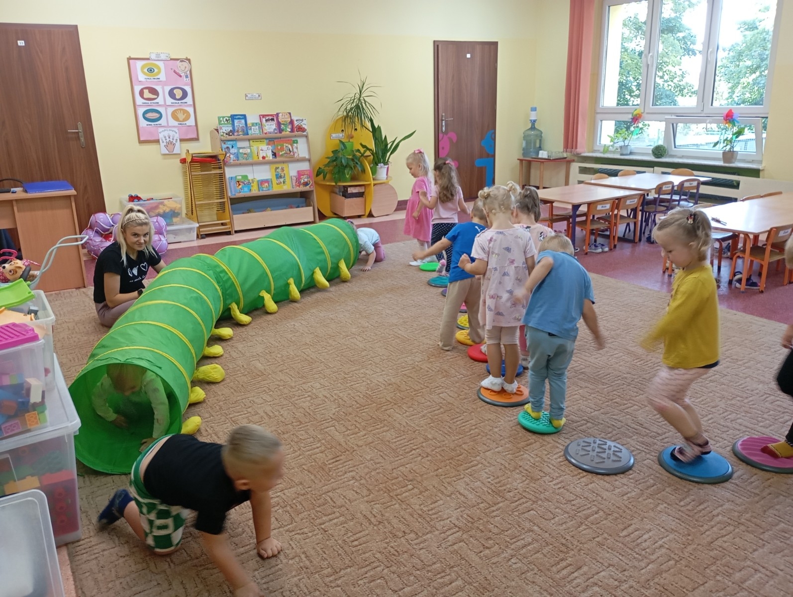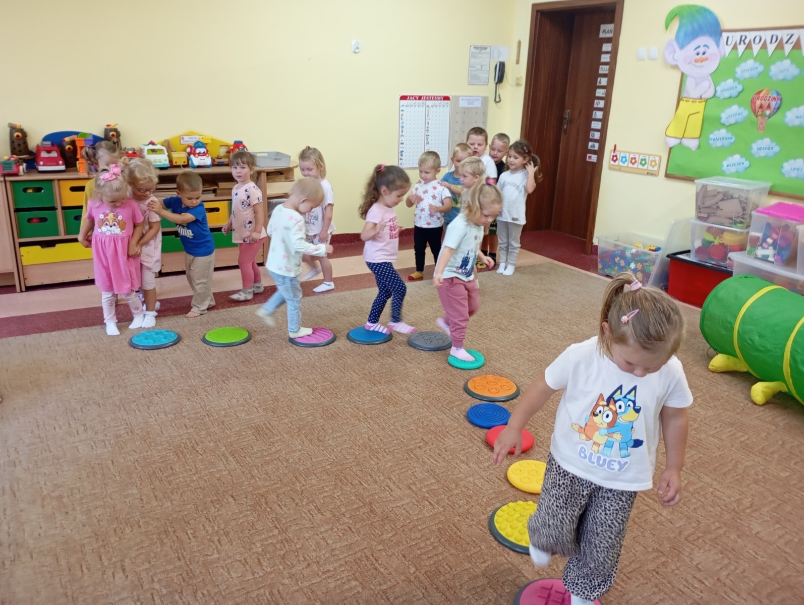 Podczas zabaw ruchowych dzieci z grupy Krasnala Hałabały doskonaliły równowagę poprzez pokonywanie toru przeszkód oraz umiejętność chwytu i rzutu piłką. Celem zabaw ruchowych w przedszkolu jest wszechstronny rozwój dziecka, obejmujący rozwój motoryczny, społeczny i poznawczy.
