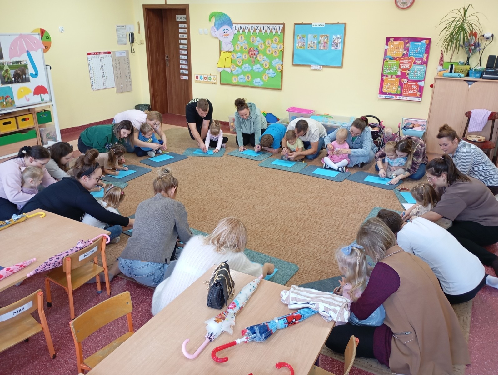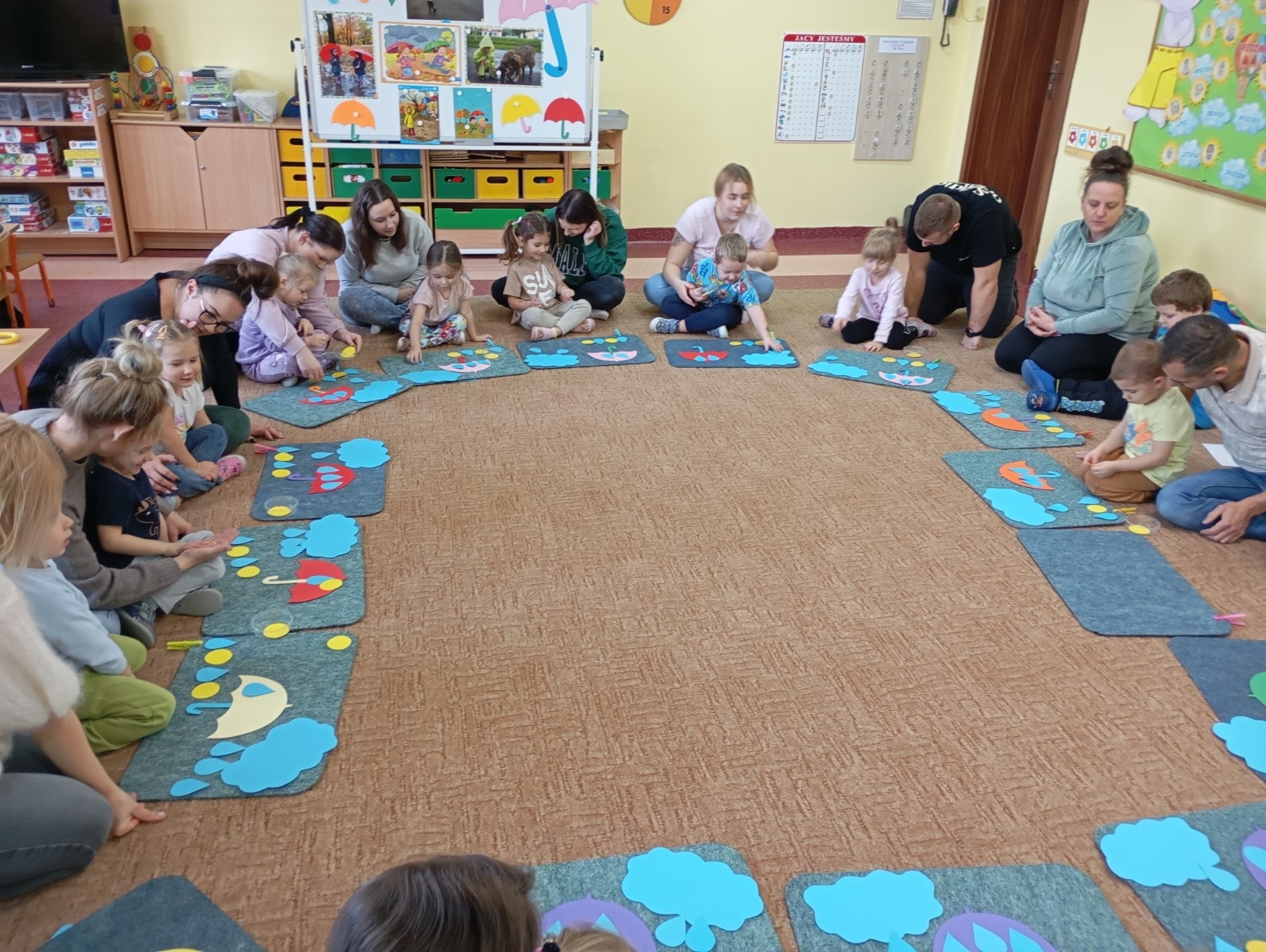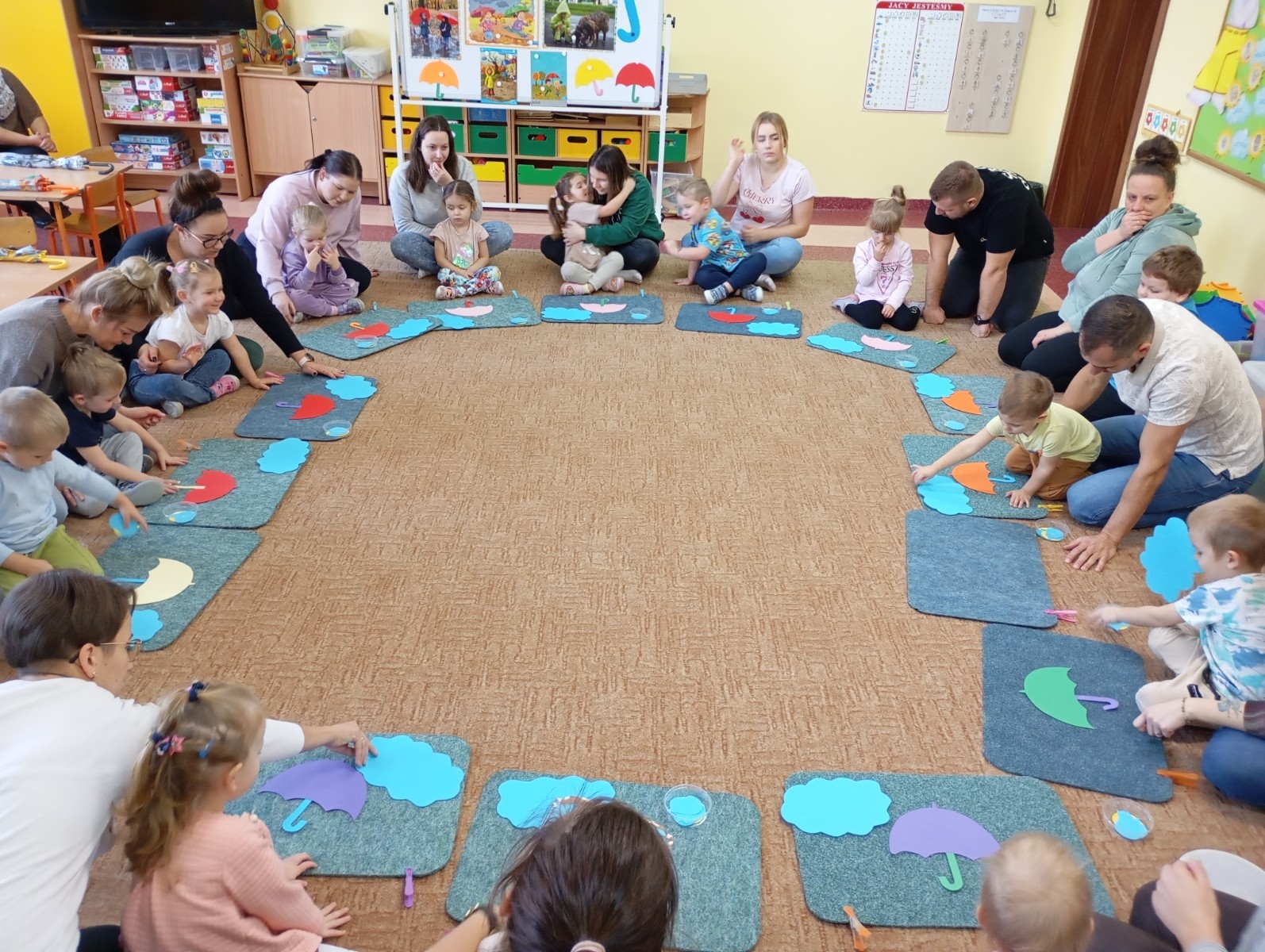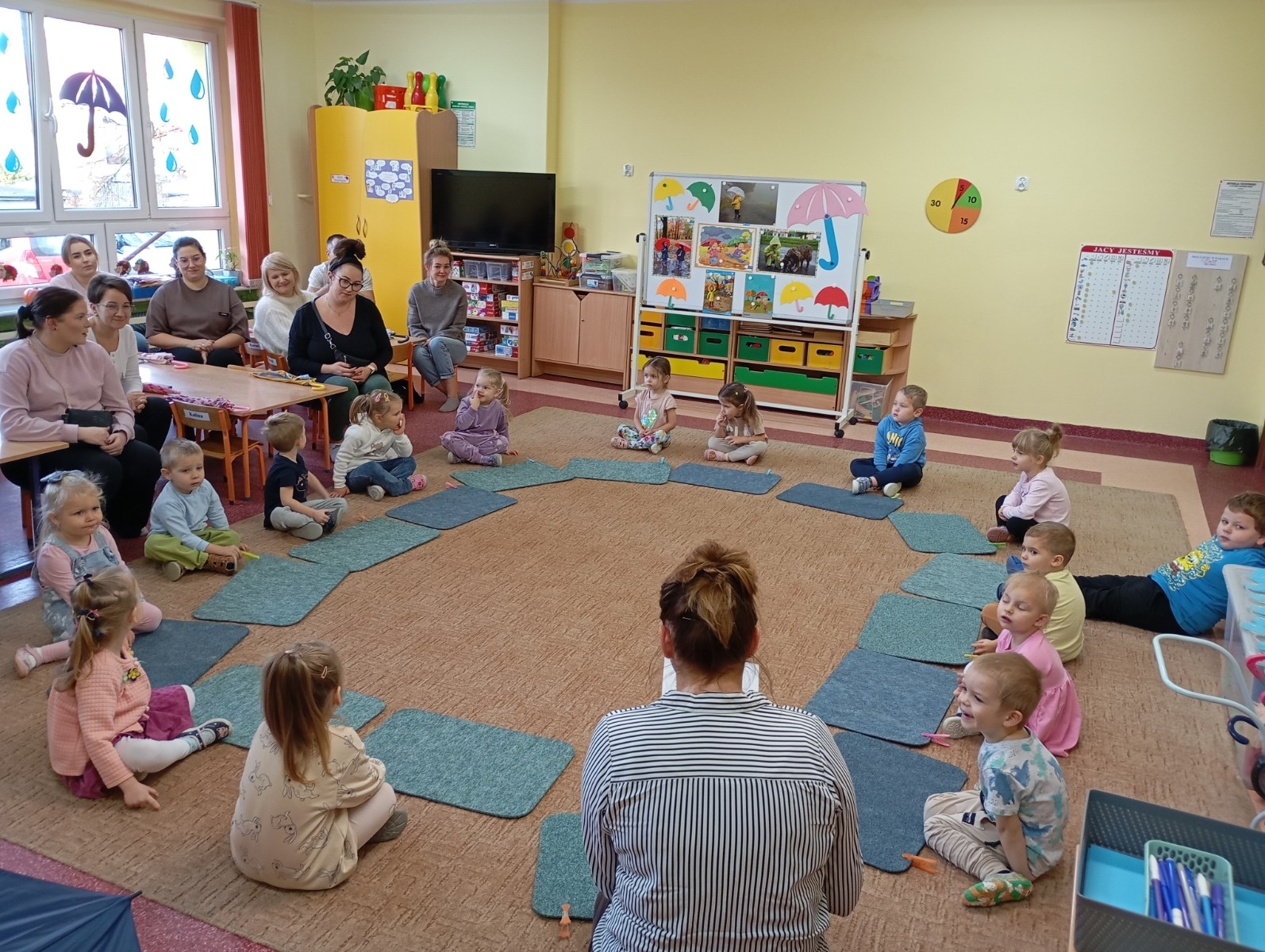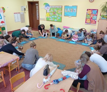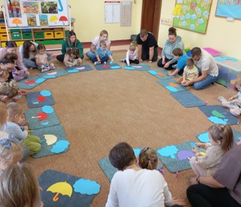 W grupie Krasnala Hałabały odbyły się zajęcia otwarte w ramach których rodzice mogli obserwować, jak ich dzieci bawią się i pracują, a także zobaczyć ich osiągnięcia w zabawach inspirowanych jesienną pogodą. Podczas zajęć dzieci doskonaliły umiejętność poczucia rytmu, ilustrowania treści utworu ruchem, liczenia oraz kontynuowania rytmów.