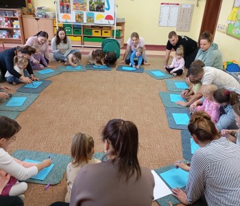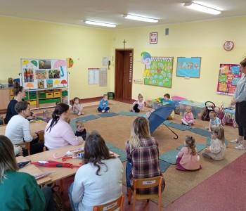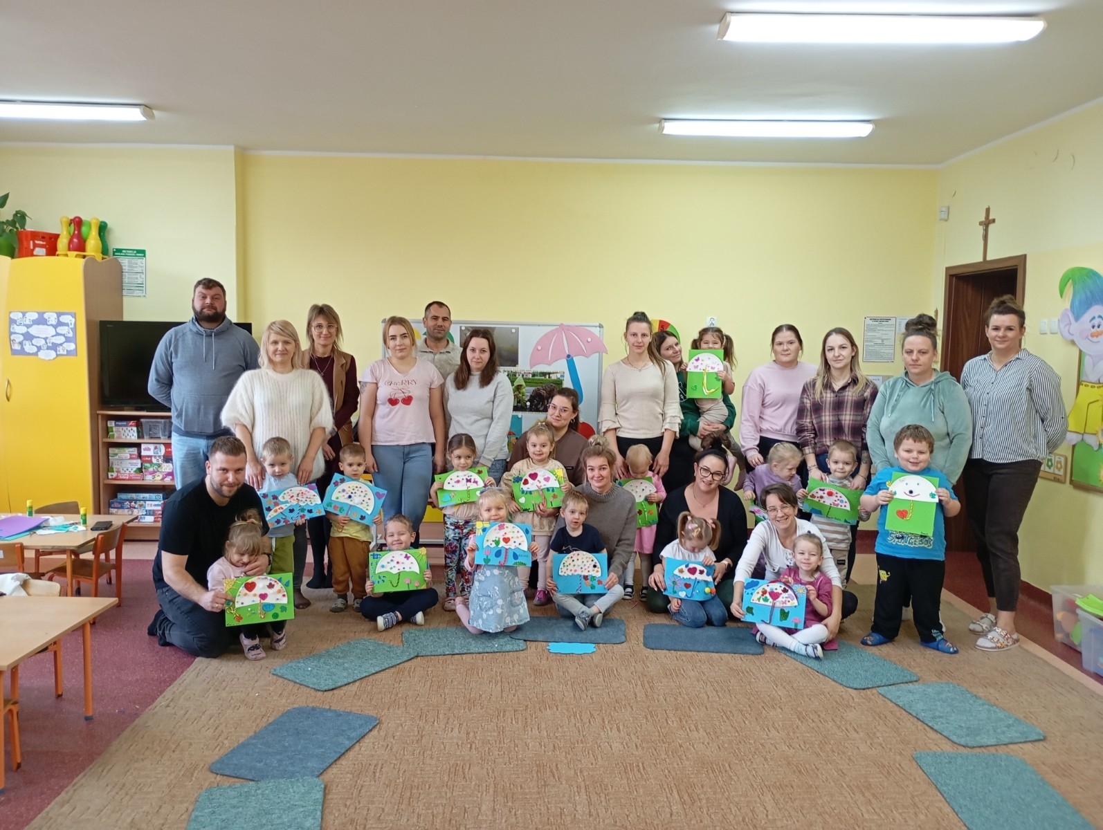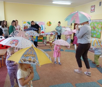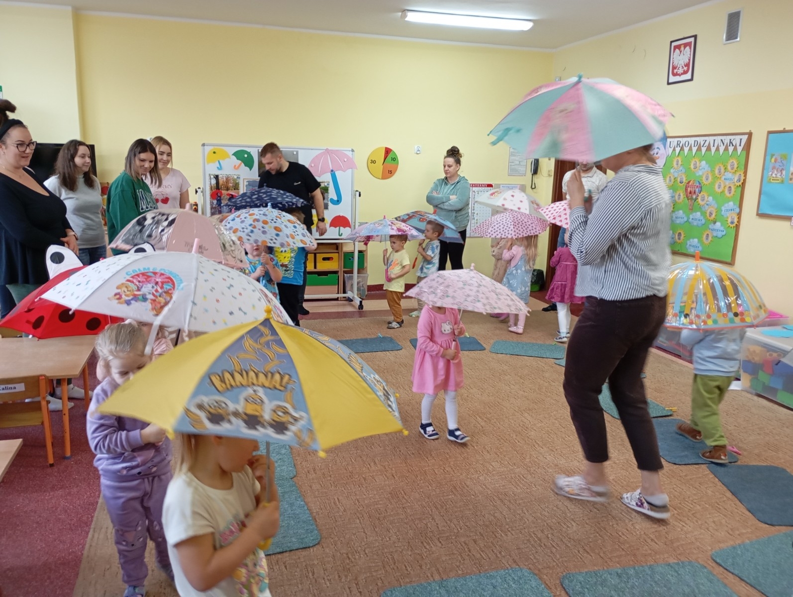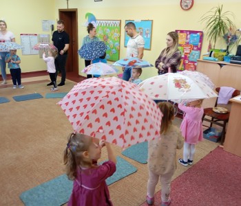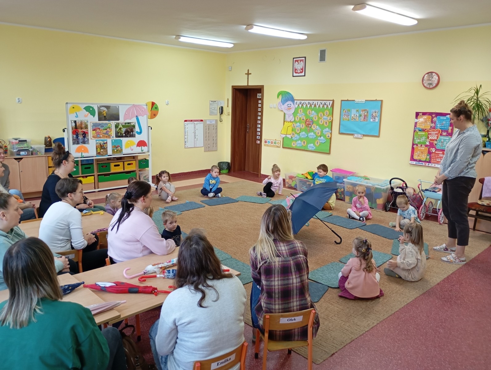 W grupie Krasnala Hałabały odbyły się zajęcia otwarte w ramach których rodzice mogli obserwować, jak ich dzieci bawią się i pracują, a także zobaczyć ich osiągnięcia w zabawach inspirowanych jesienną pogodą. Podczas zajęć dzieci doskonaliły umiejętność poczucia rytmu, ilustrowania treści utworu ruchem, liczenia oraz kontynuowania rytmów.
