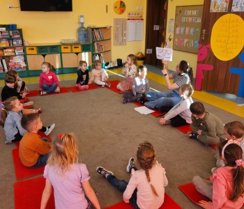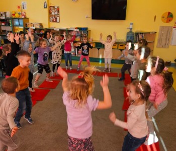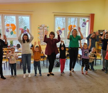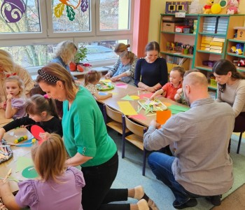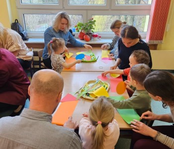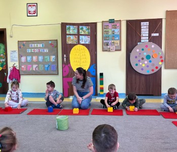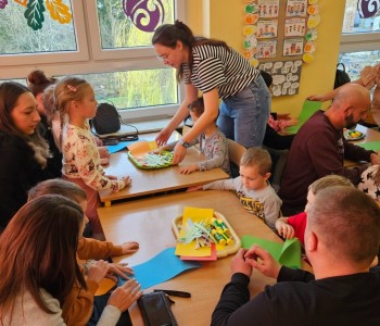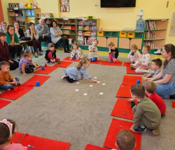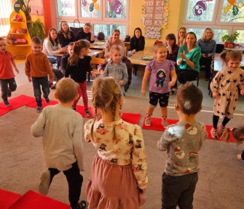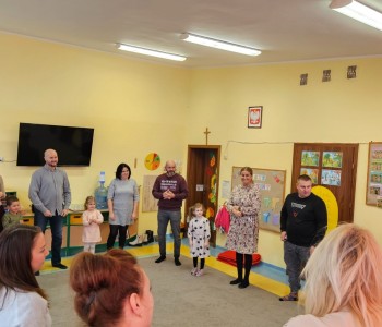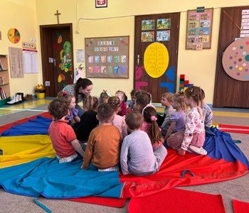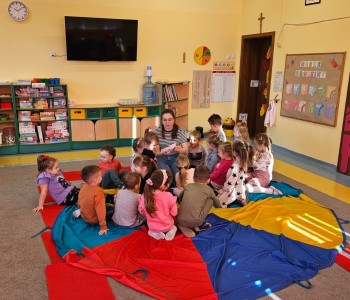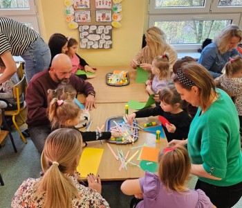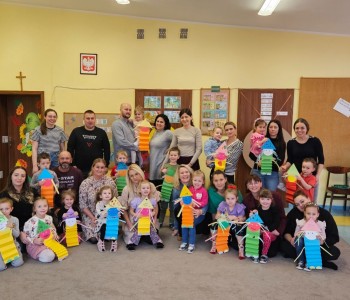 Cała podróż rozpoczęła się na kolorowej, latającej chuście, która symbolizowała drogę do fantastycznego świata pełnego przygód i wyzwań. Podczas zajęć dzieci miały okazję rozwijać swoje zdolności intelektualne i manualne, a także współpracować z rodzicami. Rozwiązywały ciekawe rebusy, które wymagały logicznego myślenia, określały położenie zabawek, a także uczyły się uważnie słuchać, licząc ilość guzików w magicznym kubku. Każde dziecko samodzielnie przeliczało elementy, co było doskonałym ćwiczeniem matematycznym. Na zakończenie spotkania dzieci wraz z rodzicami stworzyły pracę plastyczną zatytułowaną „Pajacyk”. Wspólne tworzenie było nie tylko kreatywnym zajęciem, ale także wspaniałą okazją do budowania relacji i wspólnego świętowania dziecięcej wyobraźni. Takie zajęcia to nie tylko świetna zabawa, ale także wartościowy czas spędzony z bliskimi, który rozwija umiejętności i wzmacnia więzi. Dziękujemy wszystkim za udział i zapraszamy na kolejne spotkania w naszej grupie Kubusia Puchatka!