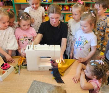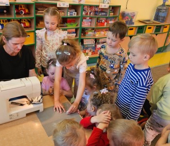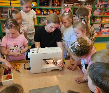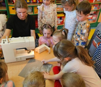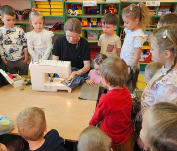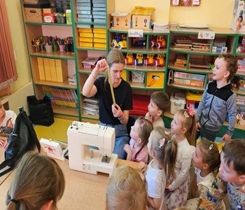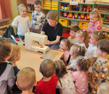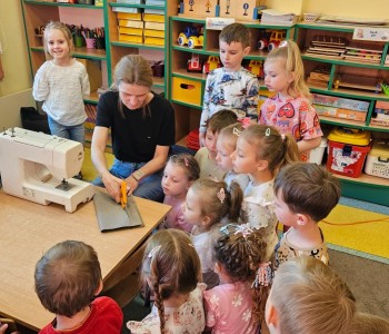 Grupę Kubusia Puchatka odwiedziła mama Poli – Pani Mariola, która opowiedziała dzieciom o swojej pracy krawcowej. Przyniosła ze sobą maszynę do szycia oraz różne narzędzia krawieckie, które wzbudziły ogromne zainteresowanie wśród przedszkolaków.