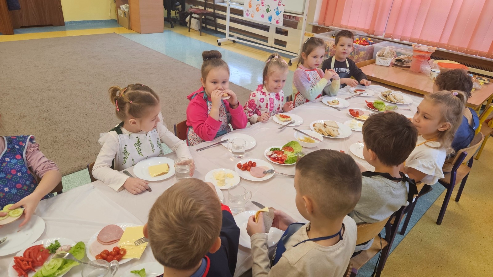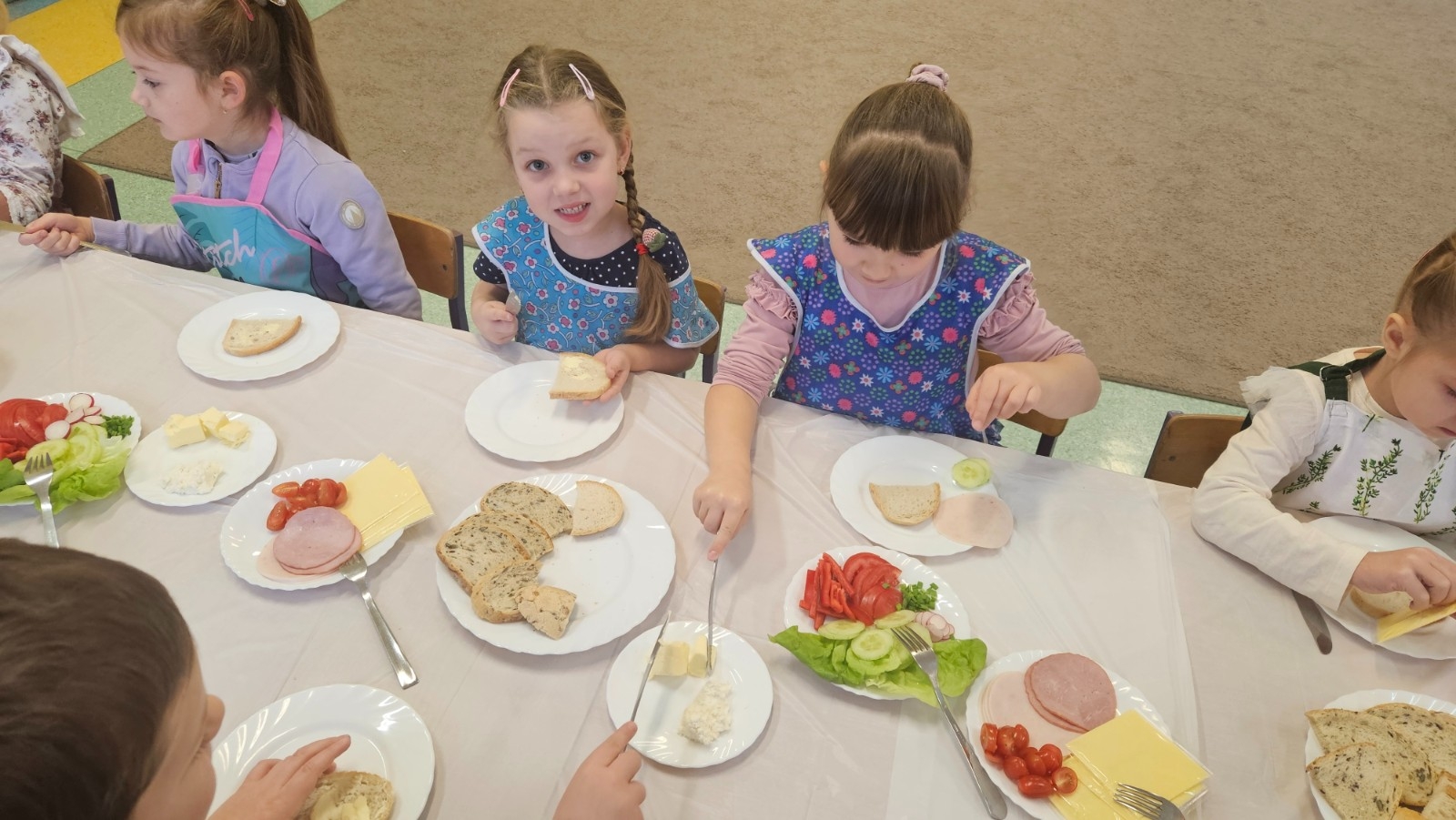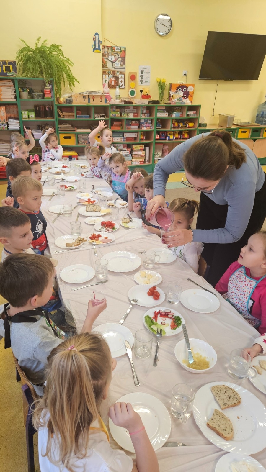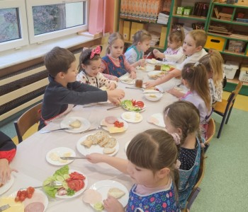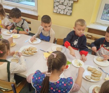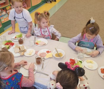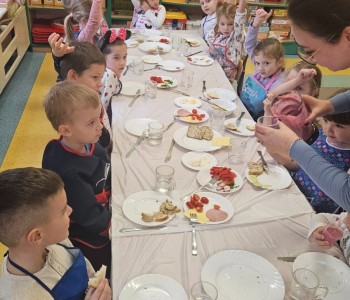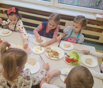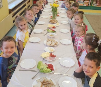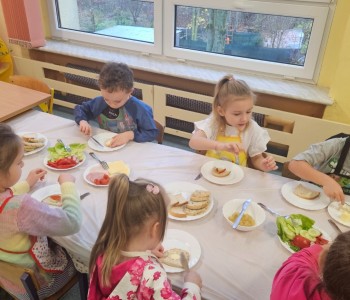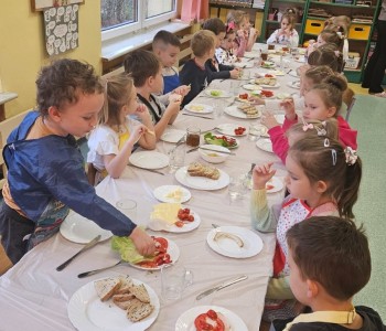 Przedszkolaki z grupy Kubusia Puchatka wzięły udział w akcji „Śniadanie daje moc”. Podczas zajęć dzieci dowiedziały się, jakie witaminy kryją się w owocach i warzywach oraz dlaczego warto jeść zdrowe posiłki. Dzieci samodzielnie przygotowały kolorowe, pełne warzyw kanapki. Mali kucharze stanęli na wysokości zadania, tworząc pyszne i zdrowe kompozycje. To była smaczna lekcja zdrowego odżywiania!
