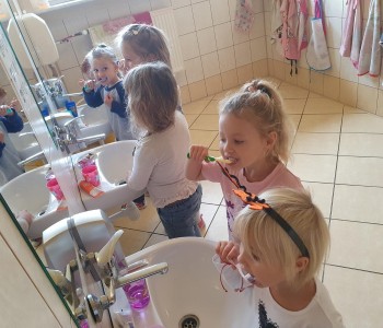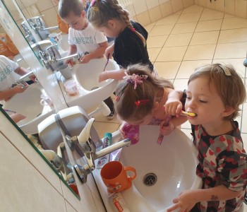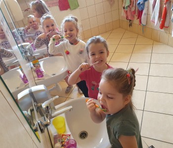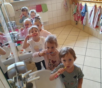 Podczas mycia zębów dzieci uczą się prawidłowej techniki szczotkowania, a w łazience towarzyszy nam sympatyczny królik Higienek. Dzieci każdego dnia z niecierpliwością i pozytywnym nastawieniem czekają na mycie zębów.