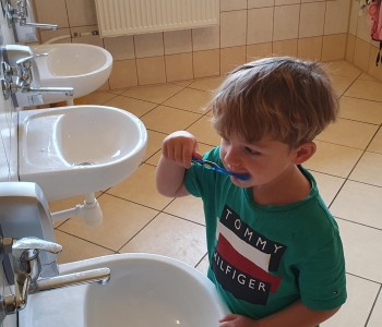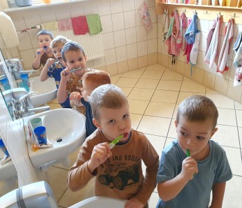 Troska o zdrowie dzieci to zadanie zarówno rodziców, jak i wychowawców oraz wszystkich pracowników przedszkola. Ważnym elementem w tym zakresie jest zapobieganie próchnicy zębów. W grupie „Kubusia Puchatka” codziennie myjemy zęby, aby wyrobić nawyk dbania o higienę jamy ustnej. Każde dziecko ma na półce swój kubek, szczoteczkę i pastę.