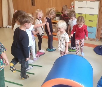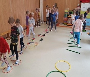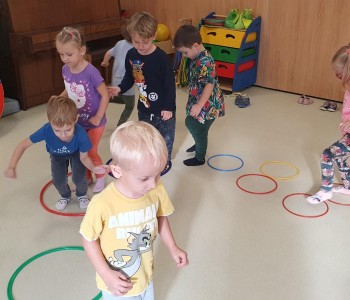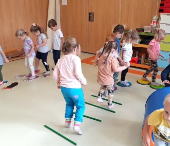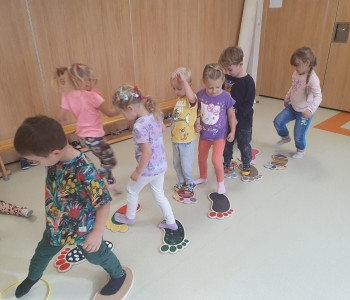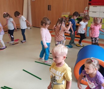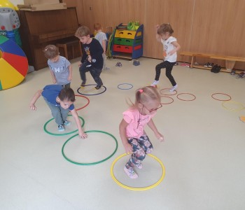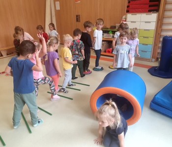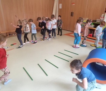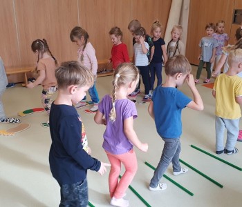 Wszyscy bardzo lubią również ćwiczenia w sali gimnastycznej, gdzie grupa może korzystać z różnych przyrządów i przyborów sportowych. Gry i zabawy ruchowe kształtują prawidłową postawę, budują kondycję. Aktywność oparta na ruchu całego ciała to także trening motoryki dużej, która z kolei jest niezbędna dla prawidłowego rozwoju małej motoryki, a więc precyzyjnych ruchów dłoni. Dzięki ciekawym zajęciom dzieci w naszej grupie działają chętnie, aktywnie i z radością, co pozwala im rozwijać sprawność fizyczną mającą ogromny wpływ na zdrowie każdego człowieka.