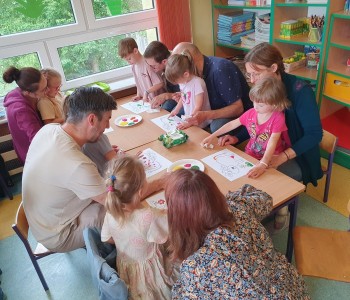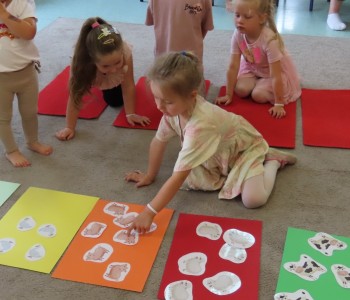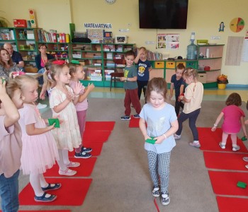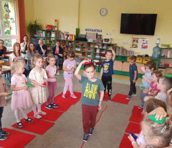 Układanie zwierząt w zagrodzie wiejskiej dało dzieciom możliwość doskonalenia umiejętności matematycznych, takich jak: przeliczanie elementów zbioru i segregowanie od najmniejszej ilości elementów do największej. Podczas wykonywania zadania ruchowego z elementem kodowania dzieci uczyły się zapamiętywania ruchów ciała i przyporządkowania ruchom określonej barwy. Rzucając do celu i przechodząc po sznurku przedszkolacy doskonalili koordynację wzrokowo-ruchową oraz równowagę. Na zakończenie zajęcia dzieci wspólnie z rodzicami wykonały pracę plastyczną pt. „Wesoła krowa” oraz taniec integracyjny rozwijając ekspresję plastyczną i muzyczną. Dziękujemy rodzicom za przybycie i wspólną zabawę.