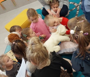 Przedszkolacy mogli obejrzeć książeczki o psach, następnie wysłuchały wierszy z literatury dziecięcej dotyczącej czworonożnych pupili ora wspólnie wyklejały kontur psa. Na zakończenie spotkania dzieci skorzystały z zabaw ruchowych z wykorzystaniem magicznego dywanu. Dziękujemy za spotkanie!