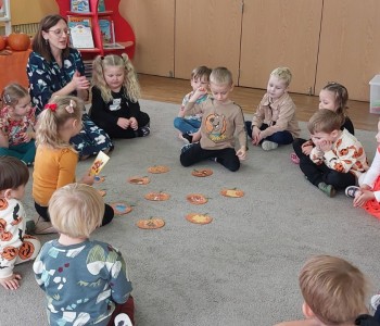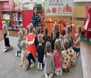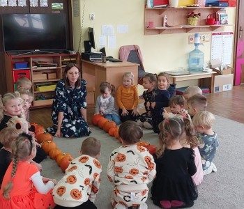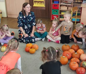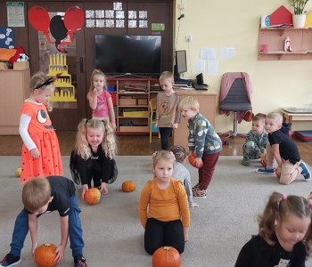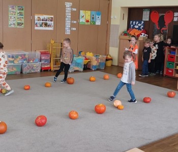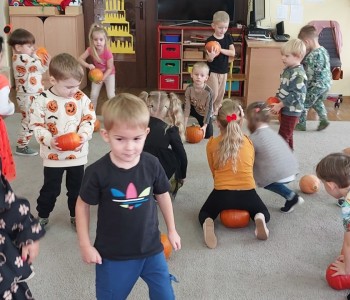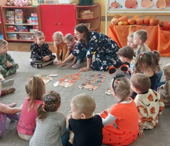 Dzieci podczas zabaw wysłuchały wierszyka tematycznego, dzieliły się pomysłami na zastosowanie dyni w kuchni, brały udział w zabawach ruchowych i matematycznych z wykorzystaniem dyni. Przedszkolacy ćwiczyli umiejętności klasyfikowania, przeliczania oraz koordynację-wzrokowo-ruchową. Na koniec zajęć złożyli dyniowe puzzle, które w dowolny sposób pokolorowali.