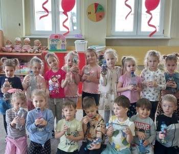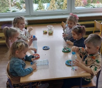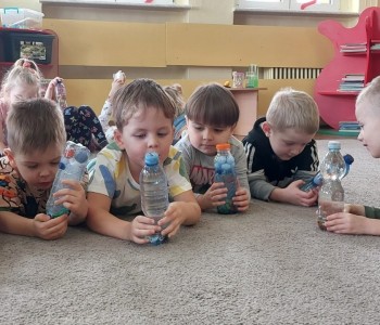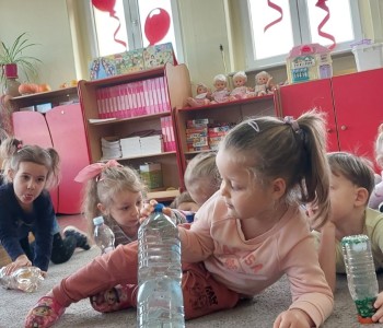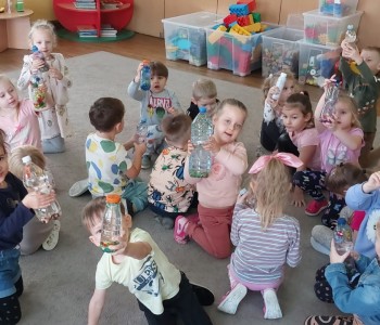 Podczas tygodnia tematycznego o ciele dzieci poruszały temat dotyczący zmysłów. Na czwartkowych zajęciach najpierw jako instrument wykorzystały plastikowe butelki, następnie rozwijały orientacje w przestrzeni i schemacie ciała a na koniec wykonały samodzielnie butelki sensoryczne. Butelki sensoryczne można wykorzystać jako atrybut wyciszający, świetnie nadają się do ćwiczenie koncentracji uwagi i stymulują zmysł wzroku.