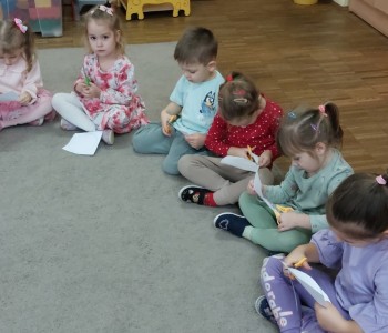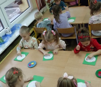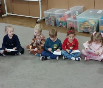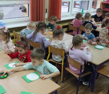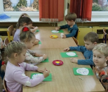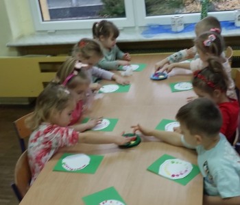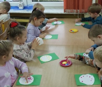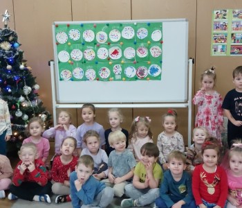 Grupa Misia Uszatka podczas zajęć plastyczno-technicznych ćwiczyła motorykę małą w szczególności umiejętność wycinania po linii określonego kształtu, następnie metodę dziecięciu palców malowała swoje koła, aby powstały z nich barwne bombki, które ozdobiły salę.