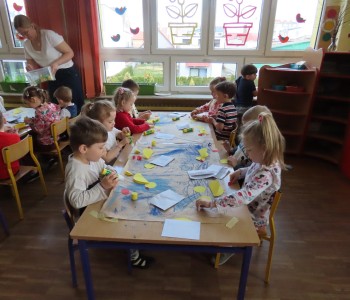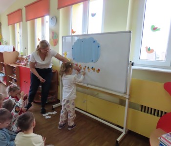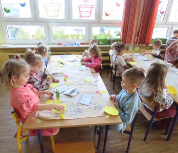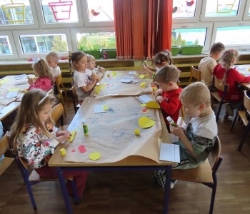 Nasze zajęcia pozwoliły na wykorzystanie radości oraz spontanicznej aktywności dzieci w trakcie zabawy. Praca tą metodą umożliwia wspomaganie koncentracji, synchronizację pracy mózgu, rozwijanie kompetencji emocjonalnych, społecznych i poznawczych. Dzieci podczas muzyki współpracowały ze sobą i rytmicznie malowały niebieską kredką na ogromnym arkuszu papieru.