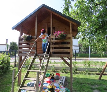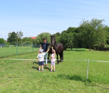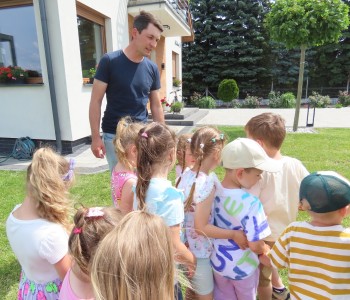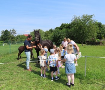 Gospodarze przywitali nas serdecznie oprowadzili dzieci po gospodarstwie i opowiedzieli o swojej pracy. Dzieci dowiedziały się ciekawych rzeczy o hodowli zwierząt, uprawie roli, również mogły zobaczyć hodowane zwierzęta – krowy, kury, cielaki i konie. Dużą atrakcją była możliwość nakarmienia zwierząt. Pani Jagoda częstowała wszystkich ciasteczkami, pysznym sokiem. Frajdą okazały się zabawy na placu zabaw. Na zakończenie spotkania dzieci wręczyły gospodarzom podziękowanie. Przedszkolaki wróciły z wycieczki uśmiechnięte, zadowolone i bogatsze o nowe doświadczenia. Chcieliśmy jeszcze raz podziękować, za miłe ugoszczenie nas i oprowadzenie po swoim gospodarstwie.