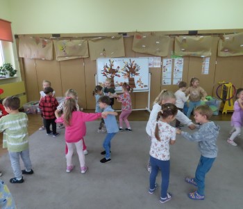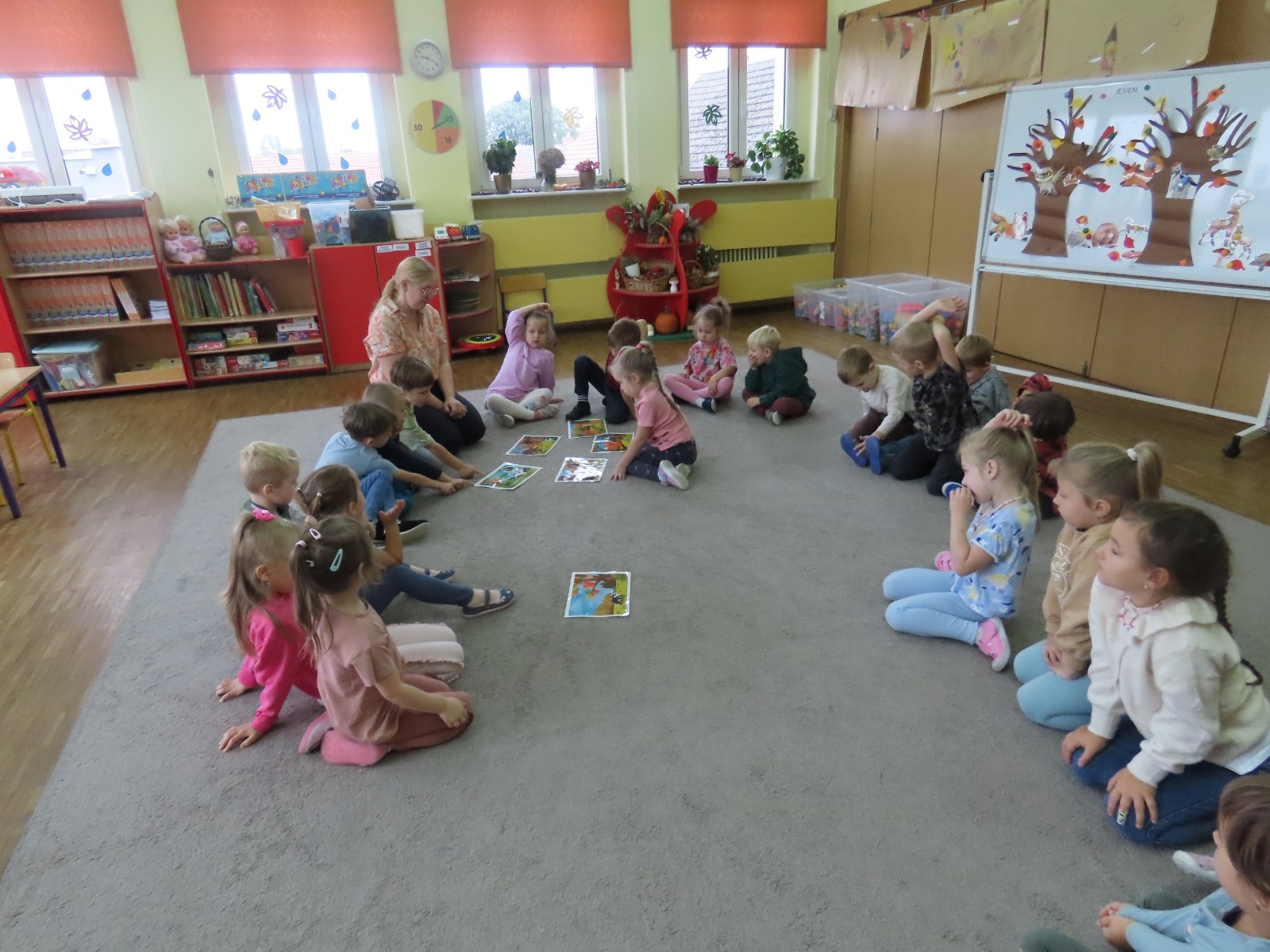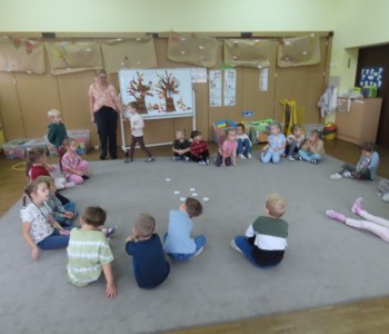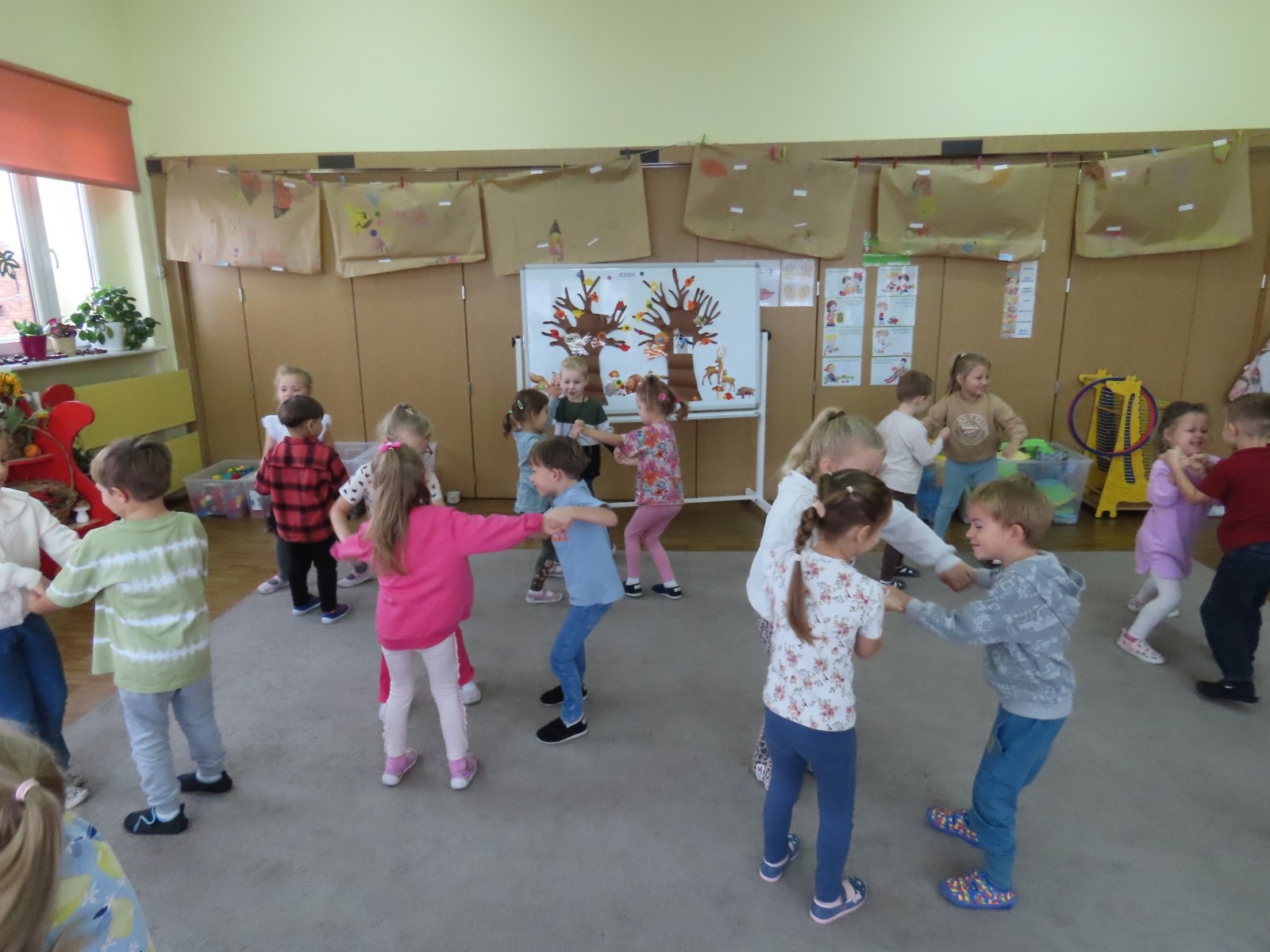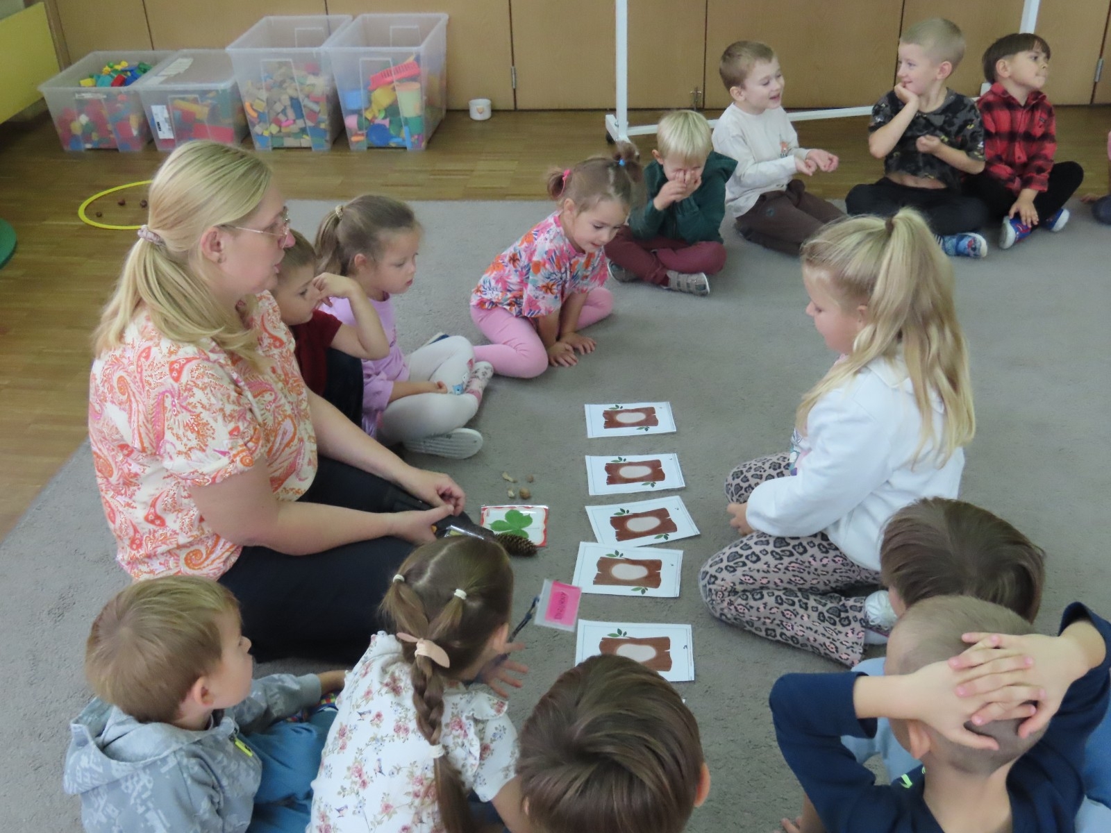 Nadeszła piękna, złota jesień. Z każdym dniem robi się coraz chłodniej, liście opadają, tracąc barwy, przyroda powoli przygotowuje się do zimowego snu. W przedszkolu nadszedł czas na jesienne zabawy, zbieranie liści, szyszek, jarzębiny, kasztanów i żołędzi.
