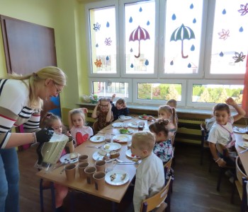 To doskonała okazja, by uczyć dzieci zdrowych nawyków żywieniowych oraz rozwijać ich samodzielność i kreatywność w komponowaniu posiłków. Po pysznym i pożywnym śniadaniu każdy przedszkolak otrzymał pyszny koktajl owocowo -warzywny.
