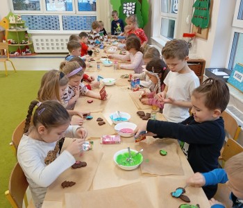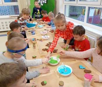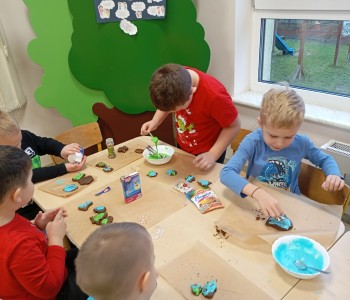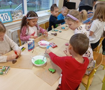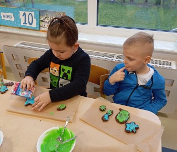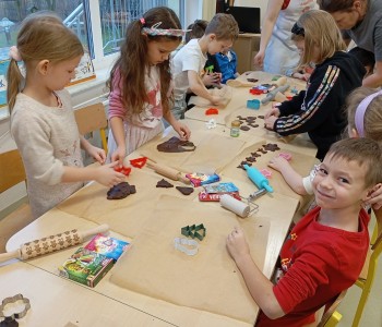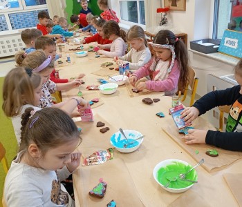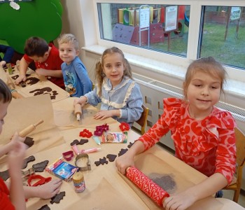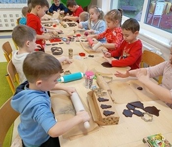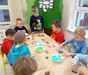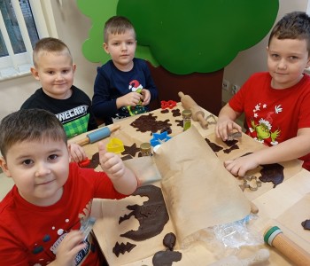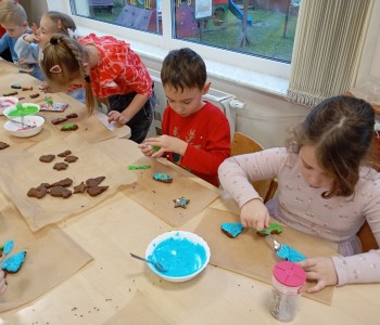 Dzieci z grupy Muminków wspólnie z mamą Nikodema panią Angeliką Nowak piekły świąteczne pierniczki. Z wielkim zaangażowaniem wycinały foremkami różne kształty z przygotowanego ciasta. Najbardziej oczekiwanym przez dzieci momentem było oczywiście dekorowanie a następnie degustacja pierniczków. Był to naprawdę mile spędzony czas podczas którego dzieci pracowały i jednocześnie świetnie się bawiły.