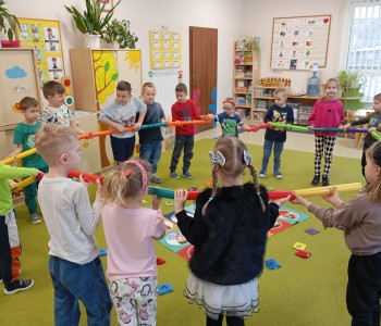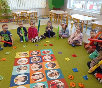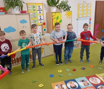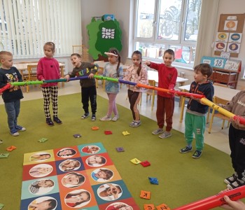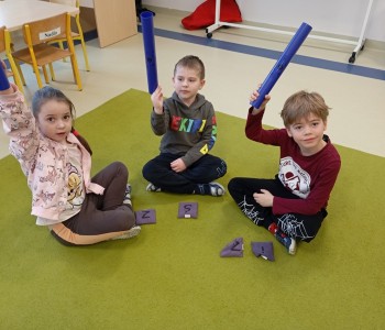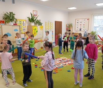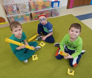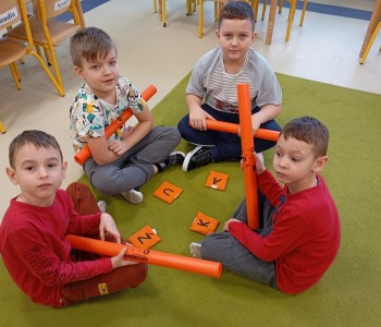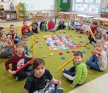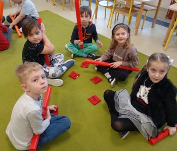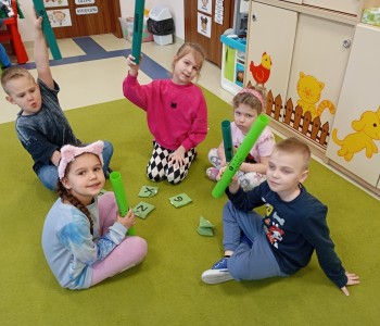 Dzieci z grupy Muminków kolejny raz wykorzystały na zajęciach Bum Bum Rurki, tym razem dzieci doskonaliły nie tylko poczucie rytmy i umiejętność gry na instrumentach ale również umiejętność współpracy. Podczas zabaw z Bum Bum Rurkami dzieci utrwalały również poznane litery oraz doskonaliły słuch fonematyczny.