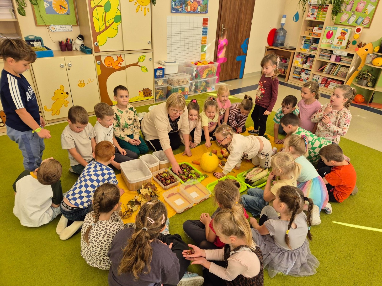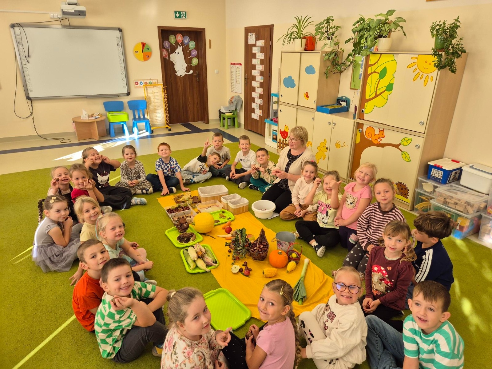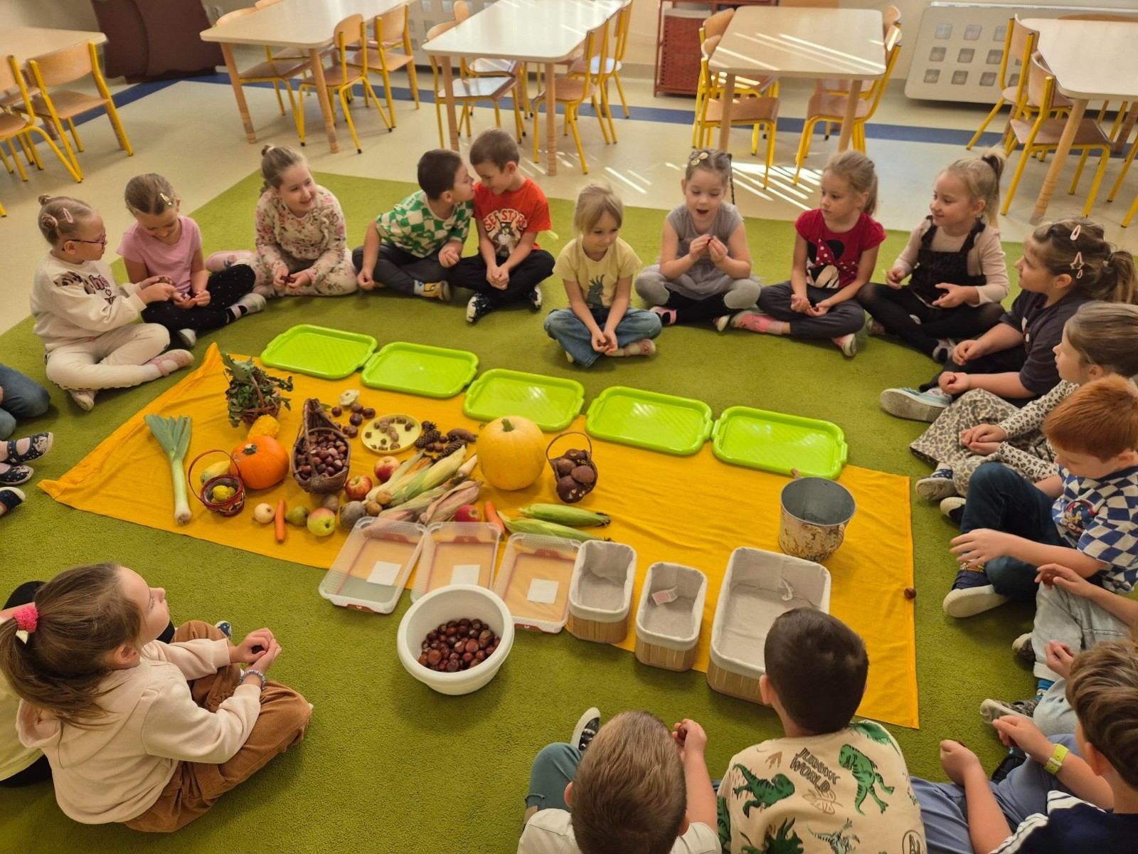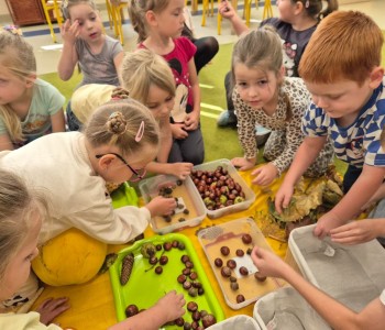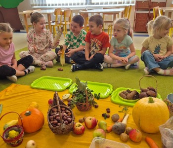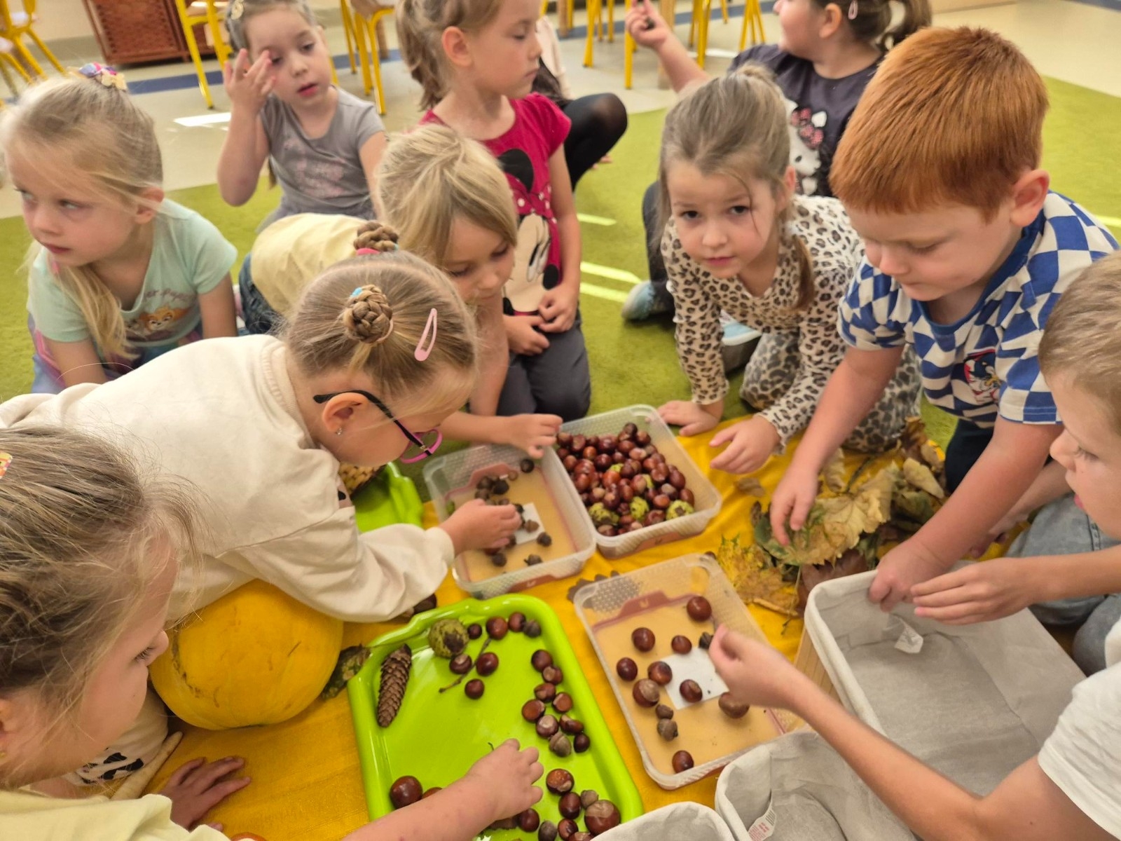 Jesień to wyjątkowa pora roku pełna kolorów, zapachów i smaków. Muminki przekonały się o tym podczas zajęć tematycznych poświęconych zebranym na spacerach darom jesieni. Kasztany, żołędzie, kolorowe liście, dynie to skarby, które wzbudzają ciekawość dzieci. Przedszkolacy rozpoznawali ich kształty, kolory, faktury i z zapałem układali w kąciku przyrody segregując według podanych cech.