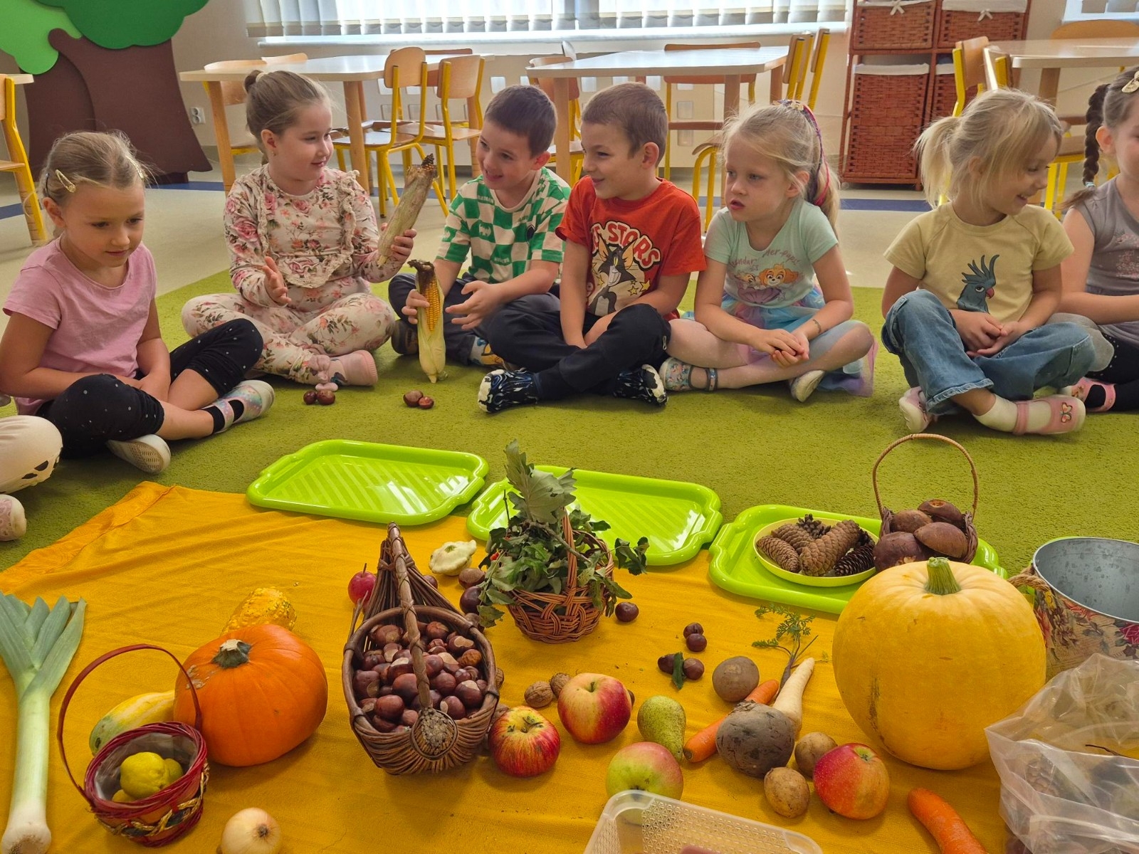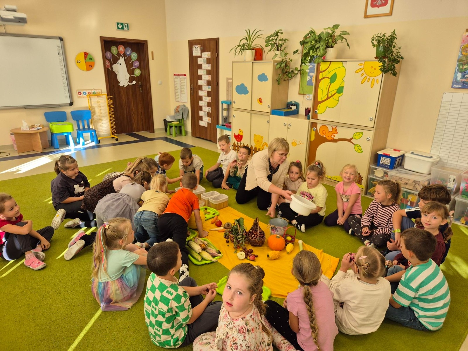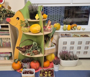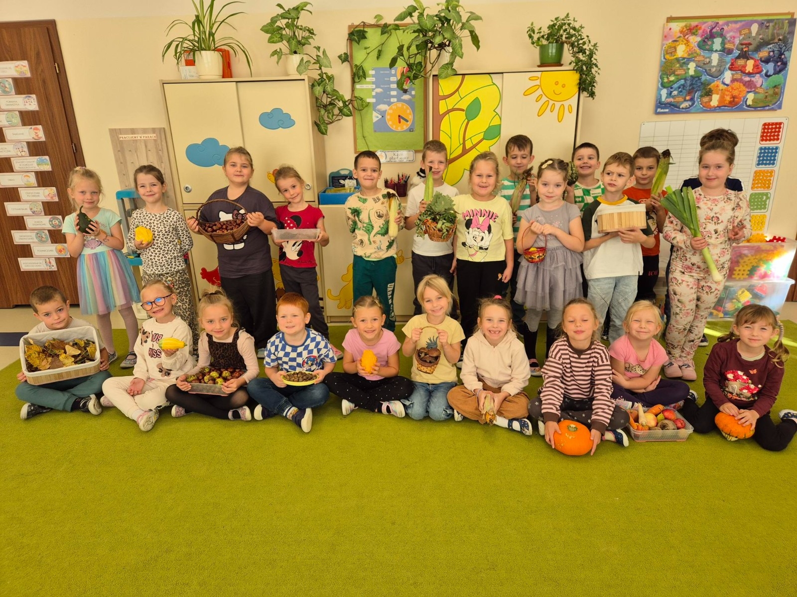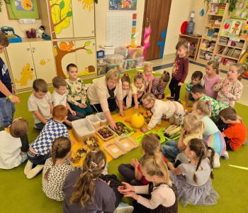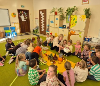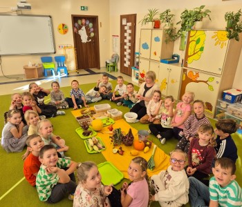 Jesień to wyjątkowa pora roku pełna kolorów, zapachów i smaków. Muminki przekonały się o tym podczas zajęć tematycznych poświęconych zebranym na spacerach darom jesieni. Kasztany, żołędzie, kolorowe liście, dynie to skarby, które wzbudzają ciekawość dzieci. Przedszkolacy rozpoznawali ich kształty, kolory, faktury i z zapałem układali w kąciku przyrody segregując według podanych cech.