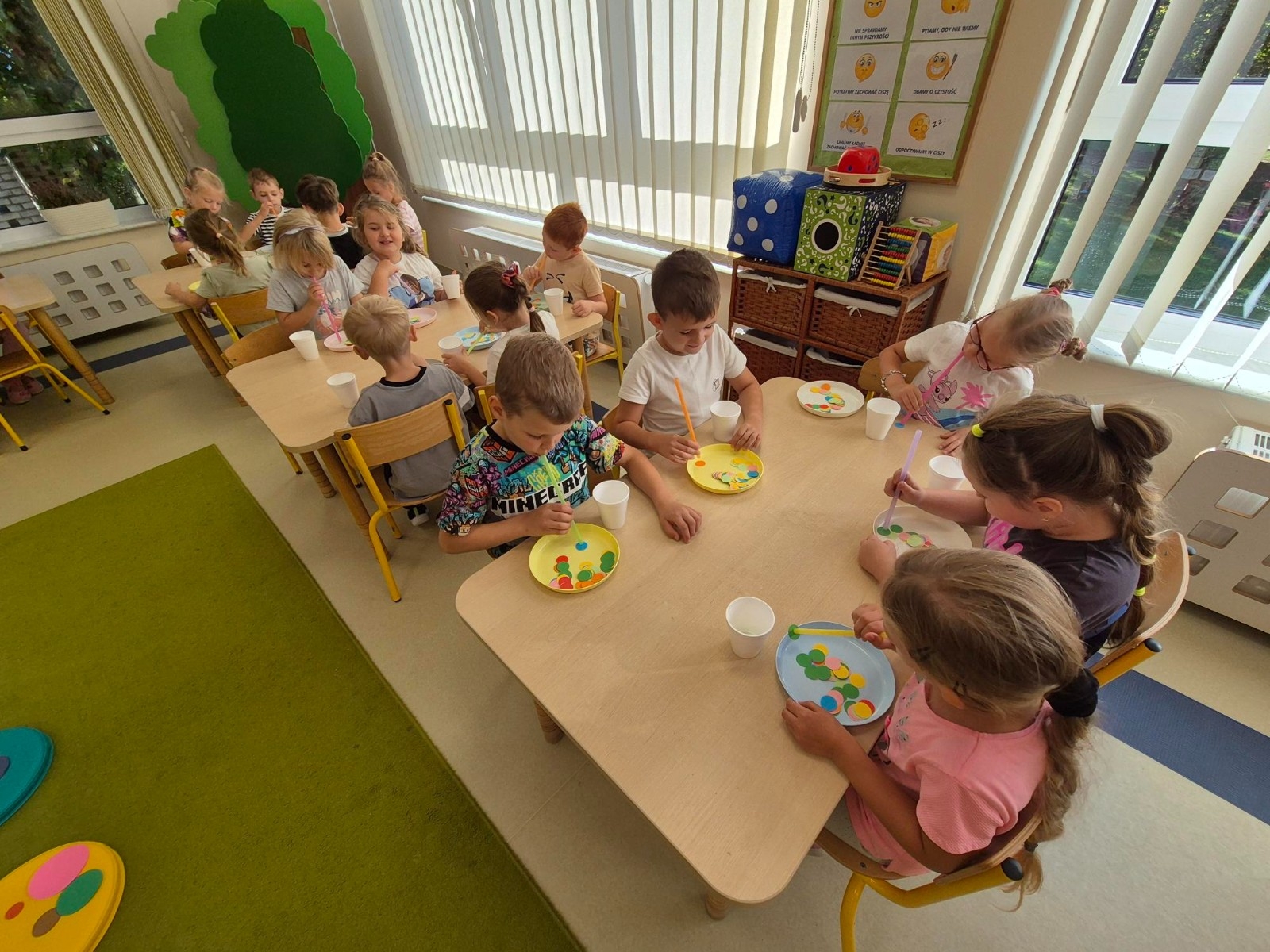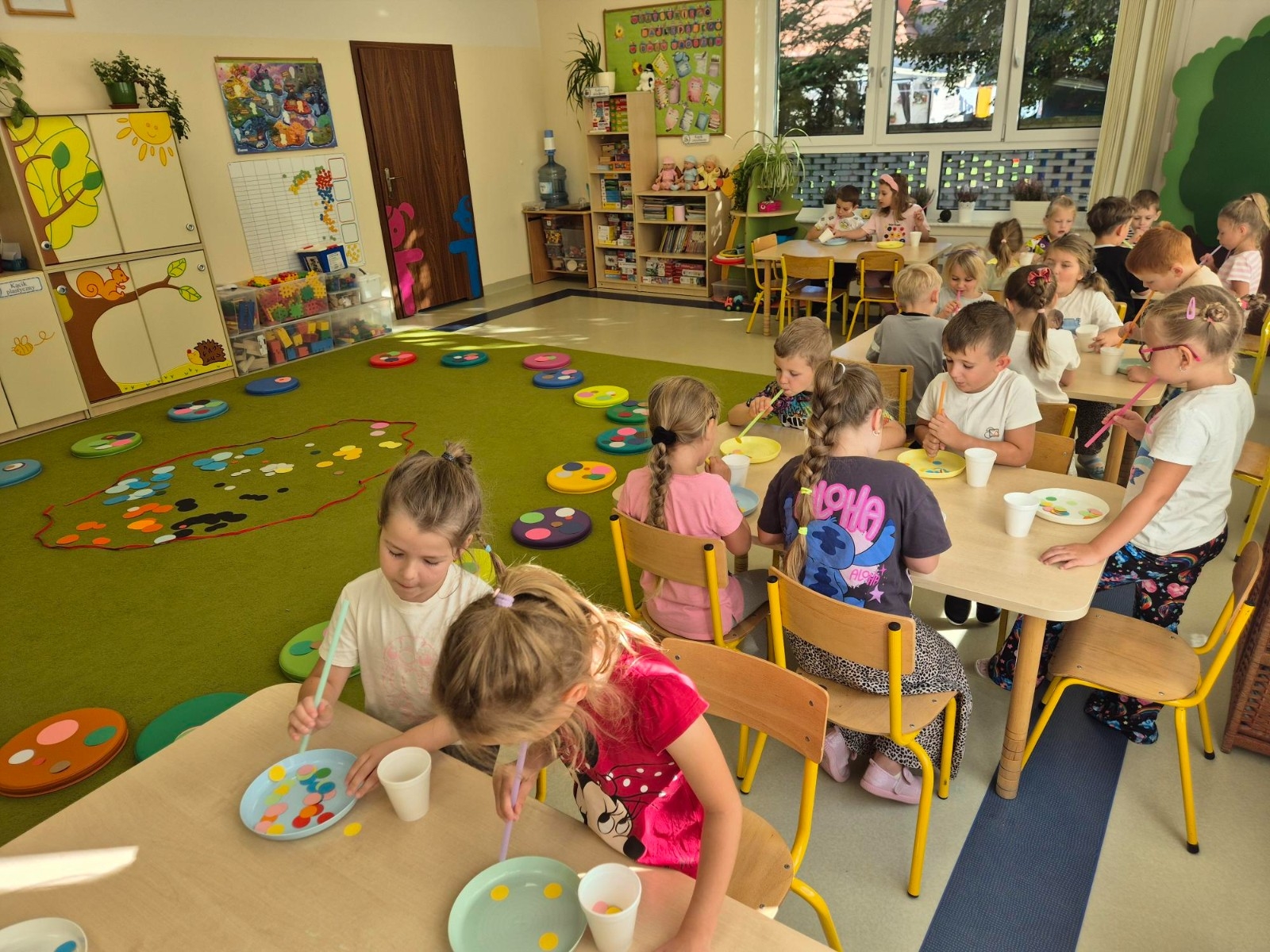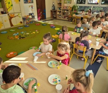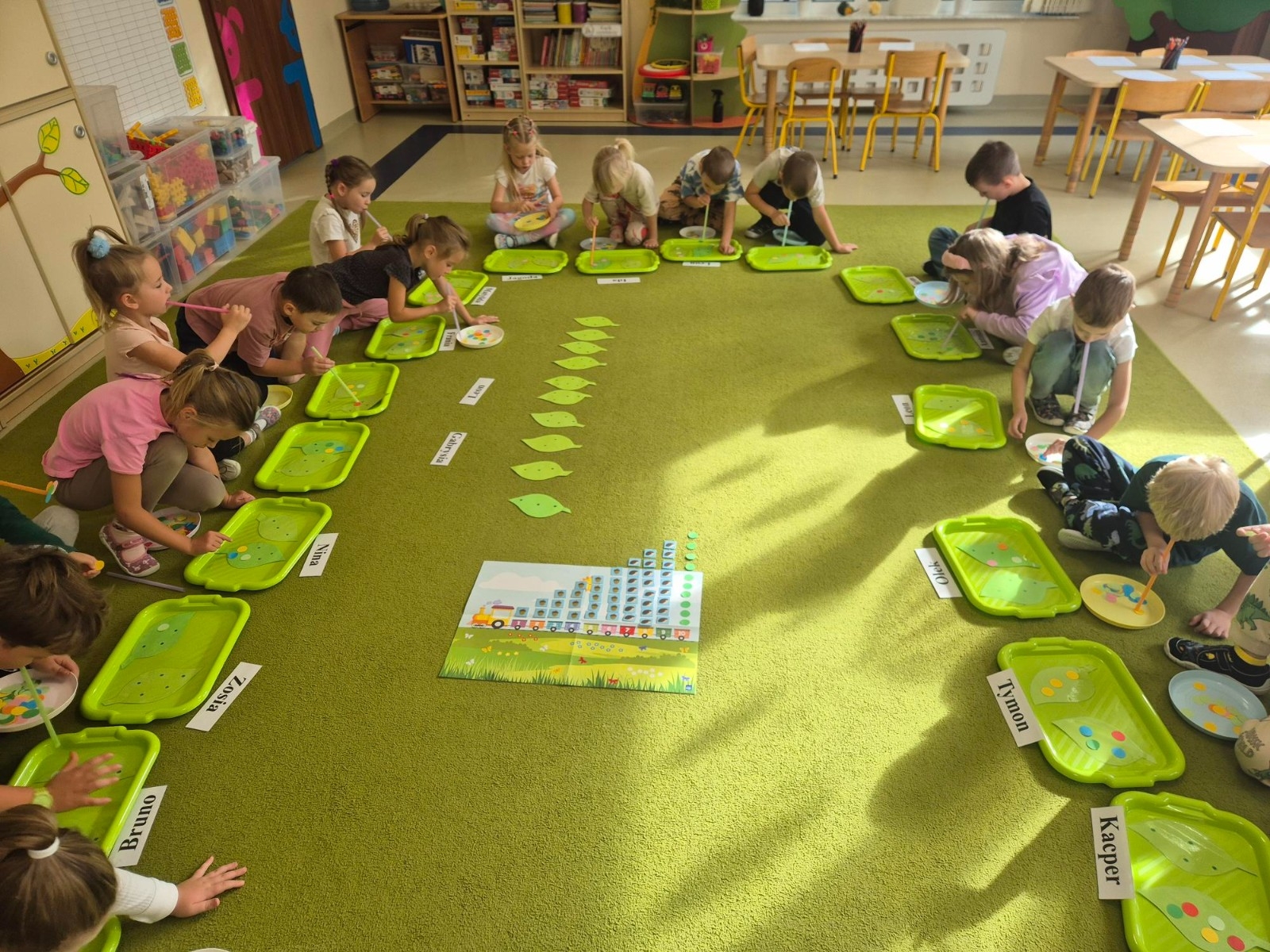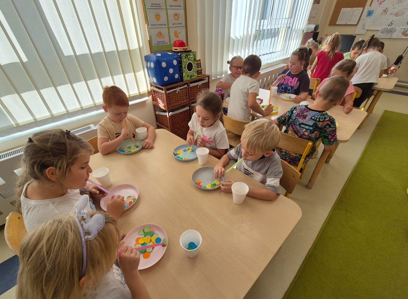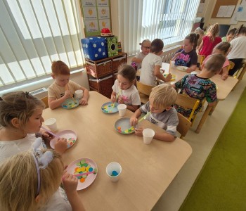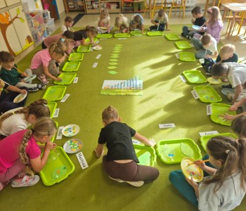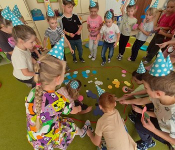 Najwięcej radości sprawiło dzieciom przenoszenie papierowych kółek za pomocą słomki – wystarczyło wciągnąć powietrze, by element „przykleił się” i można go było przenieść w wyznaczone miejsce. „Kolorowa matematyka” połączyła naukę z ruchem umożliwiając rozwijanie kompetencji matematycznych oraz spostrzegawczości, koordynacji wzrokowo-ruchowej i koncentracji.