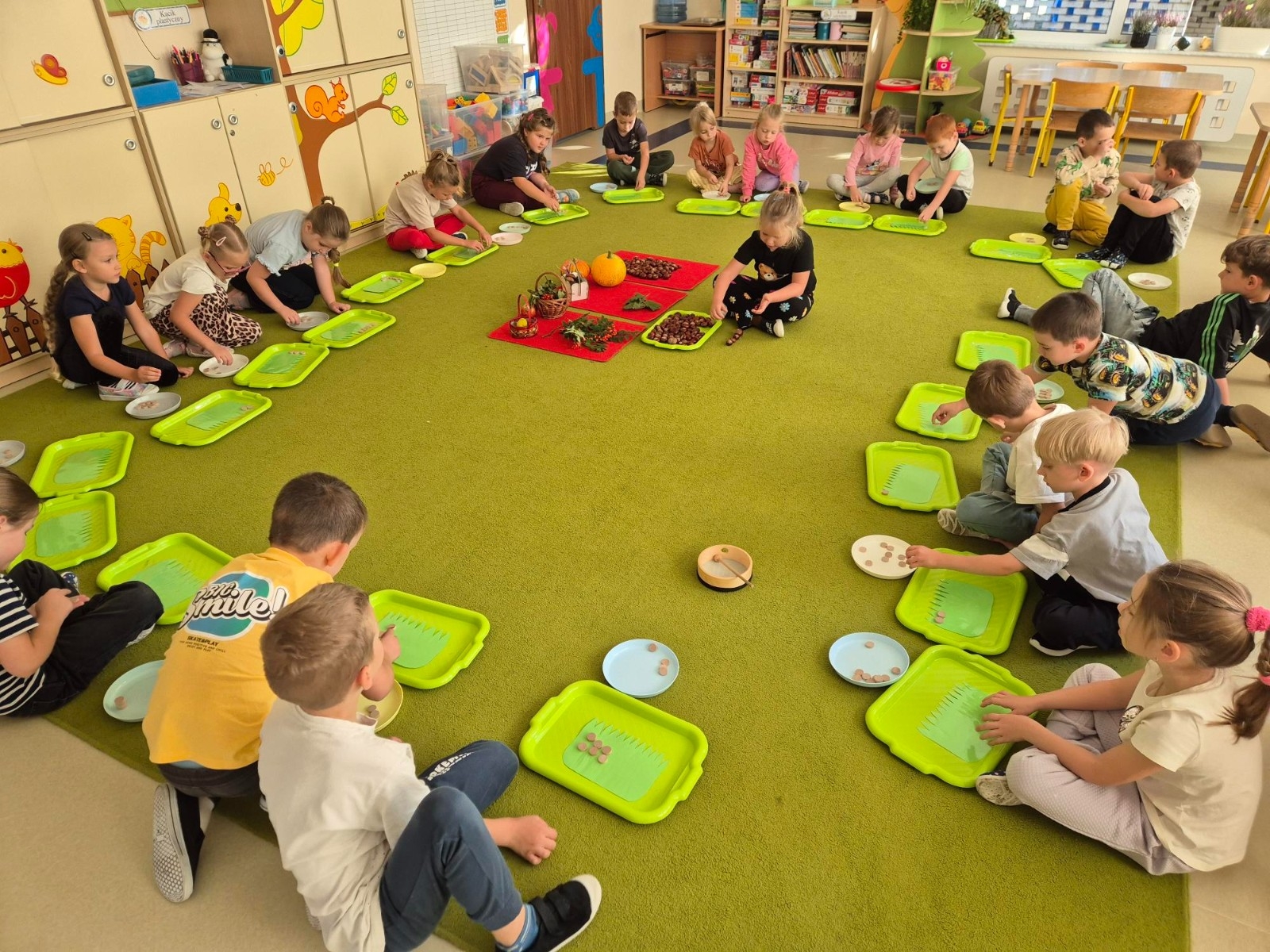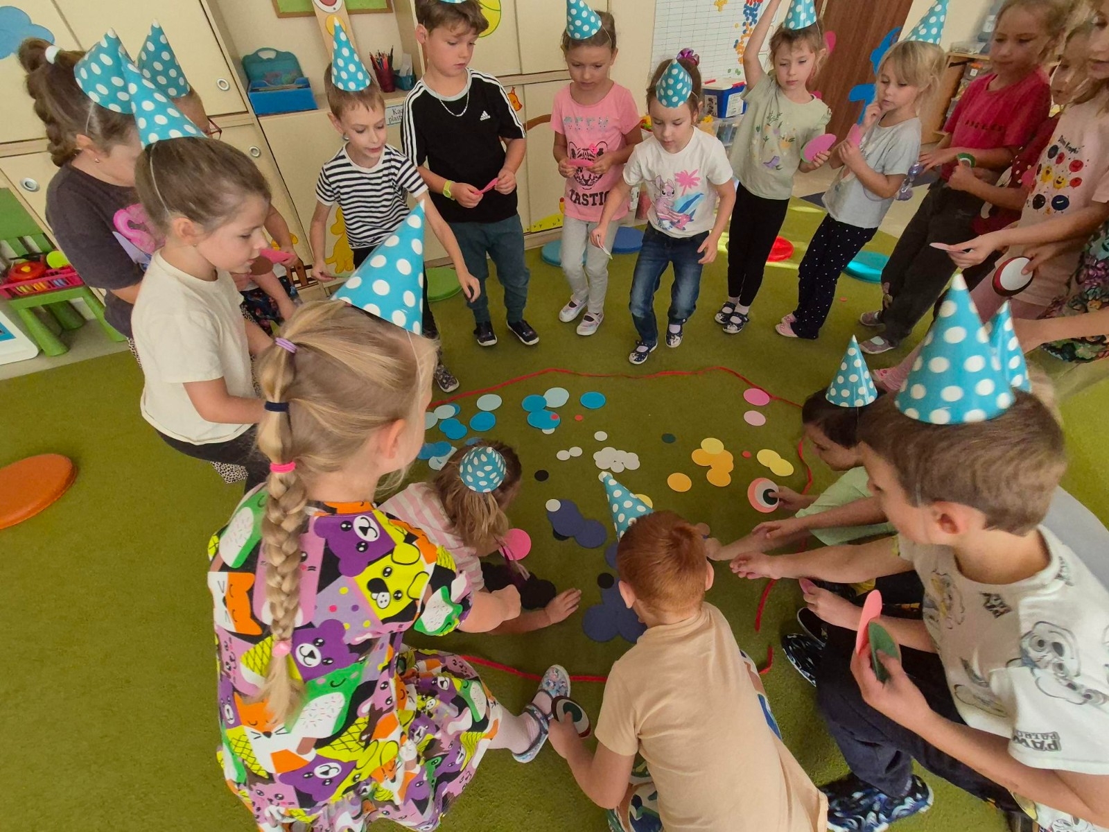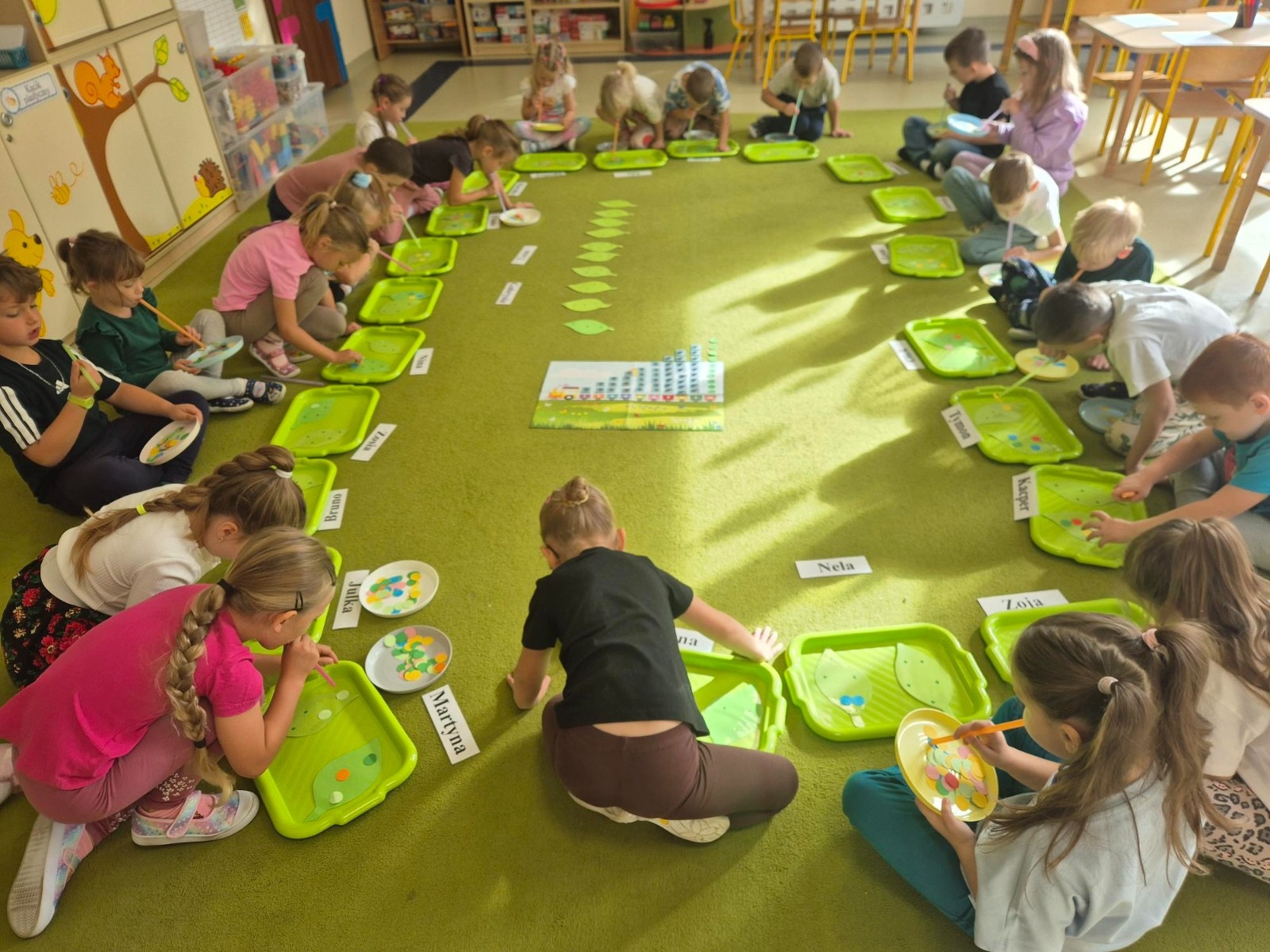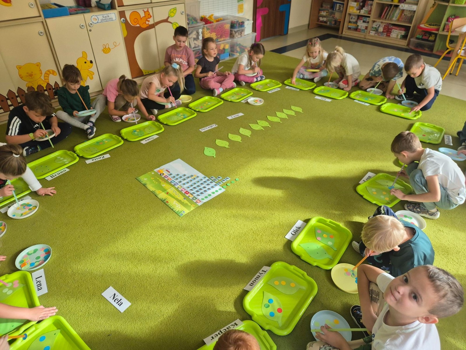 Najwięcej radości sprawiło dzieciom przenoszenie papierowych kółek za pomocą słomki – wystarczyło wciągnąć powietrze, by element „przykleił się” i można go było przenieść w wyznaczone miejsce. „Kolorowa matematyka” połączyła naukę z ruchem umożliwiając rozwijanie kompetencji matematycznych oraz spostrzegawczości, koordynacji wzrokowo-ruchowej i koncentracji.