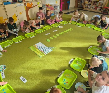 Podczas zajęć „Kolorowa matematyka” Muminki utrwalały umiejętność liczenia i rozpoznawania kolorów. Przedszkolaki liczyły kolorowe koła, dodawały ilość kół umieszczonych na dwóch liściach, utrwalając działania w zakresie 10. Ćwiczyły również pojęcia strony lewej i prawej układając elementy na odpowiednich miejscach.