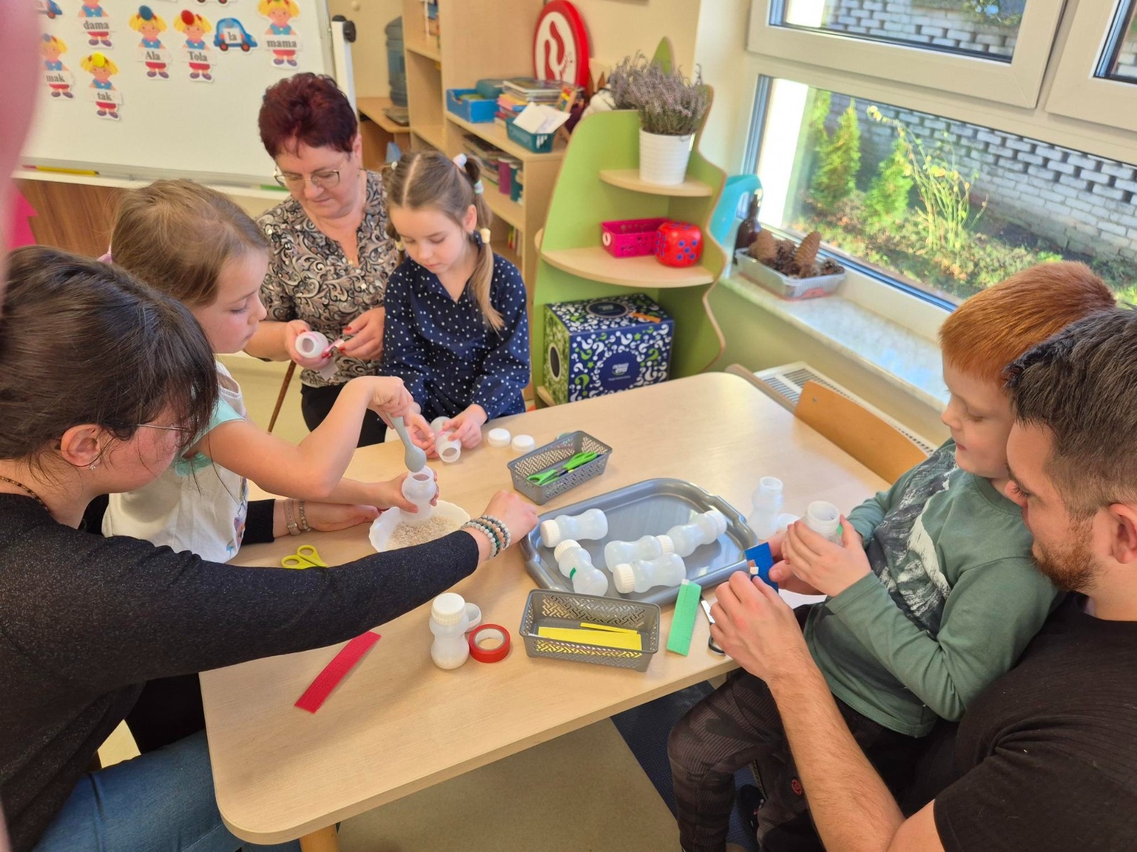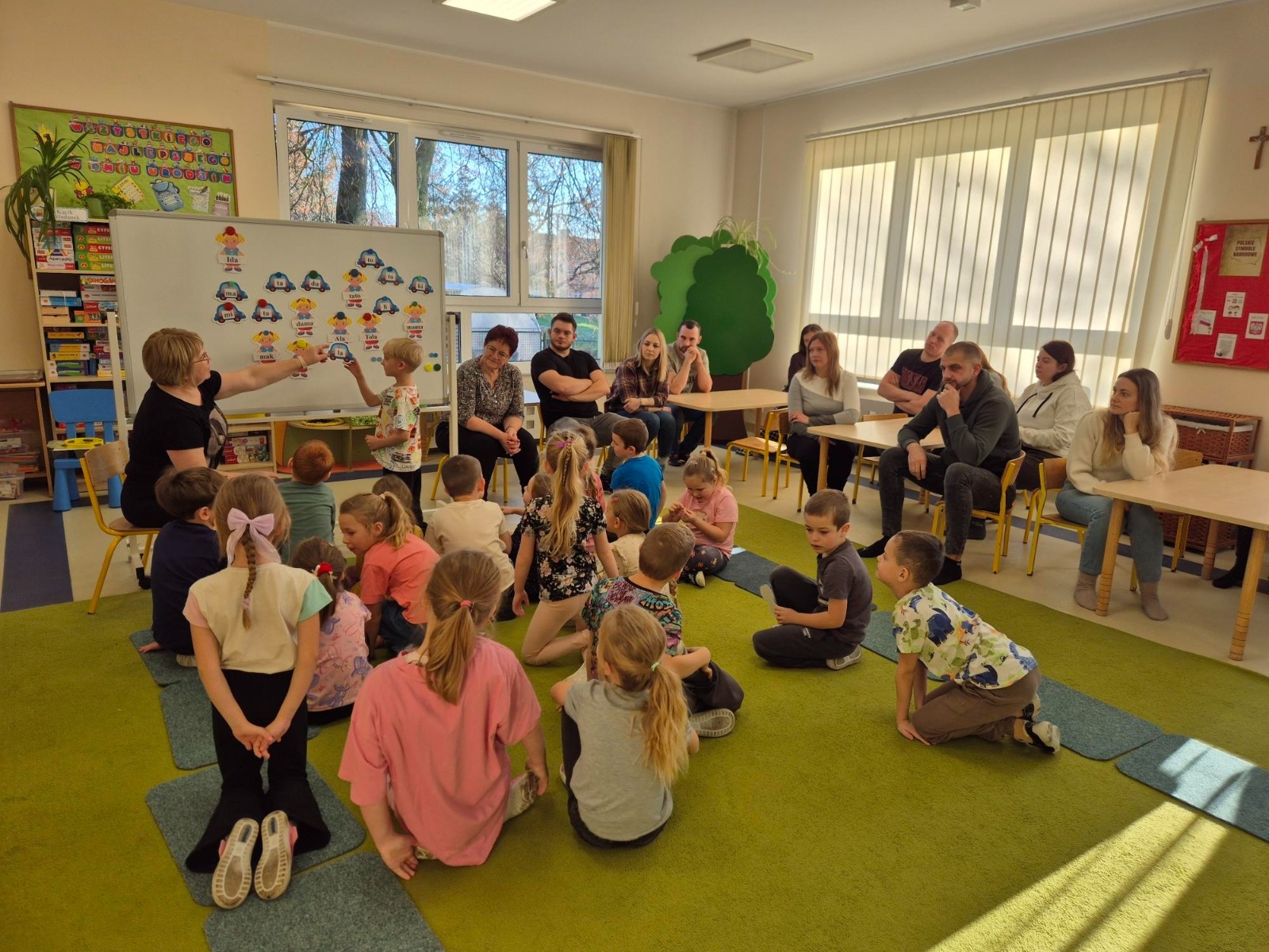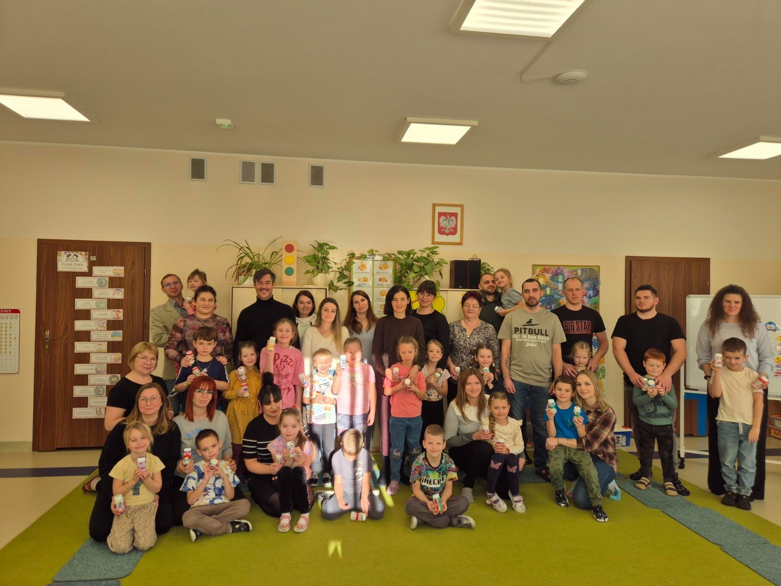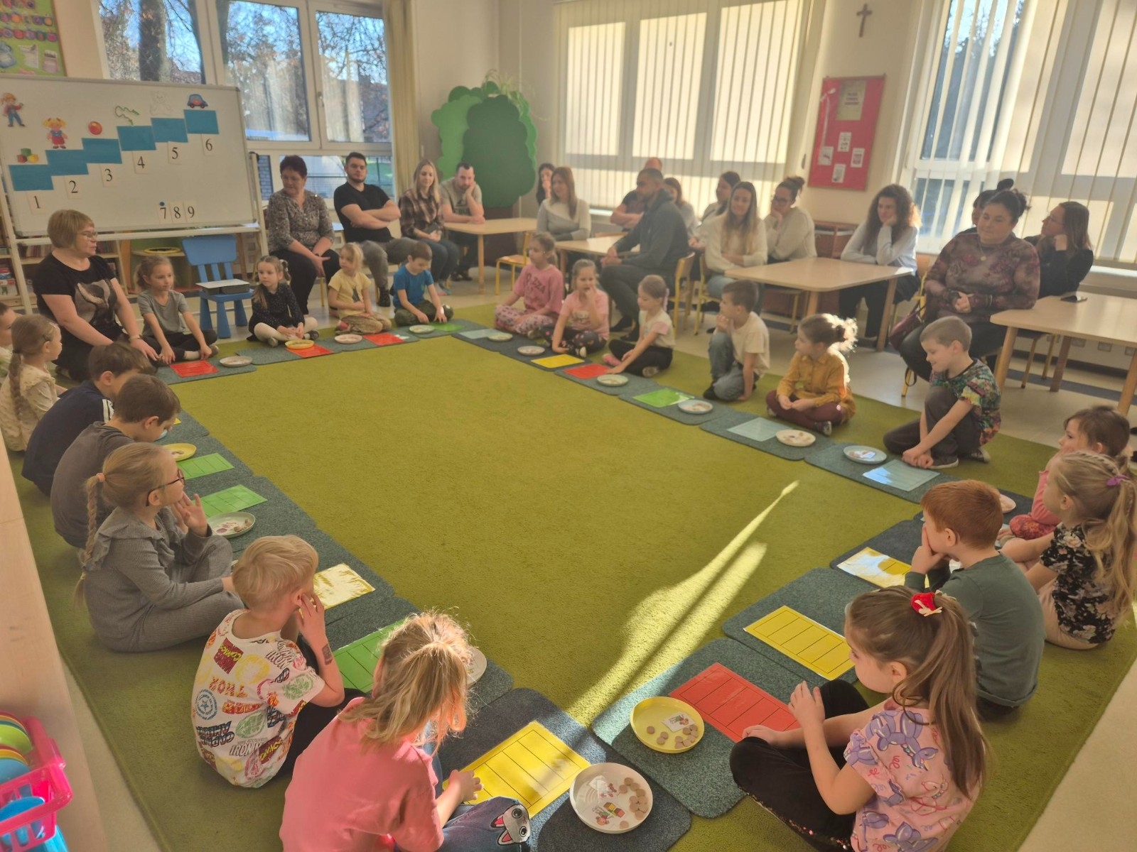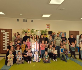 Na początku dzieci witały rodziców piosenką, a następnie słuchały opowiadania opartego na wierszu Anny Łady Grodzickiej pt. „Zgubione zabawki”. Historia ilustrowana była obrazkami, które zostały wykorzystane do dalszych działań. Dzieci porządkowały kartoniki z cyframi i określały kolejność zabawek za pomocą liczebników porządkowych. Podczas zabawy „Matematyczne piłki” przedszkolaki liczyły, rozpoznawały cyfry i wykonywały działania dodawania na konkretach. W zabawie „Sklep z zabawkami” dzieci dzieliły wyrazy na sylaby oraz wyodrębniały głoski w nagłosie. Dzięki temu ćwiczyły słuch fonematyczny, który jest bardzo ważny w procesie nauki czytania. Podczas „Czytania na dywanie” odważnie wybierały sylaby lub krótkie zdania i próbowały je odczytywać zgodnie z własnym tempem i możliwościami. Na zakończenie wspólnie z rodzicami stworzyliśmy instrumenty, a cała grupa zamieniła się w orkiestrę. Była to okazja do współdziałania, twórczej ekspresji i radosnego podsumowania spotkania.
