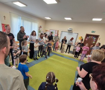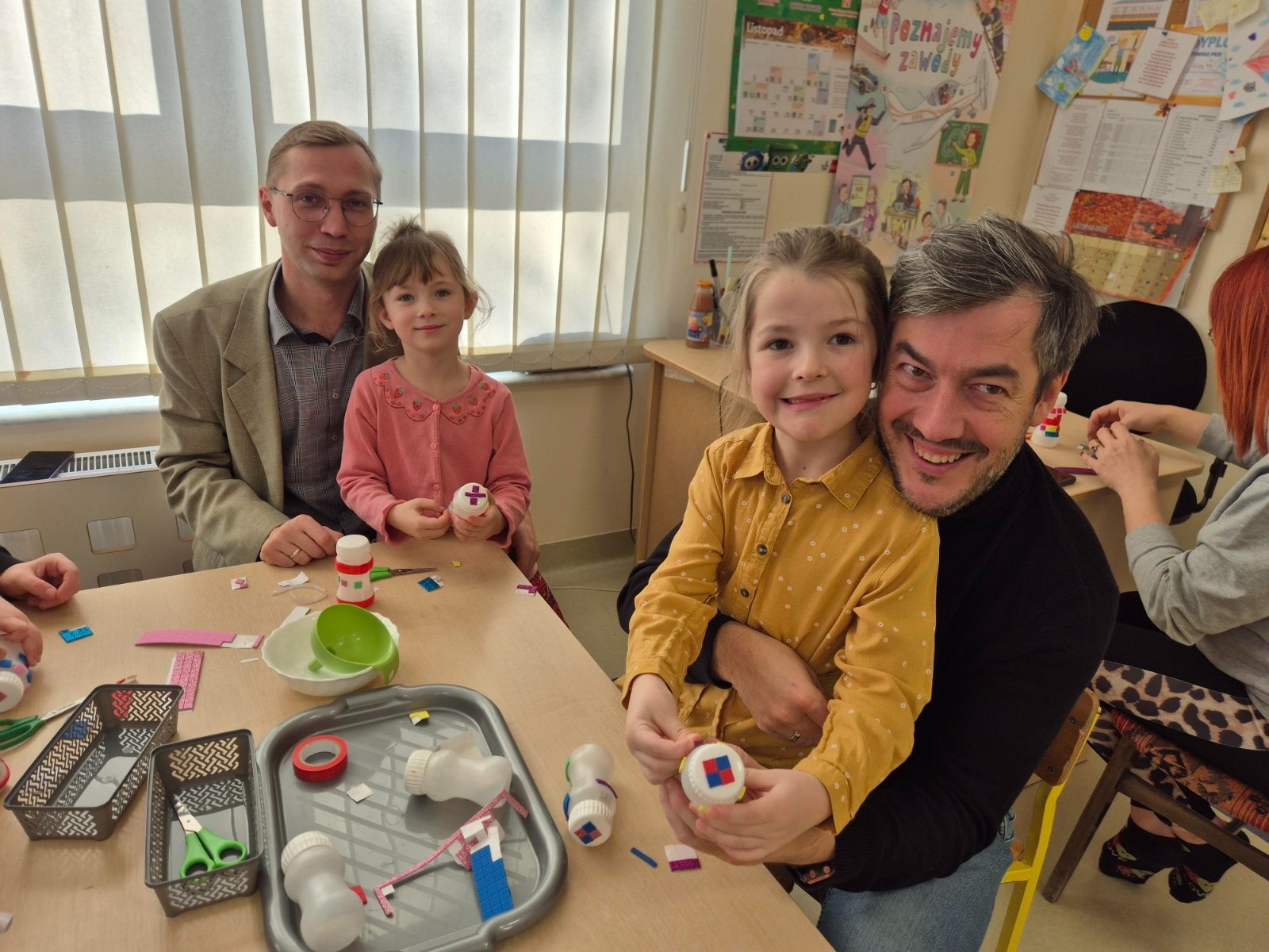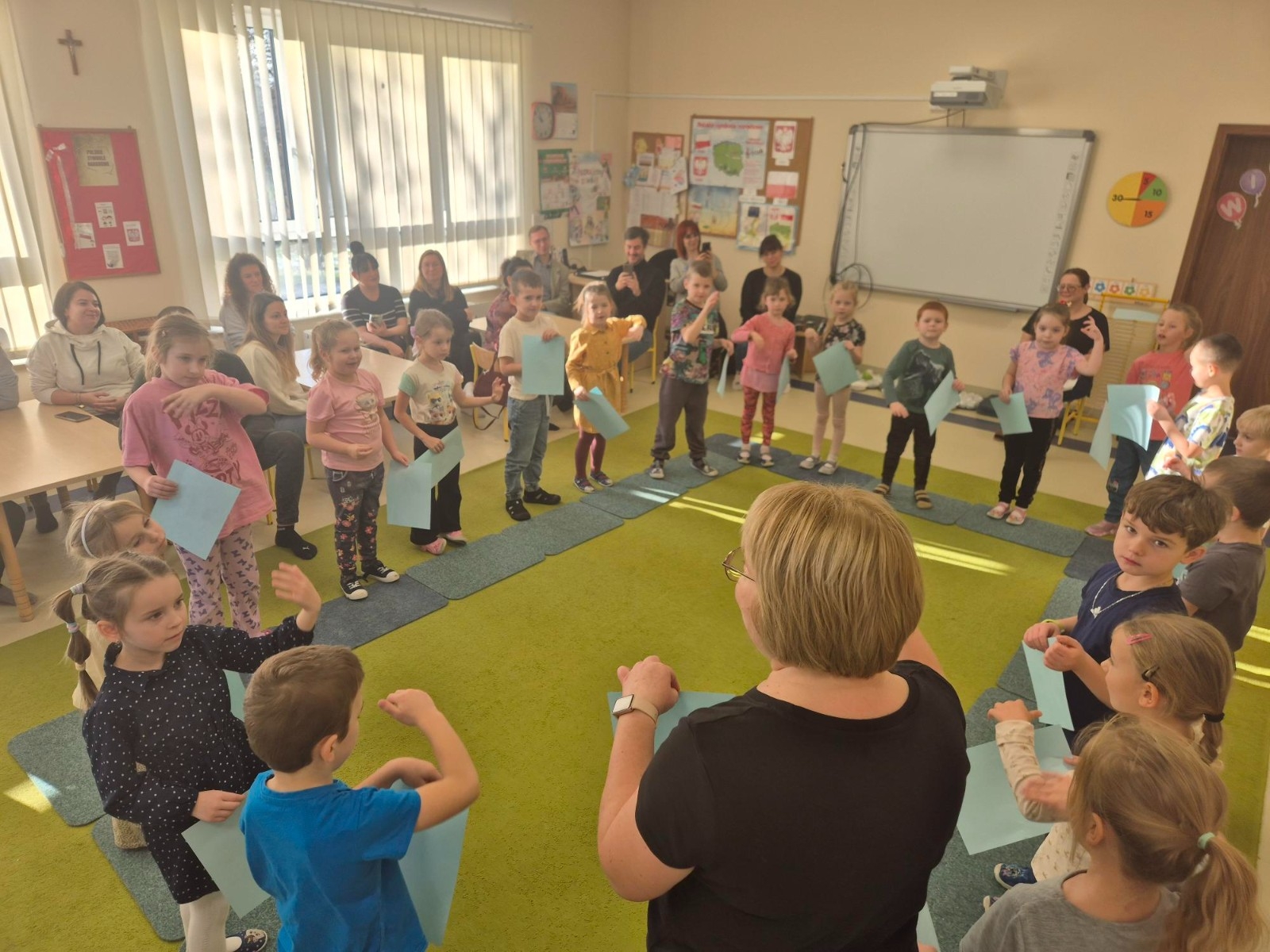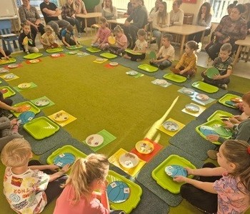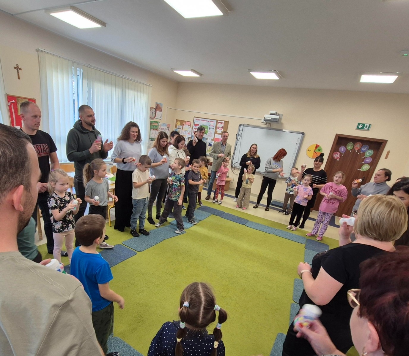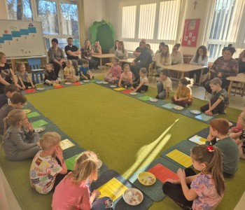 Na początku dzieci witały rodziców piosenką, a następnie słuchały opowiadania opartego na wierszu Anny Łady Grodzickiej pt. „Zgubione zabawki”. Historia ilustrowana była obrazkami, które zostały wykorzystane do dalszych działań. Dzieci porządkowały kartoniki z cyframi i określały kolejność zabawek za pomocą liczebników porządkowych. Podczas zabawy „Matematyczne piłki” przedszkolaki liczyły, rozpoznawały cyfry i wykonywały działania dodawania na konkretach. W zabawie „Sklep z zabawkami” dzieci dzieliły wyrazy na sylaby oraz wyodrębniały głoski w nagłosie. Dzięki temu ćwiczyły słuch fonematyczny, który jest bardzo ważny w procesie nauki czytania. Podczas „Czytania na dywanie” odważnie wybierały sylaby lub krótkie zdania i próbowały je odczytywać zgodnie z własnym tempem i możliwościami. Na zakończenie wspólnie z rodzicami stworzyliśmy instrumenty, a cała grupa zamieniła się w orkiestrę. Była to okazja do współdziałania, twórczej ekspresji i radosnego podsumowania spotkania.