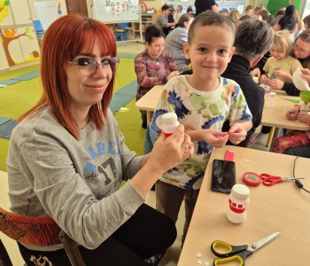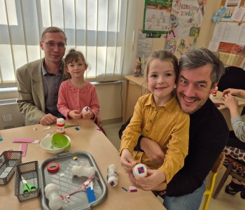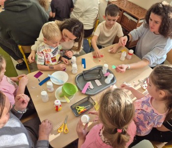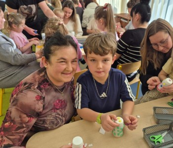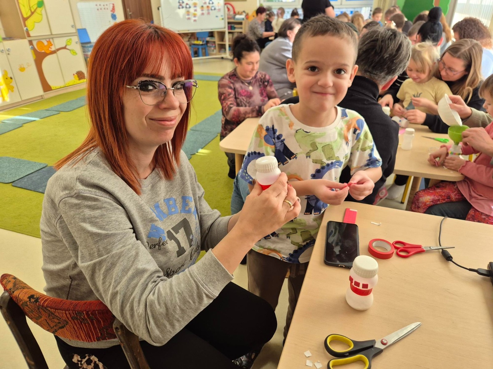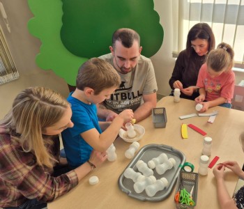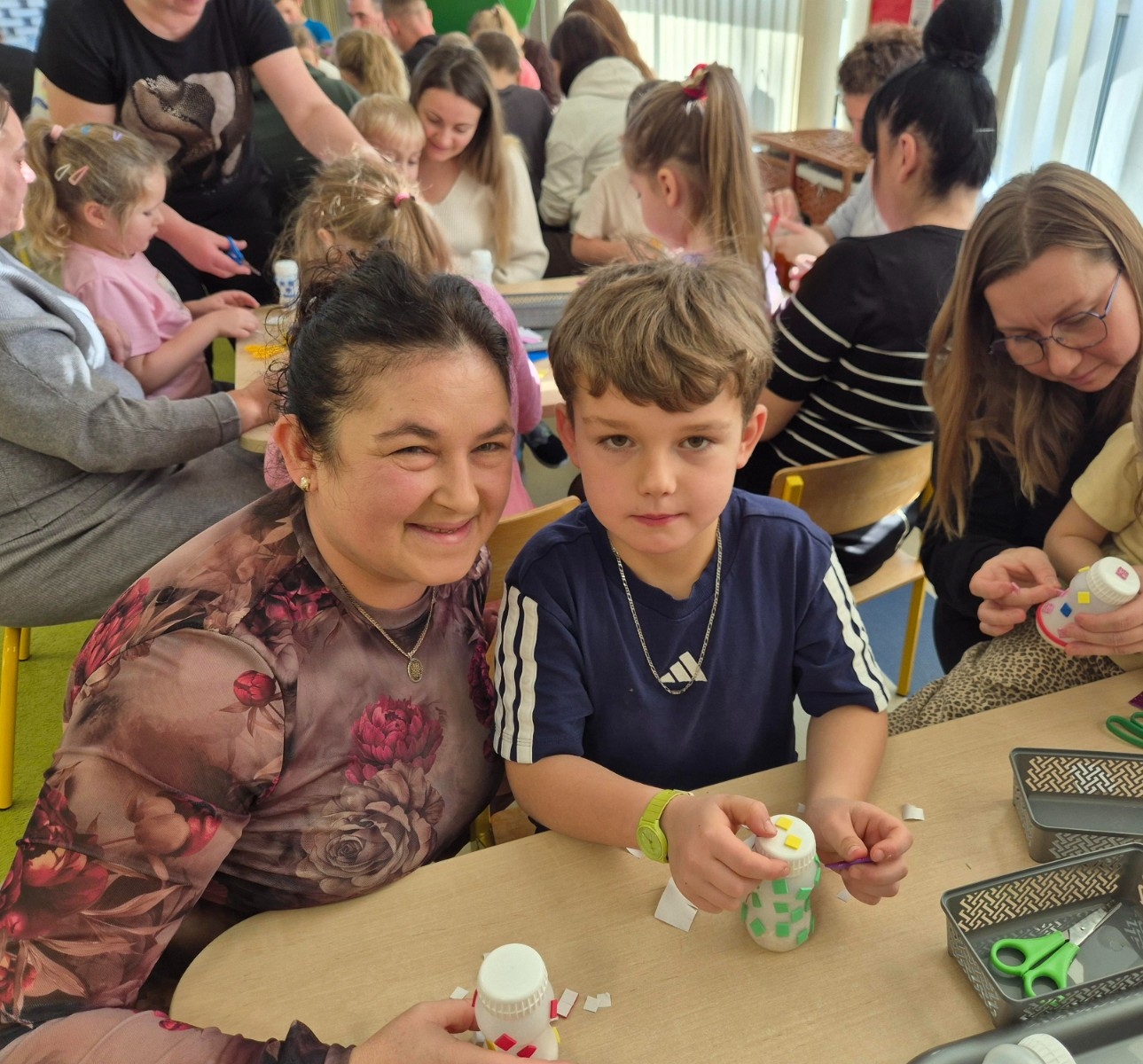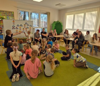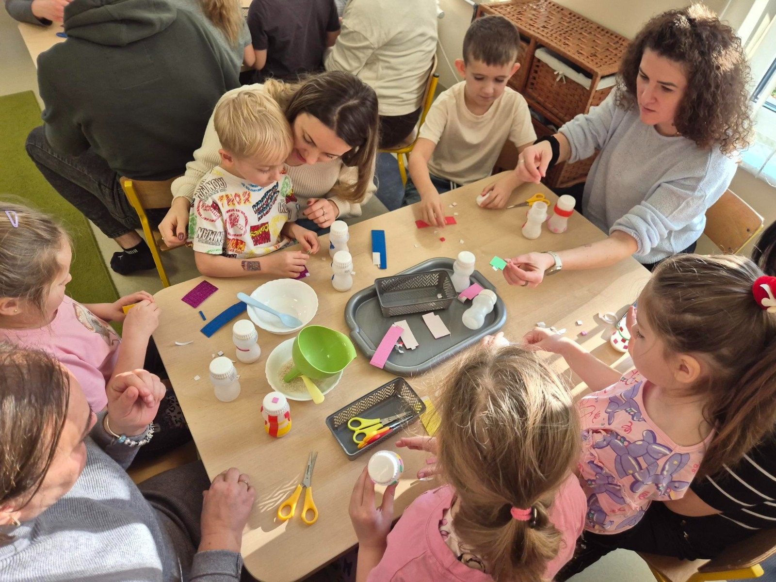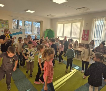 Na początku dzieci witały rodziców piosenką, a następnie słuchały opowiadania opartego na wierszu Anny Łady Grodzickiej pt. „Zgubione zabawki”. Historia ilustrowana była obrazkami, które zostały wykorzystane do dalszych działań. Dzieci porządkowały kartoniki z cyframi i określały kolejność zabawek za pomocą liczebników porządkowych. Podczas zabawy „Matematyczne piłki” przedszkolaki liczyły, rozpoznawały cyfry i wykonywały działania dodawania na konkretach. W zabawie „Sklep z zabawkami” dzieci dzieliły wyrazy na sylaby oraz wyodrębniały głoski w nagłosie. Dzięki temu ćwiczyły słuch fonematyczny, który jest bardzo ważny w procesie nauki czytania. Podczas „Czytania na dywanie” odważnie wybierały sylaby lub krótkie zdania i próbowały je odczytywać zgodnie z własnym tempem i możliwościami. Na zakończenie wspólnie z rodzicami stworzyliśmy instrumenty, a cała grupa zamieniła się w orkiestrę. Była to okazja do współdziałania, twórczej ekspresji i radosnego podsumowania spotkania.