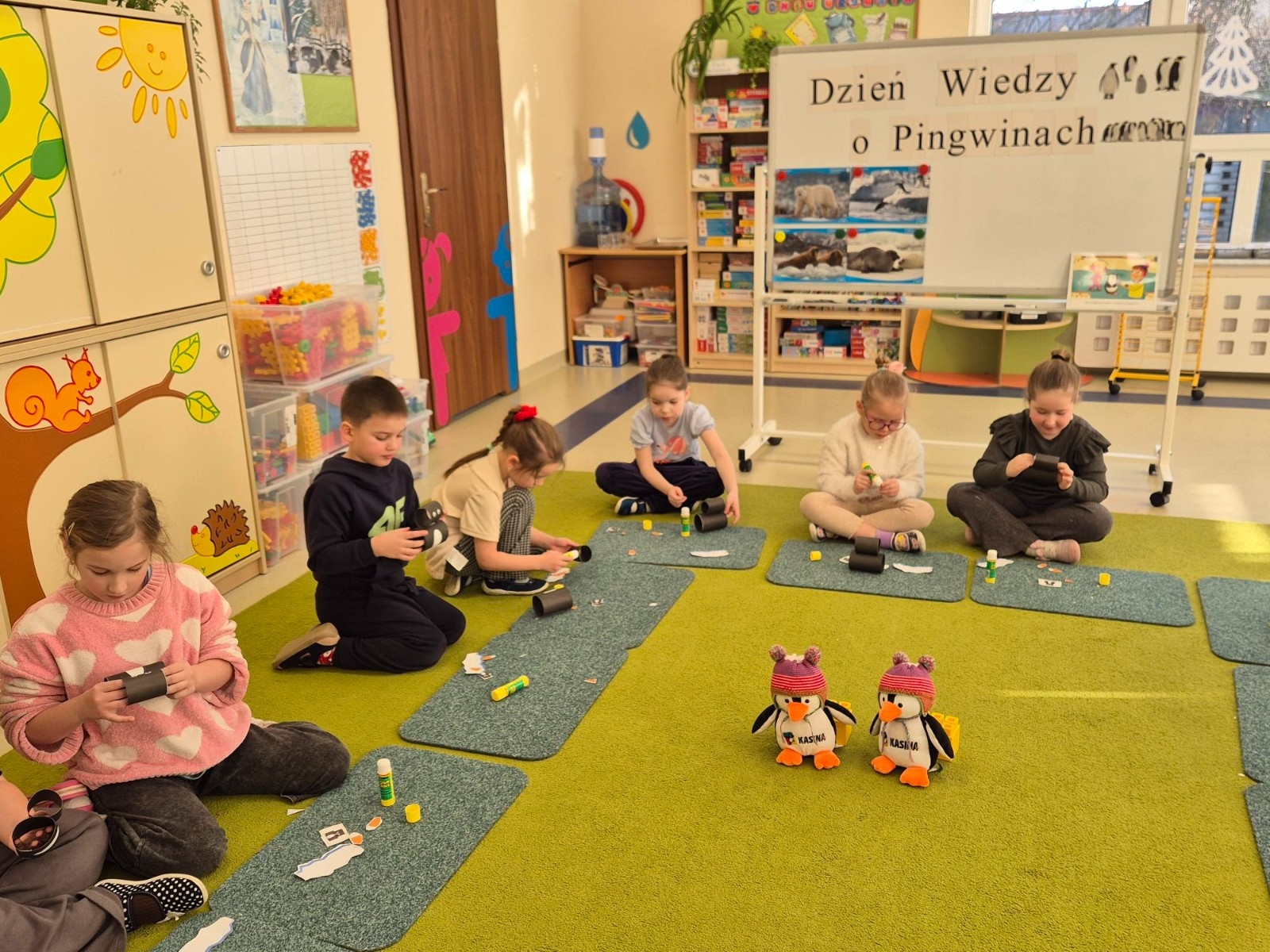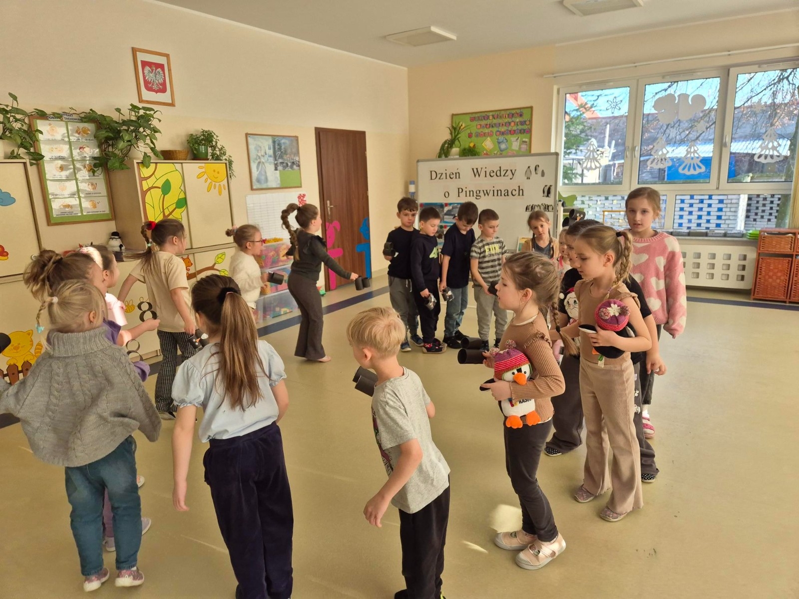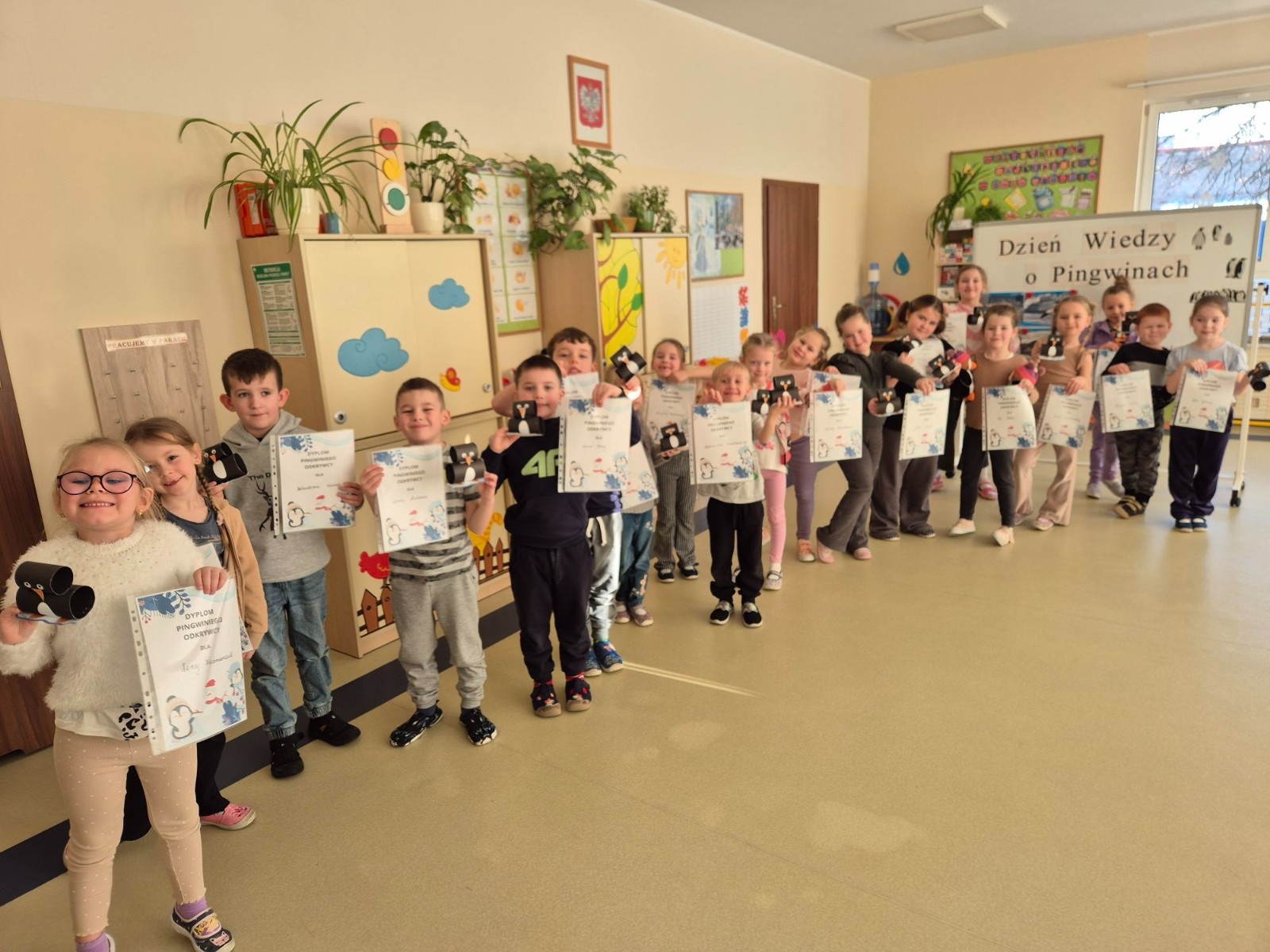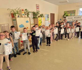 Swoją wiedzę sprawdziły w wesołym quizie, z którym poradziły sobie znakomicie – zapamiętały naprawdę mnóstwo ciekawostek! Nie zabrakło też pingwinich zabaw muzyczno-ruchowych – każdy na chwilę zamienił się w pingwina i otrzymał zabawne imię. Było dużo śmiechu i radosnego „chodzenia jak pingwin”. Ćwicząc sprawność manualną, dzieci wykonały piękne papierowe pingwiny, które wykorzystaliśmy do zajęcia matematycznego doskonaląc znajomość kierunków w przestrzeni. Na zakończenie tego wyjątkowego dnia wszyscy mali uczestnicy otrzymali Dyplom Pingwiniego Odkrywcy – bo każdy Muminek udowodnił, że zna się na pingwinach jak prawdziwy ekspert!