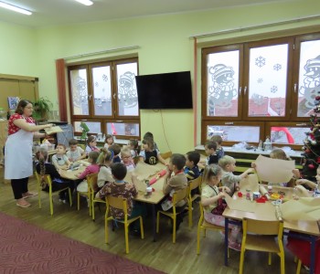 Pani Angelika, swoją pasją do gotowania i doświadczeniem kulinarnym, zarażała maluchy, które z wielkim zaangażowaniem wałkowały ciasto, wykrawały różnorodne kształty pierników oraz dekorowały je kolorowymi lukrami i posypkami. Uczestnicy warsztatów mieli okazję poznać tajniki wypieku pierników, a także nauczyć się, jak ważna jest precyzja i cierpliwość podczas pracy w kuchni. Wspólne pieczenie nie tylko sprawiło dzieciom mnóstwo radości, ale również pozwoliło na rozwijanie ich kreatywności oraz umiejętności manualnych. Dzięki pani Angelice maluchy mogły poczuć się jak prawdziwi kucharze, a atmosfera pełna radości i ciepła sprawiła, że warsztaty na długo pozostaną w ich pamięci. To była niezapomniana okazja do nauki, zabawy oraz wspólnego tworzenia świątecznych tradycji w przedszkolu!