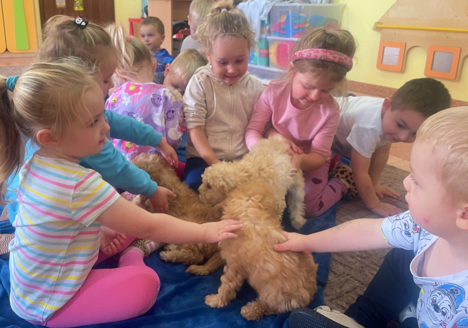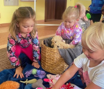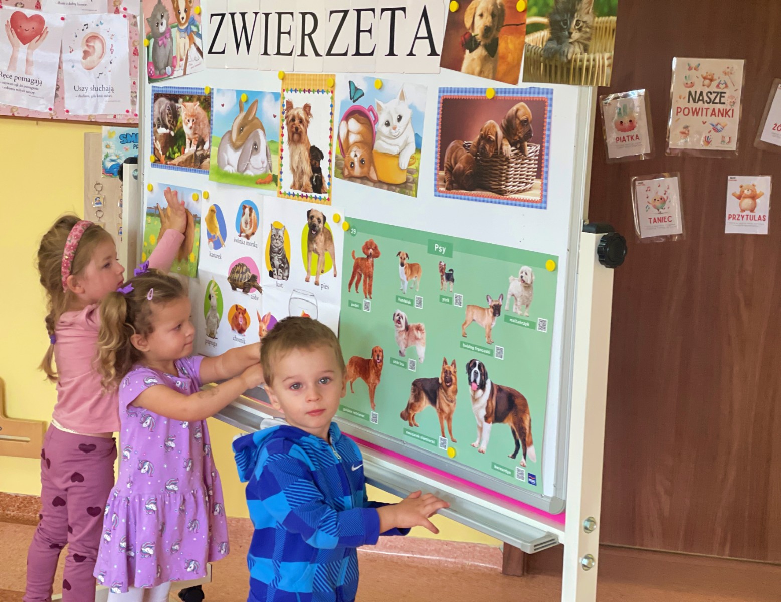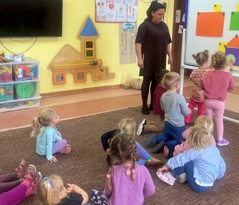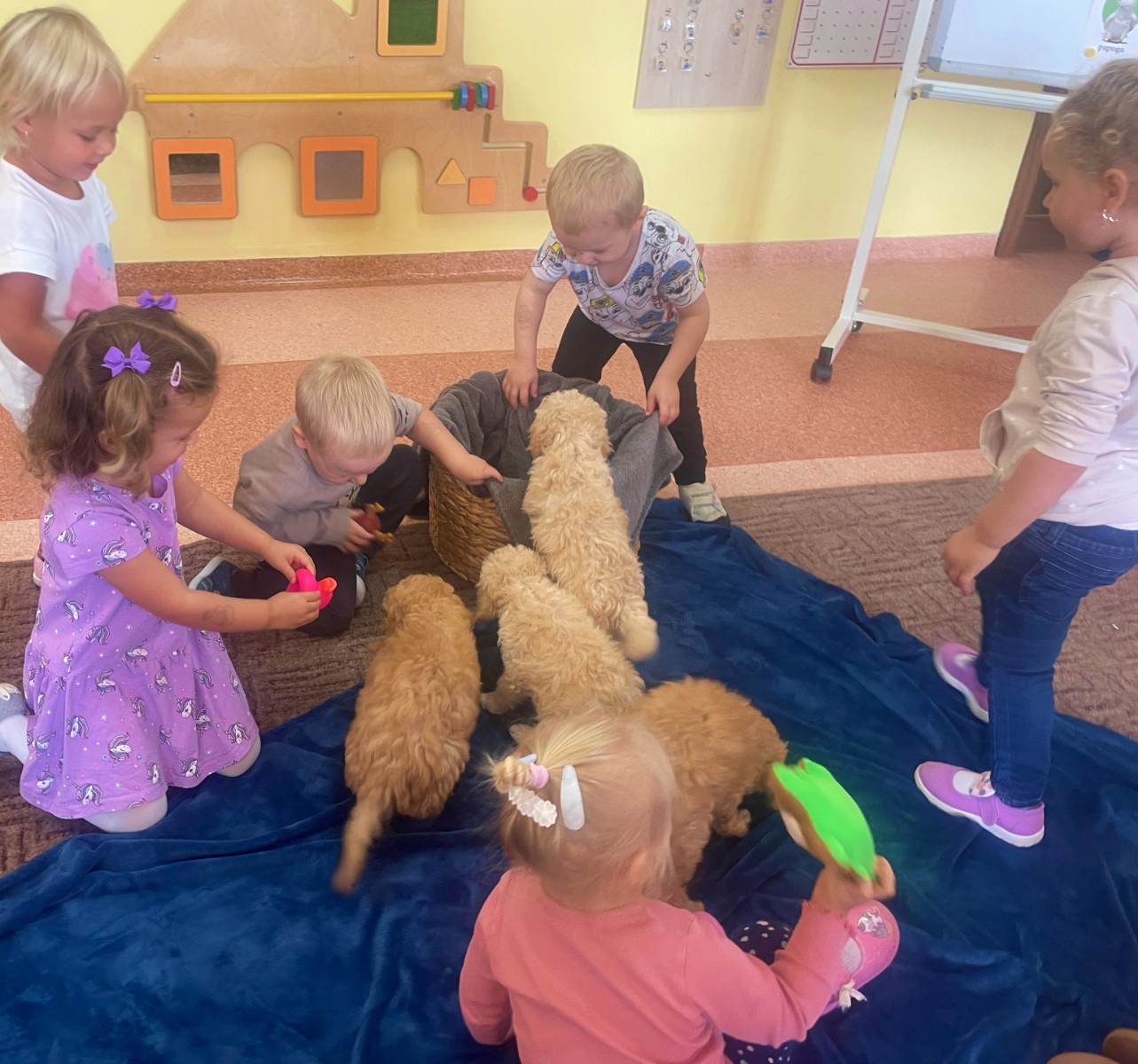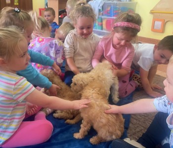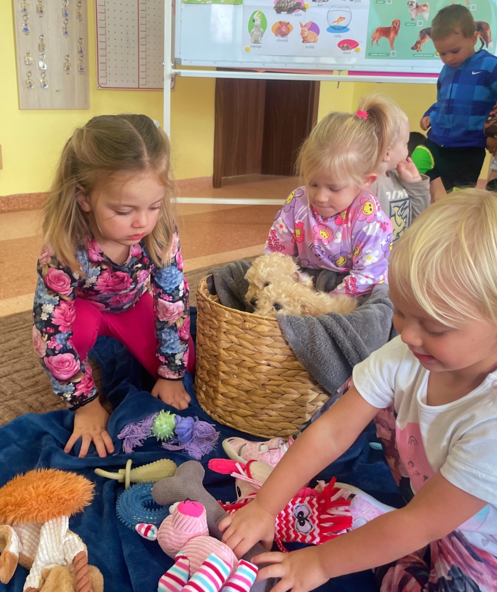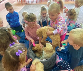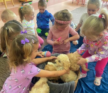 Dzieci z wielkim zaangażowaniem dzieliły się swoimi doświadczeniami i z dumą opowiadały o tym, jak pomagają w opiece nad zwierzątkami. Smerfy obejrzały obrazki przedstawiające różne zwierzęta domowe oraz dowiedziały się, że każde z nich potrzebuje jedzenia, wody, zabawy a przede wszystkim dużo miłości! Dzieci rozpoznawały zwierzęta po ich odgłosach; przy tym dużo śmiechu, zwłaszcza gdy próbowały naśladować zwierzątka. Każdy przedszkolak wykonał swoją pracę plastyczną: pieska i domek dla Pupila. Prace zostały wywieszone w holu i stworzyły piękną galerię „Smerfowych Pupili”. Na zakończenie wielką radość sprawiły dzieciom szczeniaczki, które odwiedziły salę Smerfów. Celem przedsięwzięcia było uświadomienie najmłodszym, że zwierzęta to nasi przyjaciele o których trzeba dbać każdego dnia. Dzięki takim doświadczeniom Smerfy dowiedziały się, jak ważna jest empatia wobec zwierząt, a zdobyta wiedza z pewnością pomoże im w codziennym życiu i wychowywaniu się w duchu odpowiedzialności.