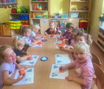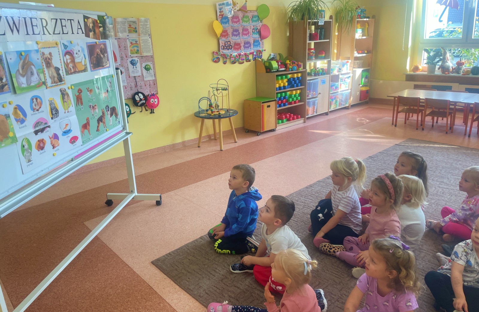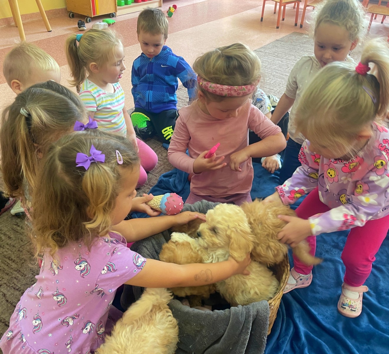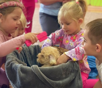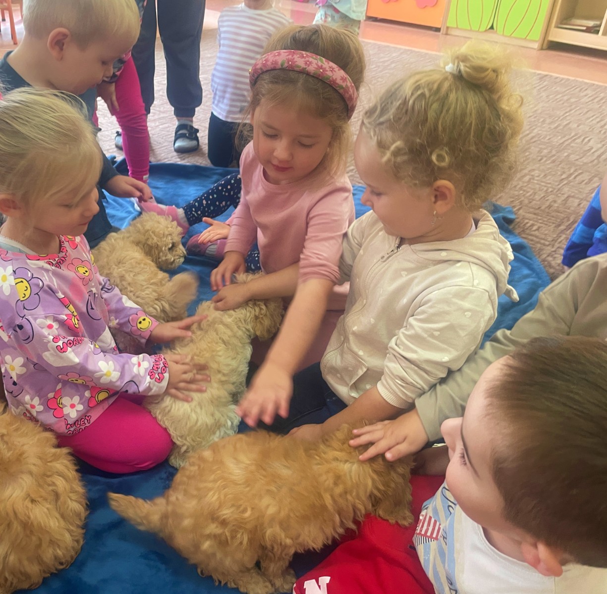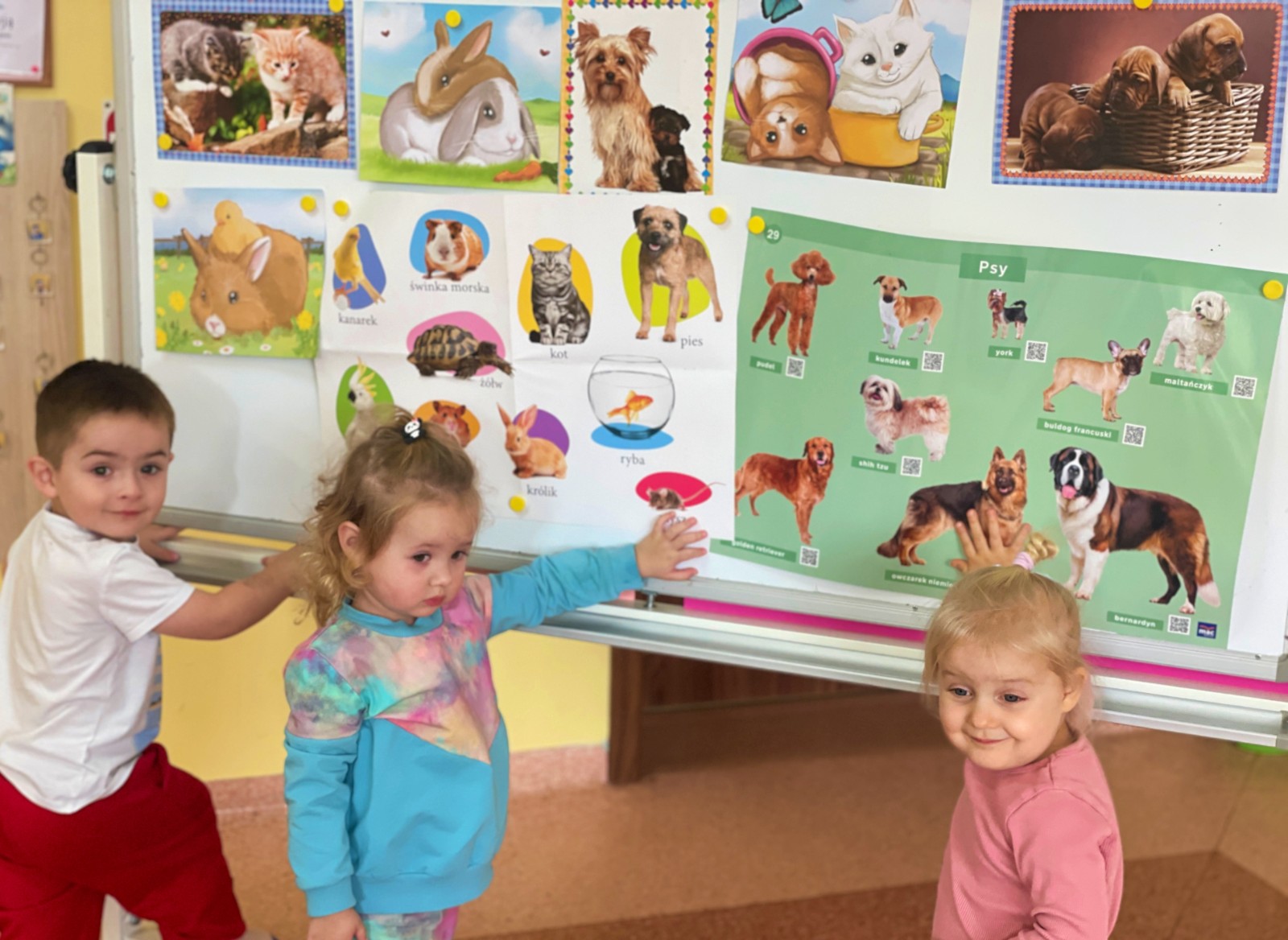 Dzieci z wielkim zaangażowaniem dzieliły się swoimi doświadczeniami i z dumą opowiadały o tym, jak pomagają w opiece nad zwierzątkami. Smerfy obejrzały obrazki przedstawiające różne zwierzęta domowe oraz dowiedziały się, że każde z nich potrzebuje jedzenia, wody, zabawy a przede wszystkim dużo miłości! Dzieci rozpoznawały zwierzęta po ich odgłosach; przy tym dużo śmiechu, zwłaszcza gdy próbowały naśladować zwierzątka. Każdy przedszkolak wykonał swoją pracę plastyczną: pieska i domek dla Pupila. Prace zostały wywieszone w holu i stworzyły piękną galerię „Smerfowych Pupili”. Na zakończenie wielką radość sprawiły dzieciom szczeniaczki, które odwiedziły salę Smerfów. Celem przedsięwzięcia było uświadomienie najmłodszym, że zwierzęta to nasi przyjaciele o których trzeba dbać każdego dnia. Dzięki takim doświadczeniom Smerfy dowiedziały się, jak ważna jest empatia wobec zwierząt, a zdobyta wiedza z pewnością pomoże im w codziennym życiu i wychowywaniu się w duchu odpowiedzialności.