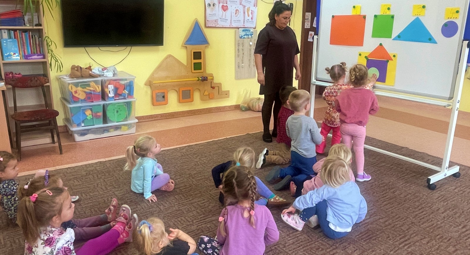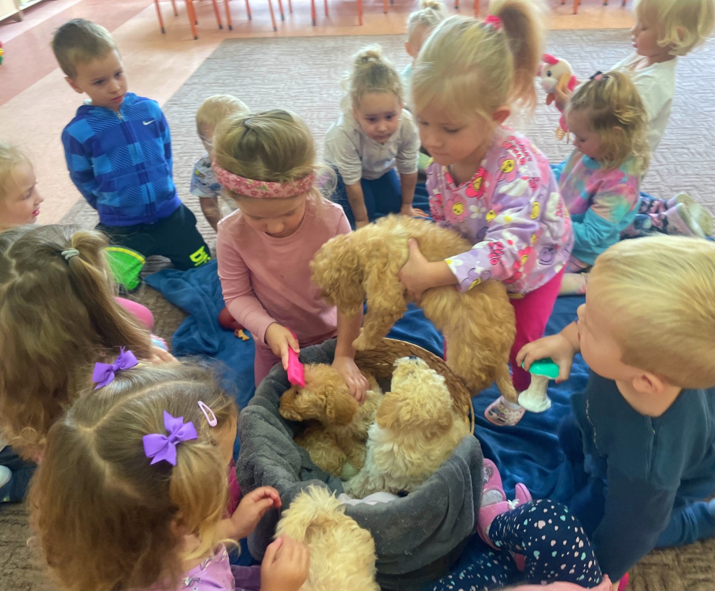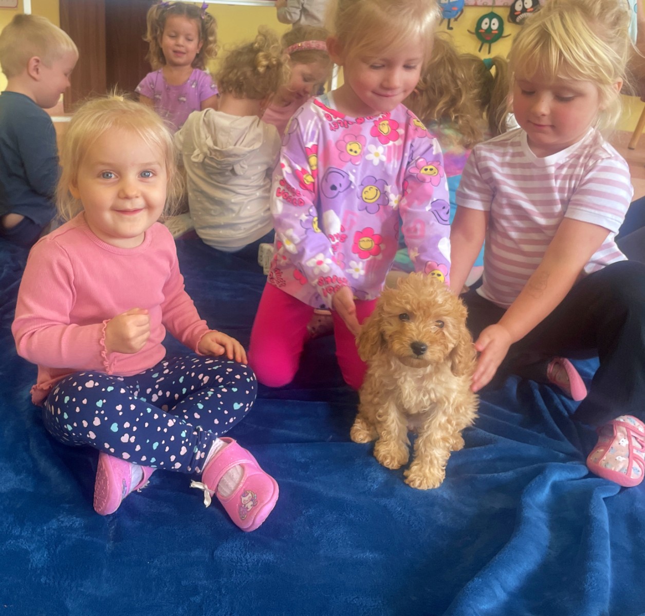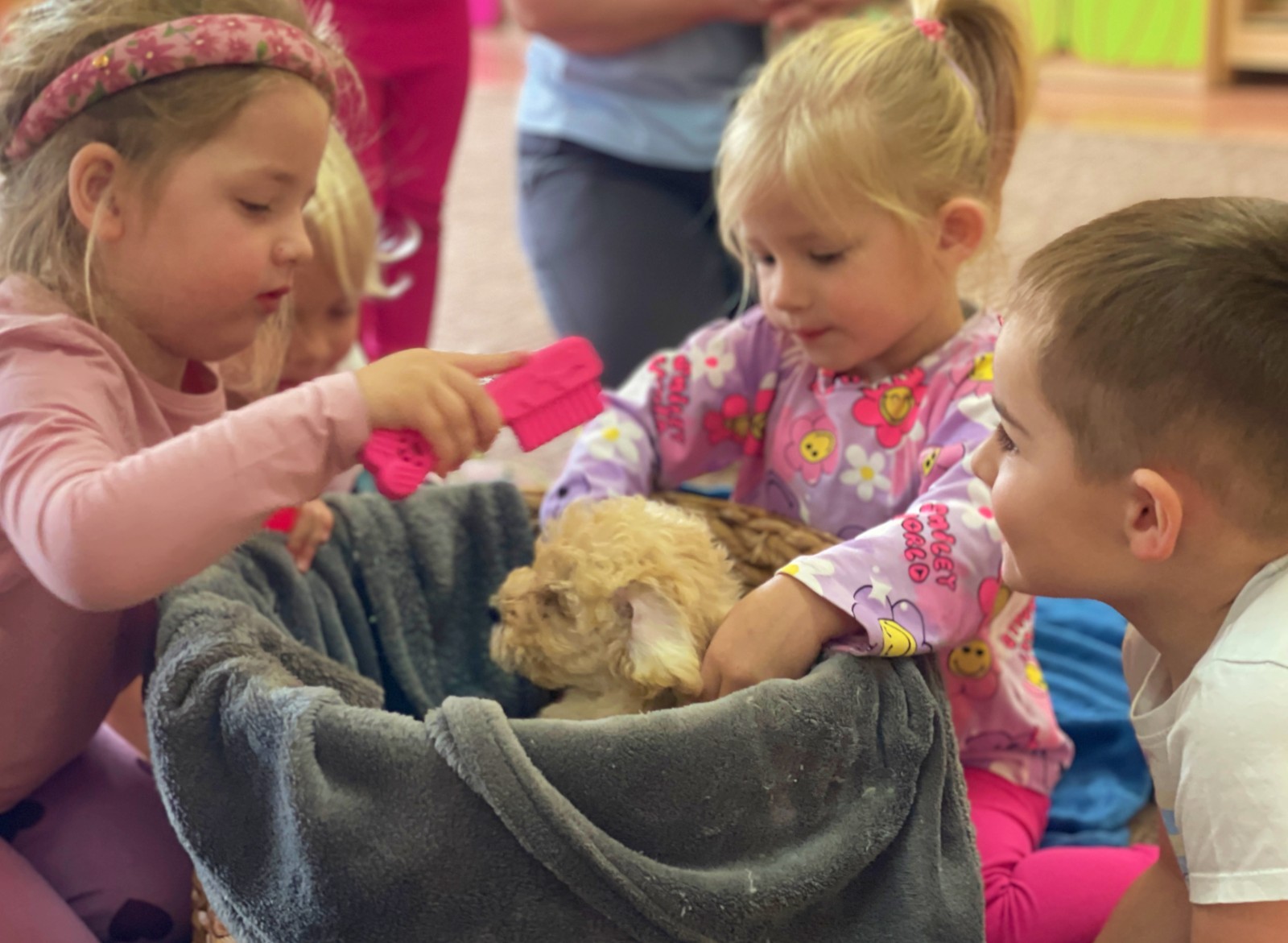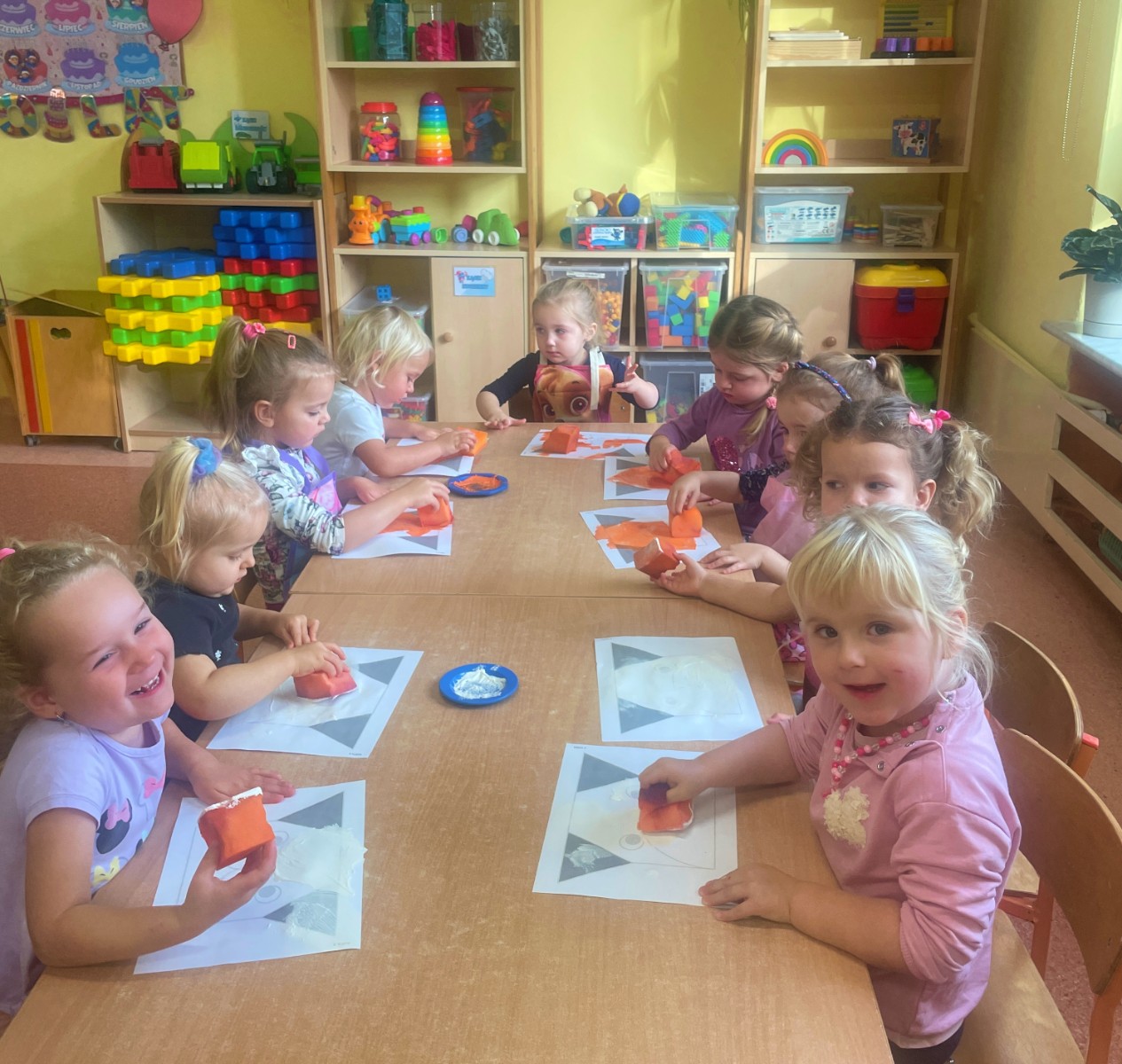 Dzieci z wielkim zaangażowaniem dzieliły się swoimi doświadczeniami i z dumą opowiadały o tym, jak pomagają w opiece nad zwierzątkami. Smerfy obejrzały obrazki przedstawiające różne zwierzęta domowe oraz dowiedziały się, że każde z nich potrzebuje jedzenia, wody, zabawy a przede wszystkim dużo miłości! Dzieci rozpoznawały zwierzęta po ich odgłosach; przy tym dużo śmiechu, zwłaszcza gdy próbowały naśladować zwierzątka. Każdy przedszkolak wykonał swoją pracę plastyczną: pieska i domek dla Pupila. Prace zostały wywieszone w holu i stworzyły piękną galerię „Smerfowych Pupili”. Na zakończenie wielką radość sprawiły dzieciom szczeniaczki, które odwiedziły salę Smerfów. Celem przedsięwzięcia było uświadomienie najmłodszym, że zwierzęta to nasi przyjaciele o których trzeba dbać każdego dnia. Dzięki takim doświadczeniom Smerfy dowiedziały się, jak ważna jest empatia wobec zwierząt, a zdobyta wiedza z pewnością pomoże im w codziennym życiu i wychowywaniu się w duchu odpowiedzialności.
