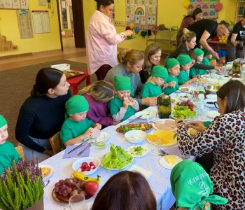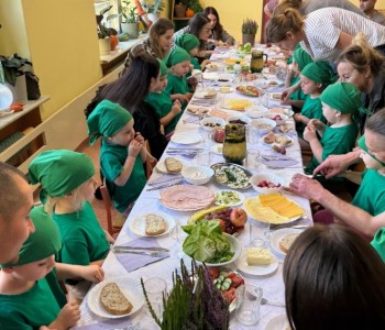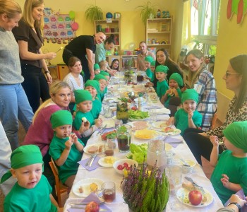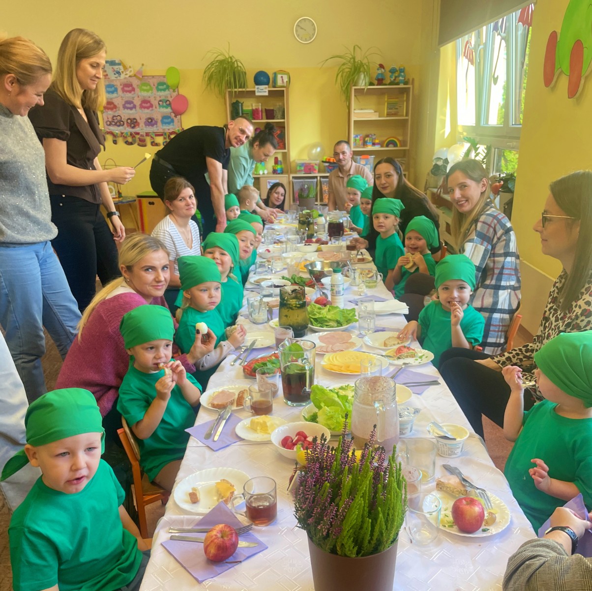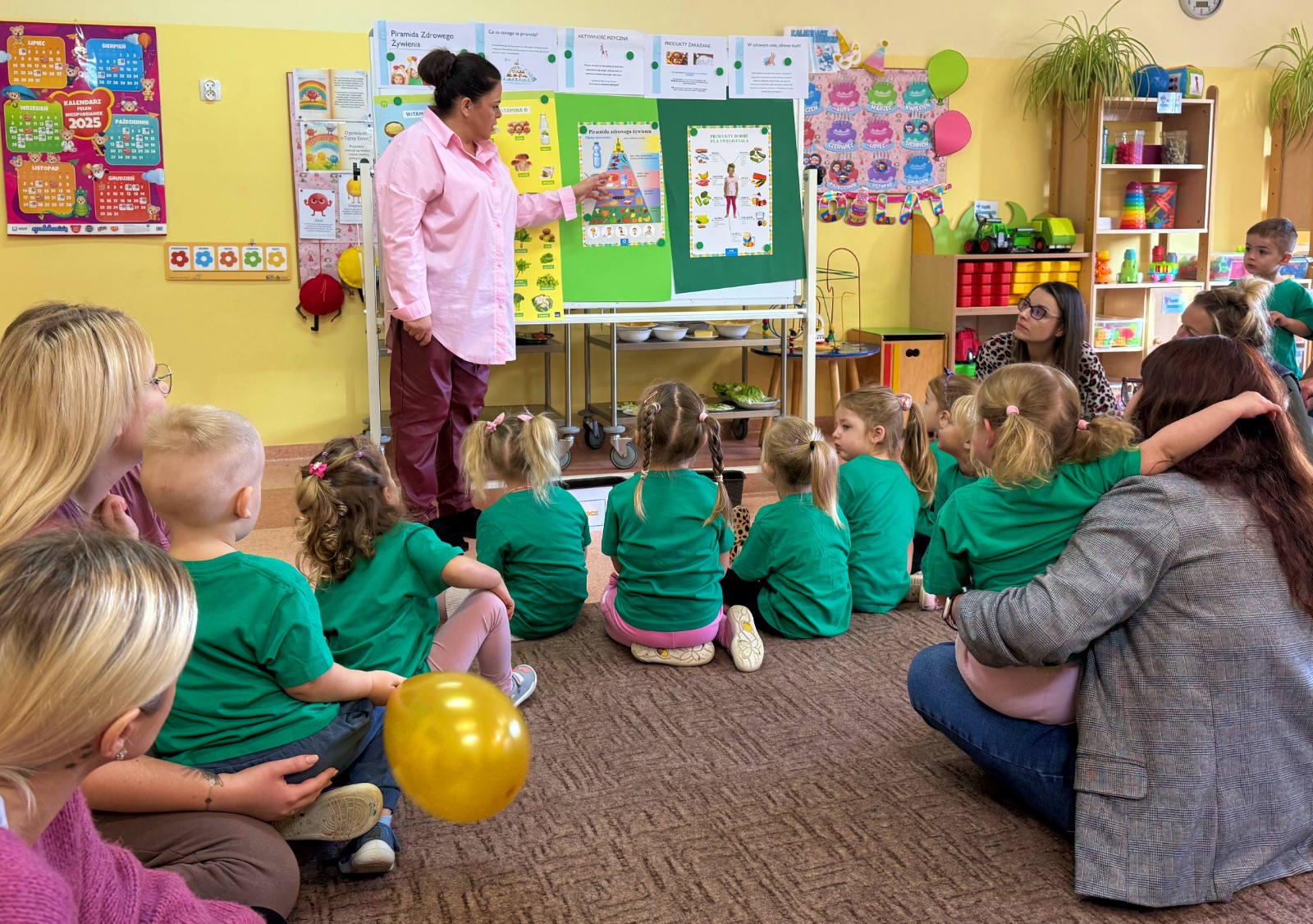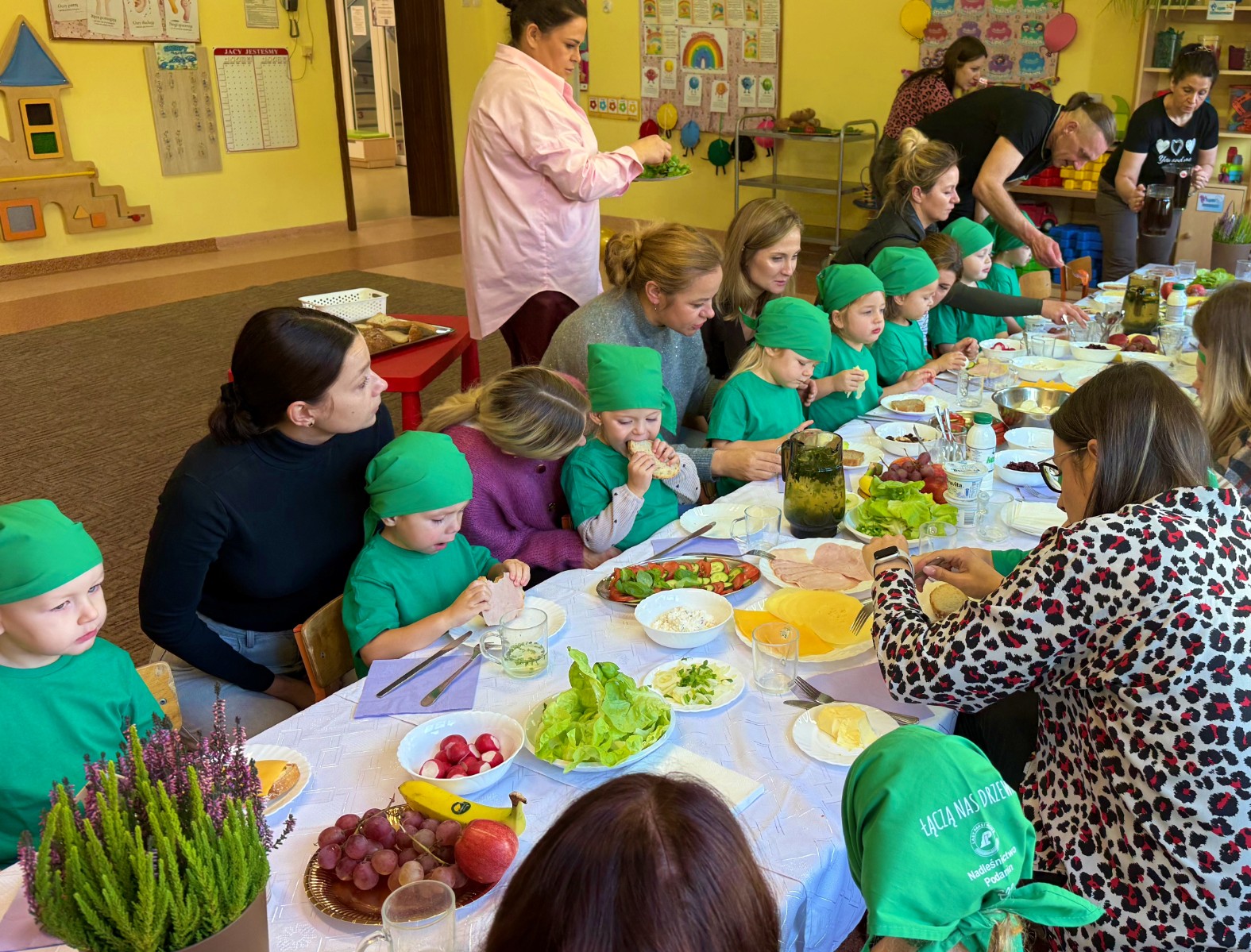 Przedszkolaki poznały piramidę zdrowia, która w ciekawy sposób pokazała, jak powinien wyglądać zbilansowany jadłospis. Dzieci z zainteresowaniem wskazywały produkty, które warto jeść codziennie oraz które należy spożywać z umiarem. Podczas zajęć nie zabrakło również zabaw ruchowo – muzycznych, które podkreślały znaczenie aktywności fizycznej. Na zakończenie odbyły się wspólne warsztaty praktyczne. Przedszkolaki przy współpracy z rodzicami przygotowały kolorowe i zdrowe śniadanie z wykorzystaniem świeżych warzyw, owoców, nabiału, bakalii oraz pełnoziarnistego pieczywa. Była to doskonała okazja do rozmowy o wartościach odżywczych poszczególnych produktów i zasadach komponowania pełnowartościowego posiłku. Wspólne przygotowywanie i degustacja śniadania dostarczyły wszystkim wiele radości, a rodzice mogli obserwować, jak dzieci funkcjonują w grupie. Zajęcia otwarte były nie tylko wspaniałą zabawą, ale także ważną lekcją zdrowego stylu życia. „Smerfy” przekonały się, że zdrowe śniadanie i ruch to prawdziwe źródło energii – przecież „Śniadanie daje moc!”