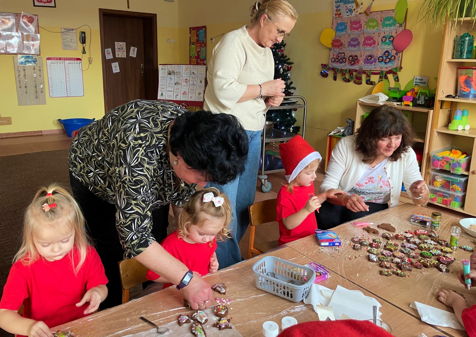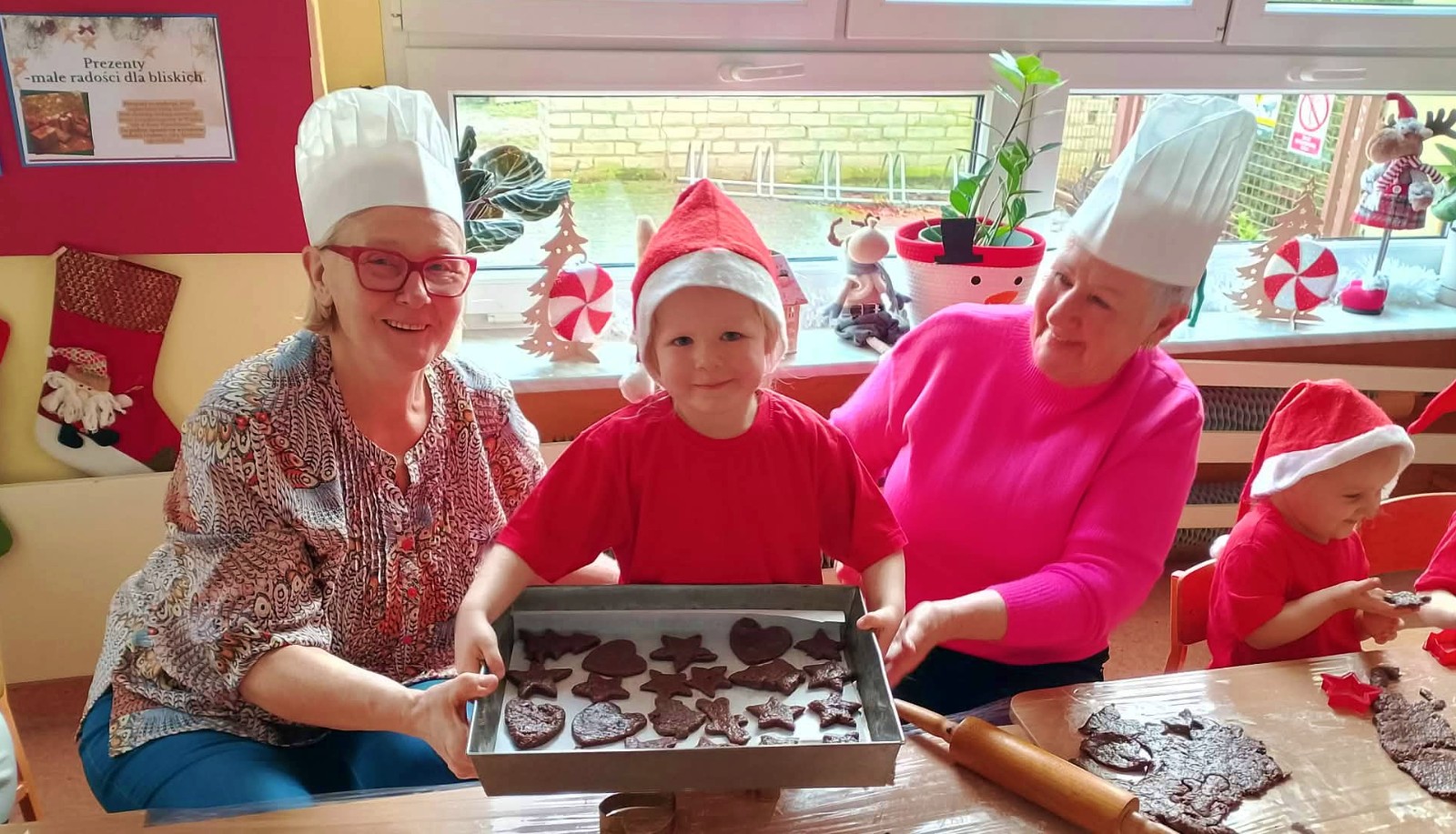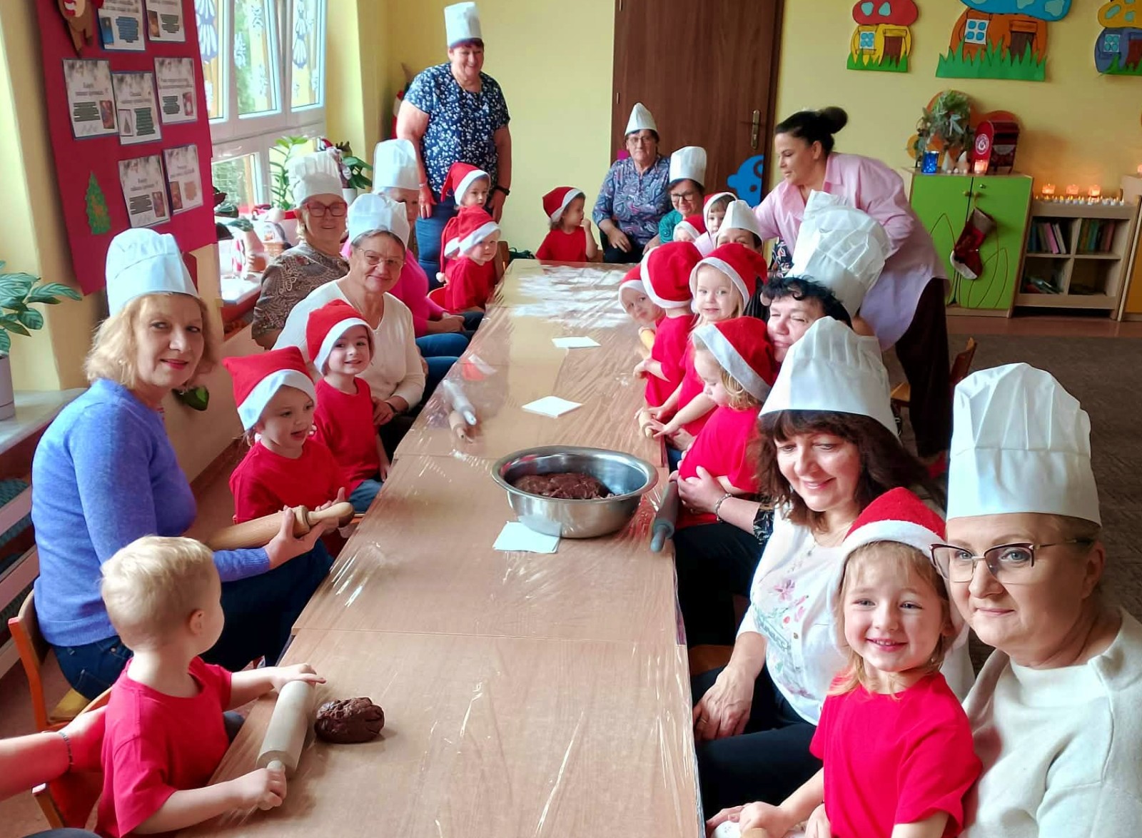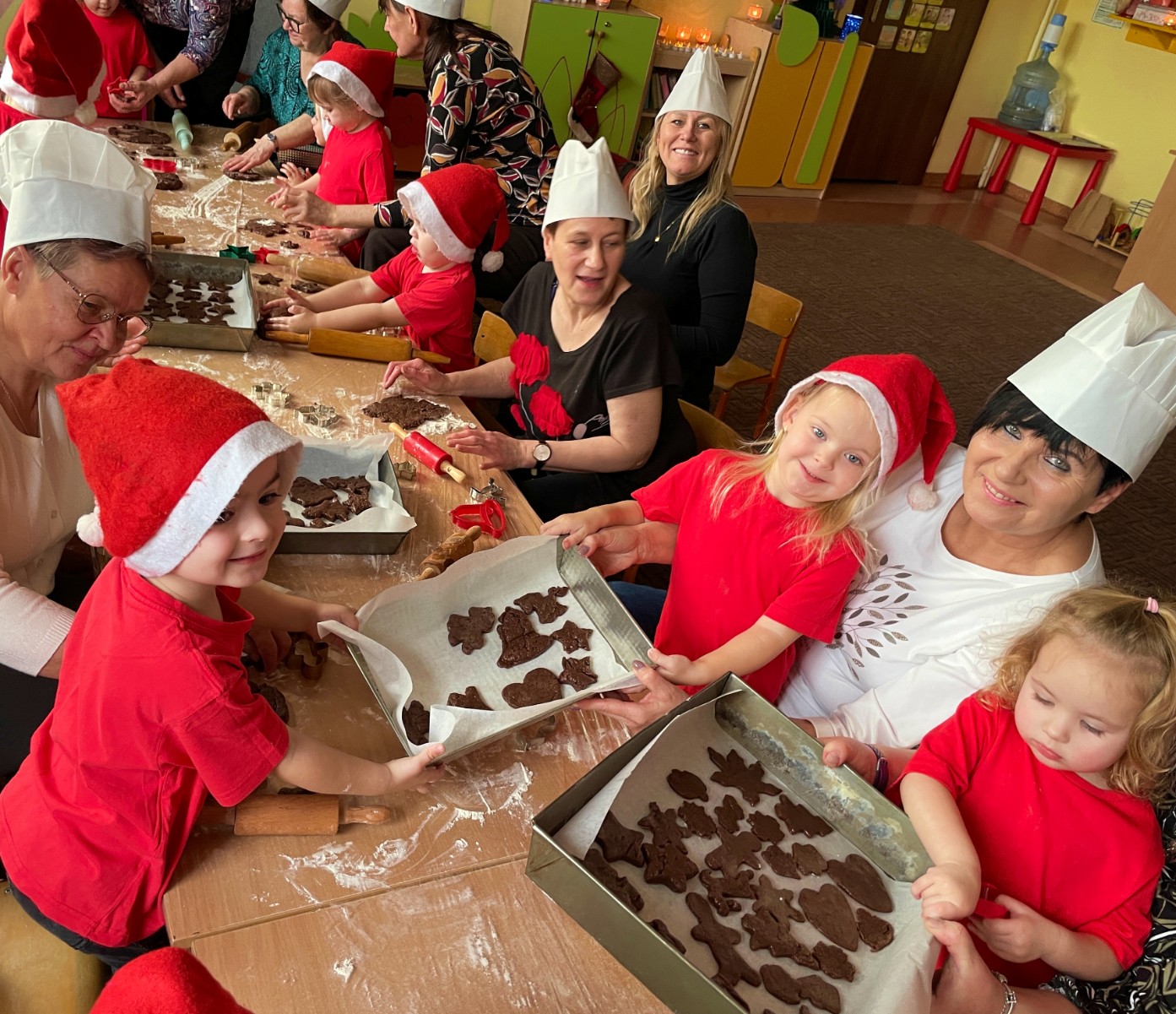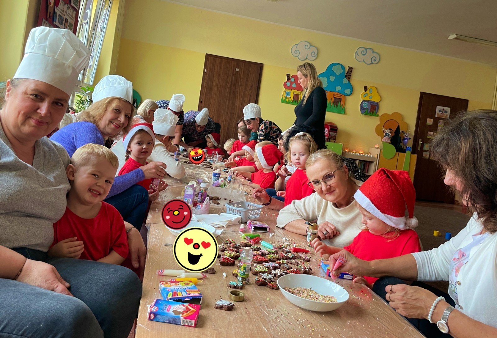 Kiedy najbliżsi przekroczyli próg sali, poczuć można było, jak unosi się w powietrzu ciepło, dobroć i świąteczna magia. Sala przedszkolna zamieniła się w pracownię Elfów. Ciasto mięciutko uginało się pod wałkami, foremki odbijały świąteczne kształty, a lukier połyskiwał jak śnieg w świetle lampek choinkowych. Wspólne pieczenie stało się nie tylko zabawą, lecz także piękną lekcją miłości, tradycji i bycia razem. Gdy pierwsze pierniczki wyszły z piekarnika, ich zapach otulił wszystkich jak świąteczna bajka. A w sercach dzieci oraz najbliższych zapalił się ciepły, grudniowy płomyk – ten, który mówi, że magia świąt jest wszędzie tam, gdzie spotykają się bliskość i uśmiech. Spotkanie było doskonałą okazją do budowania więzi międzypokoleniowych. Panowała ciepła, rodzinna atmosfera, wypełniona śmiechem, rozmowami i zapachem korzennych przypraw. Ten magiczny dzień można uznać za jeden z najpiękniejszych w grudniu.