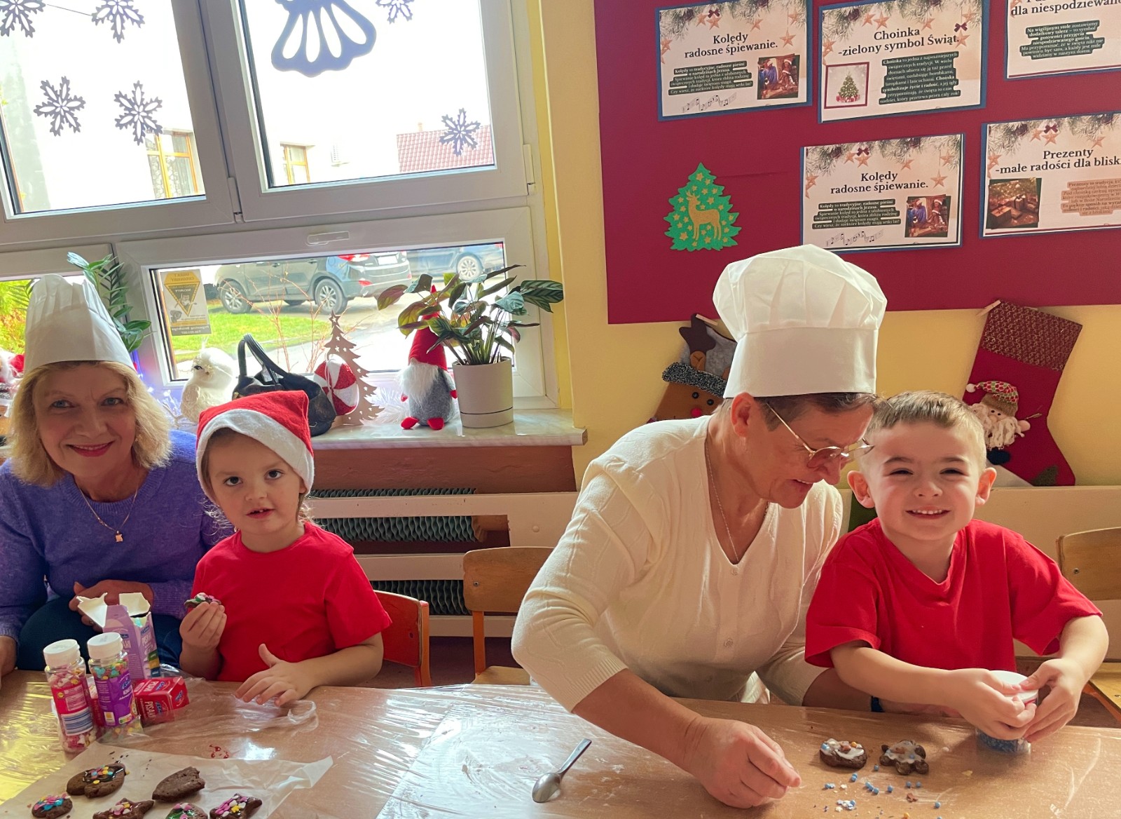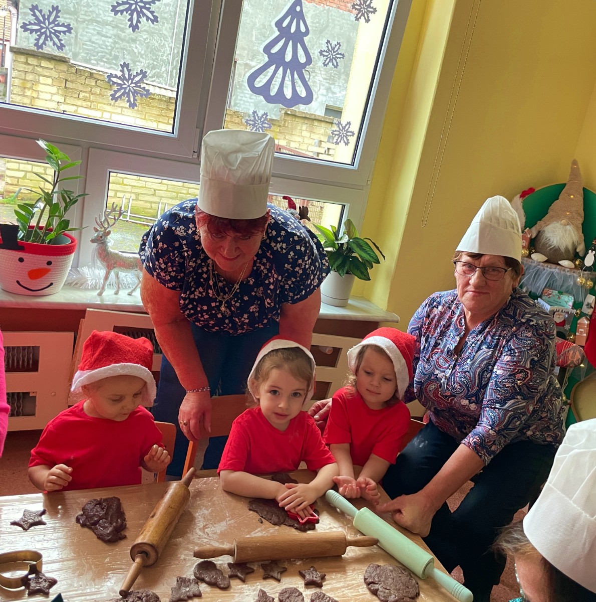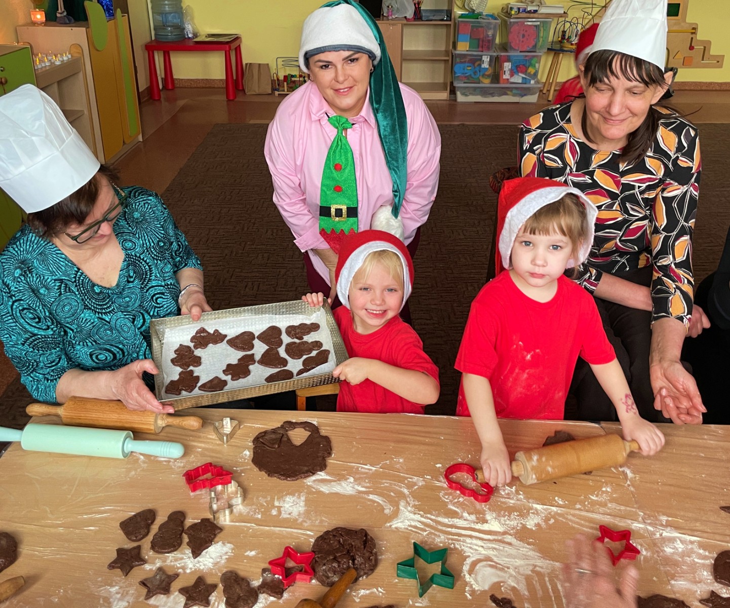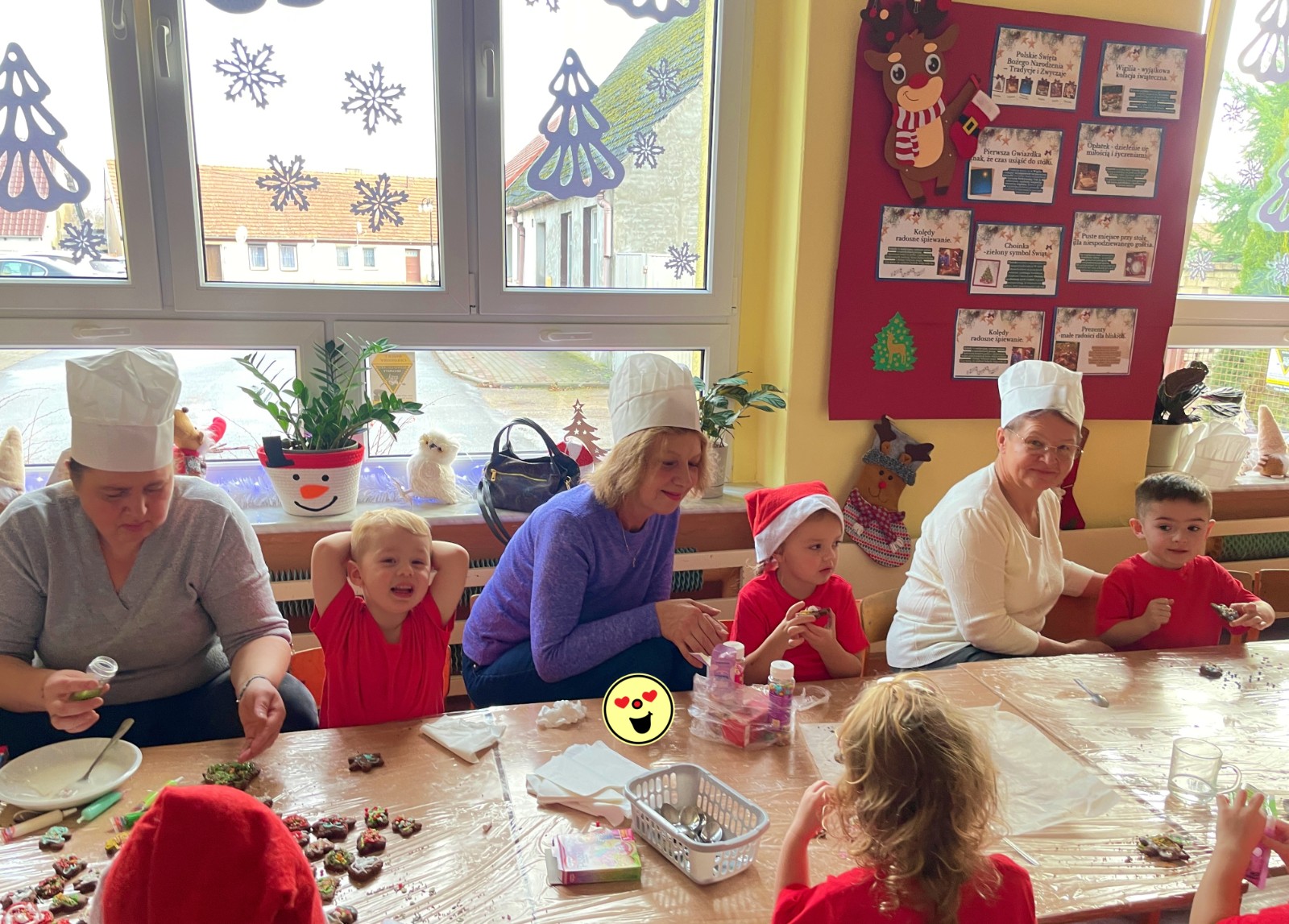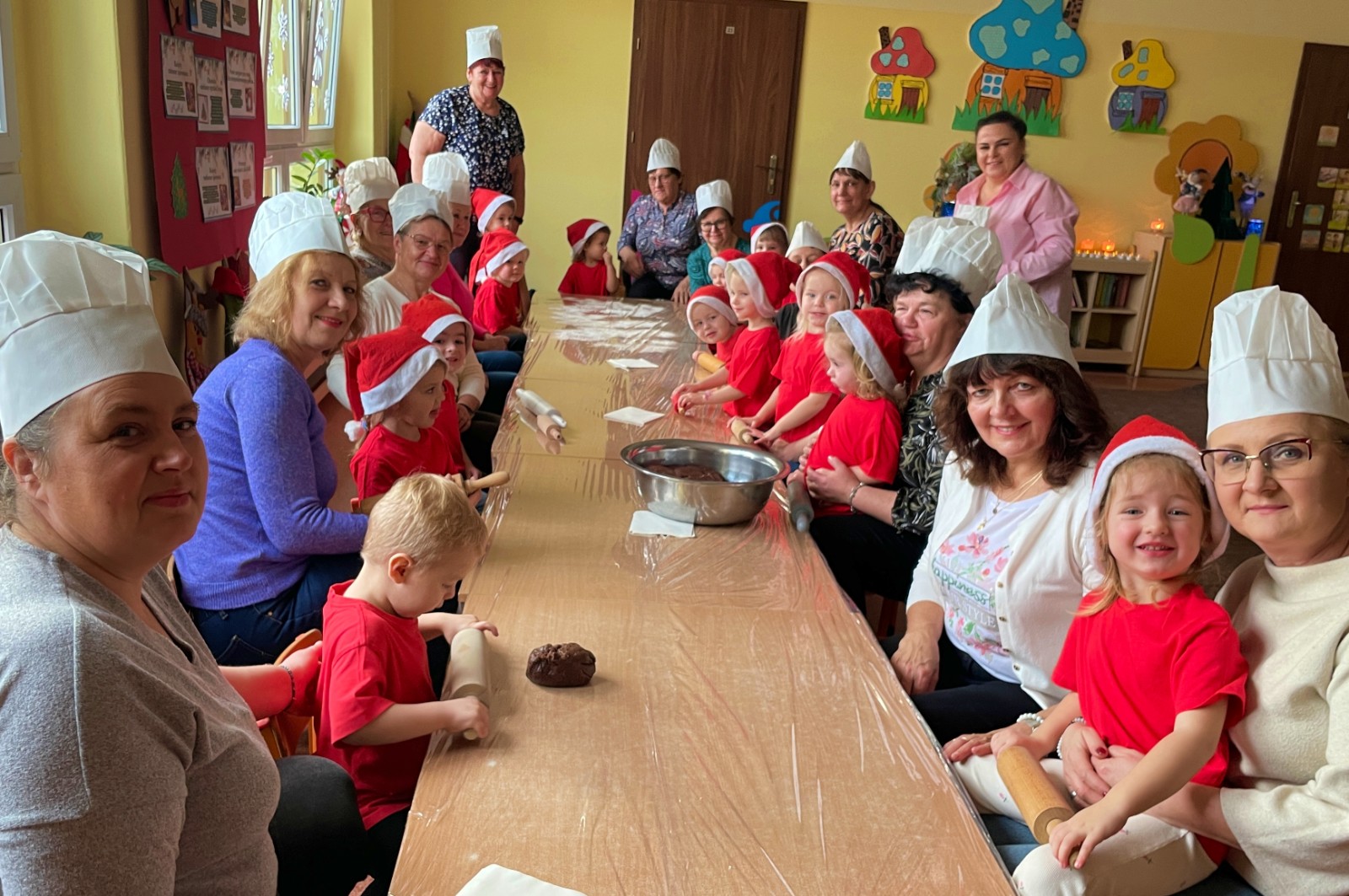 Kiedy najbliżsi przekroczyli próg sali, poczuć można było, jak unosi się w powietrzu ciepło, dobroć i świąteczna magia. Sala przedszkolna zamieniła się w pracownię Elfów. Ciasto mięciutko uginało się pod wałkami, foremki odbijały świąteczne kształty, a lukier połyskiwał jak śnieg w świetle lampek choinkowych. Wspólne pieczenie stało się nie tylko zabawą, lecz także piękną lekcją miłości, tradycji i bycia razem. Gdy pierwsze pierniczki wyszły z piekarnika, ich zapach otulił wszystkich jak świąteczna bajka. A w sercach dzieci oraz najbliższych zapalił się ciepły, grudniowy płomyk – ten, który mówi, że magia świąt jest wszędzie tam, gdzie spotykają się bliskość i uśmiech. Spotkanie było doskonałą okazją do budowania więzi międzypokoleniowych. Panowała ciepła, rodzinna atmosfera, wypełniona śmiechem, rozmowami i zapachem korzennych przypraw. Ten magiczny dzień można uznać za jeden z najpiękniejszych w grudniu.