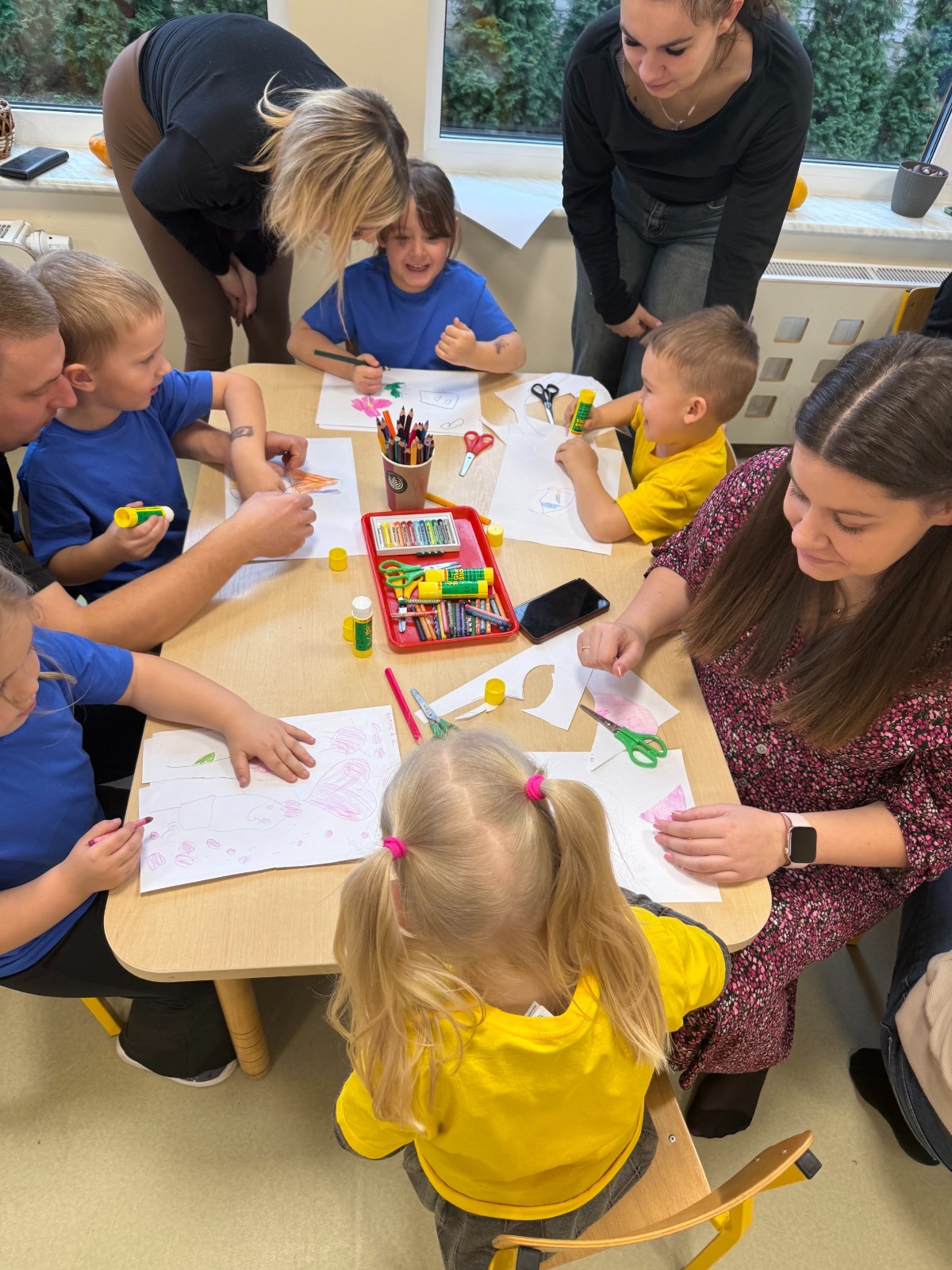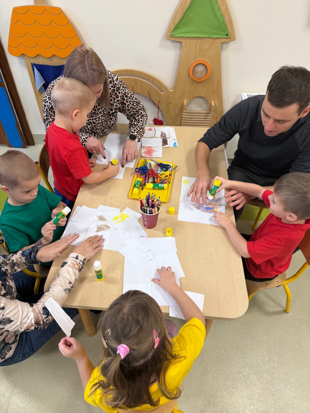 Bohaterem wszystkich zabaw tego dnia była „kolorowa kredka”. Najmłodsi mieli do odgadnięcia zagadkę, której rozwiązanie rozpoczęło serię aktywności edukacyjnych i plastycznych. Proponowane zajęcia rozwijały kreatywność, umiejętności manualne, koordynację wzrokowo- słuchowo-ruchową oraz wiedzę o kolorach. Nie zabrakło zabaw konstrukcyjnych, doskonalących liczenie, porównywanie wielkości czy rozwijających poczucie rytmu. Na zakończenie przedszkolaki zaprosiły swoich rodziców do wspólnego tańca, który stał się formą integracji, zbudował atmosferę zaufania i partnerstwa. Było bardzo miło i wesoło. Dziękujemy wszystkim za przybycie i wspólna zabawę!